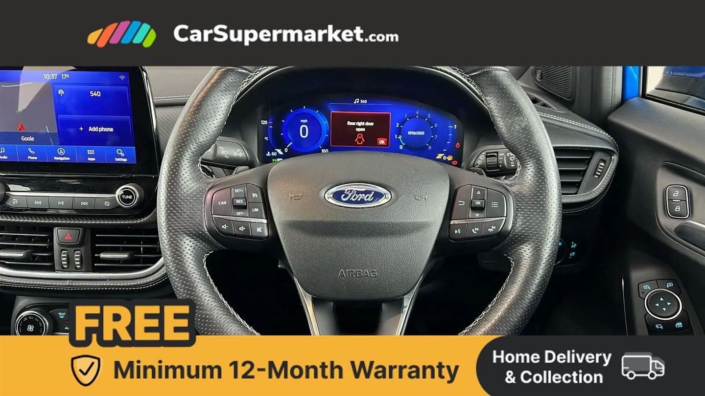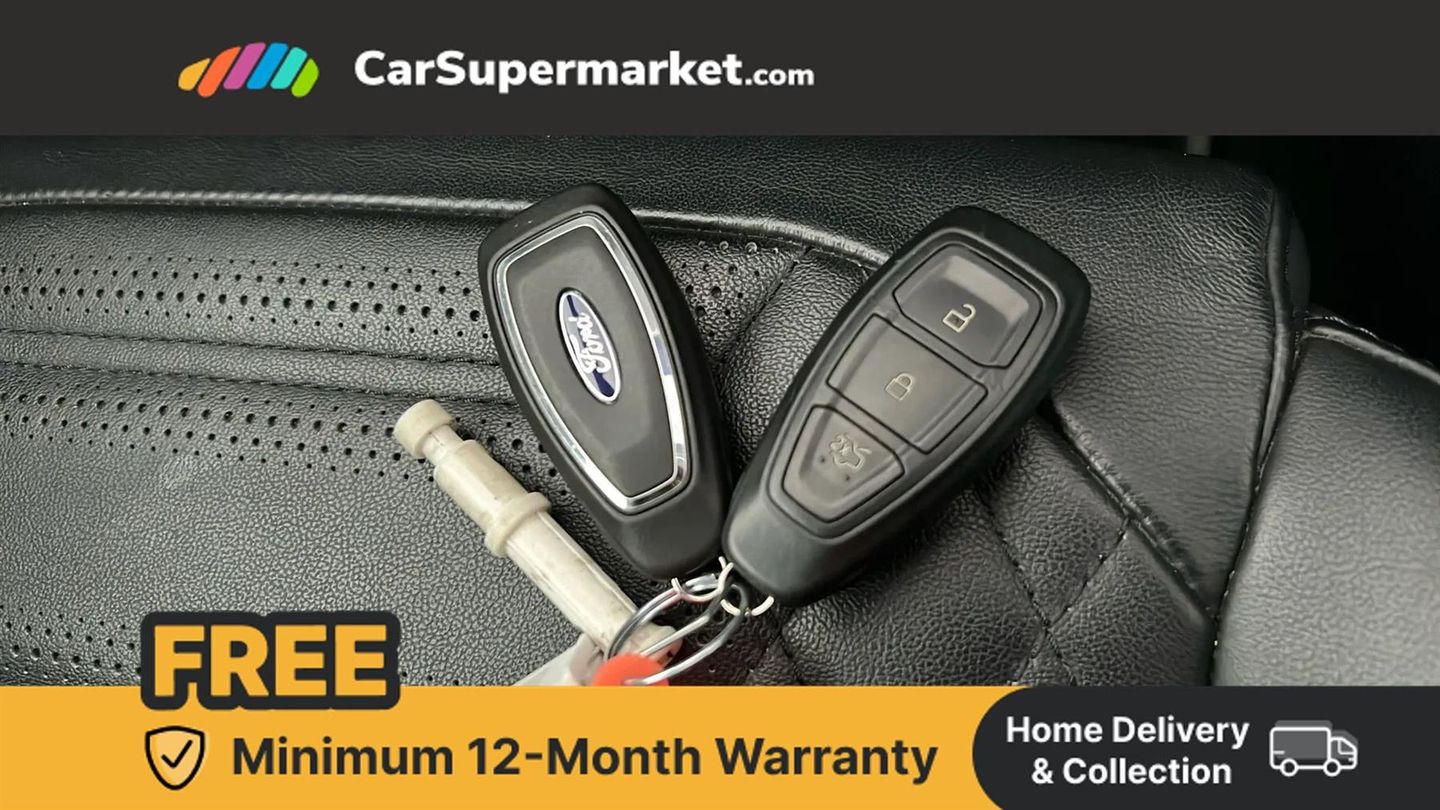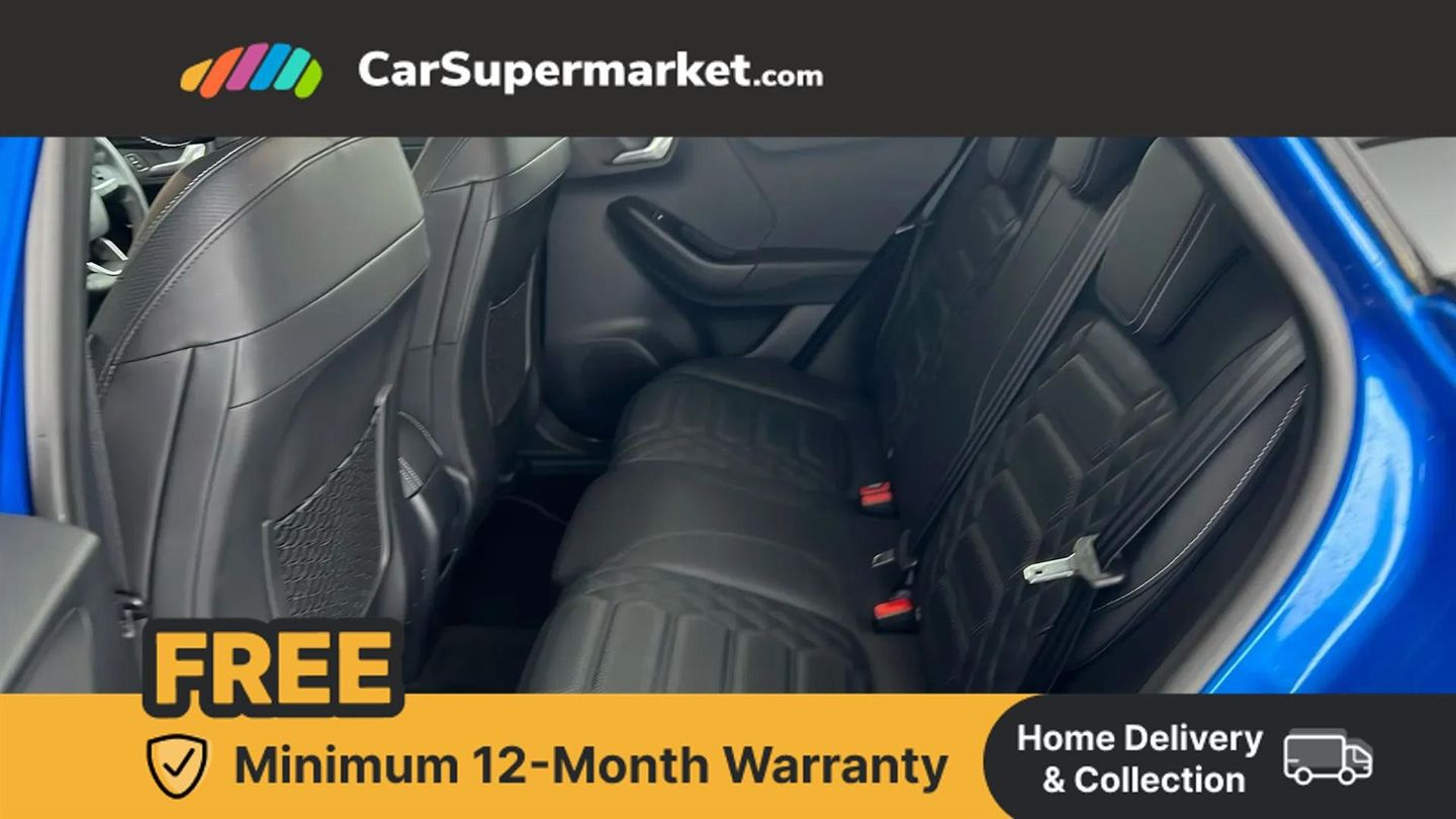 Ford easy fuel,Full digital 12.3" instrument cluster,Lane keeping aid with lane departure warning,Power assist steering,Rear parking sensor,Selectable drive modes(Normal, sport, Eco, trail, slippery),Wireless charging pad,Automatic headlights with rain sensing wipers and auto high beam,Body coloured door mirrors,Bodyside chrome styling,Fixed LED headlamps,Front fog lights with cornering lights and LED rear lamps,Gloss black with chrome elements on front and rear bumpers,High chrome waistline,LED daytime running lights,Power foldable heated door mirrors with puddle lamps,Privacy glass to side rear windows and tailgate glass,Quickclear heated windscreen,Rear wiper,ST-Line body kit with large rear spoiler wth sports suspension,Unique Vignale style upper grille and surround,Centre console with armrest and stowage,Ford megabox extended bootspace,Front and rear head restraints,Heated front seats,Heated steering wheel,Lumbar massage for driver and passenger,Manual air conditioning,Perforated leather flat bottomed steering wheel with metal grey stitching,Premium leather upholstery,Premium sensico wrapped instrument cluster,B&O Premium Audio system + Ford SYNC 3 navigation pack - Puma,Comfort pack - Puma,3 rear seatbelts,Electronic stability control (ESC) and hill start assist,Pre-collision assist with autonomous emergency braking, pedestrian/cyclist detection & post-collision braking,Tyre pressure monitoring system (TPMS),Thatcham alarm,Carbon look interior deco spears,Desert Island Blue,Premium Leather - Black with Metal Grey Stitching