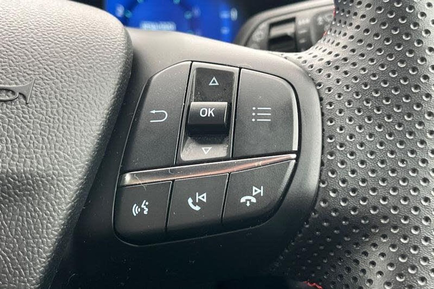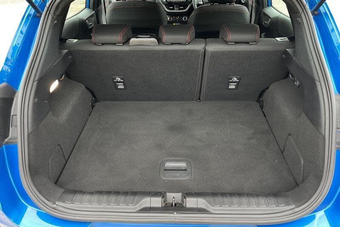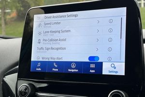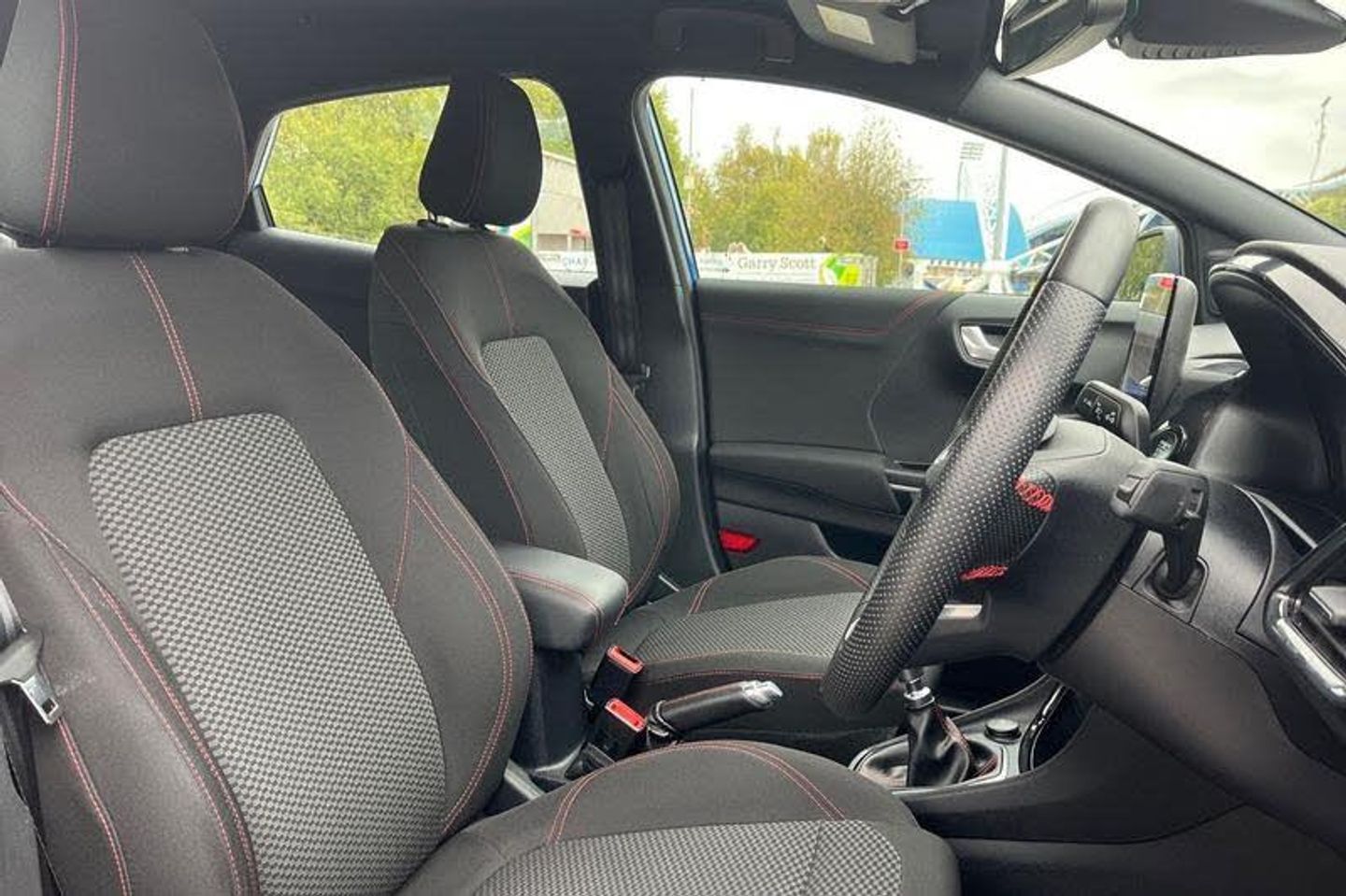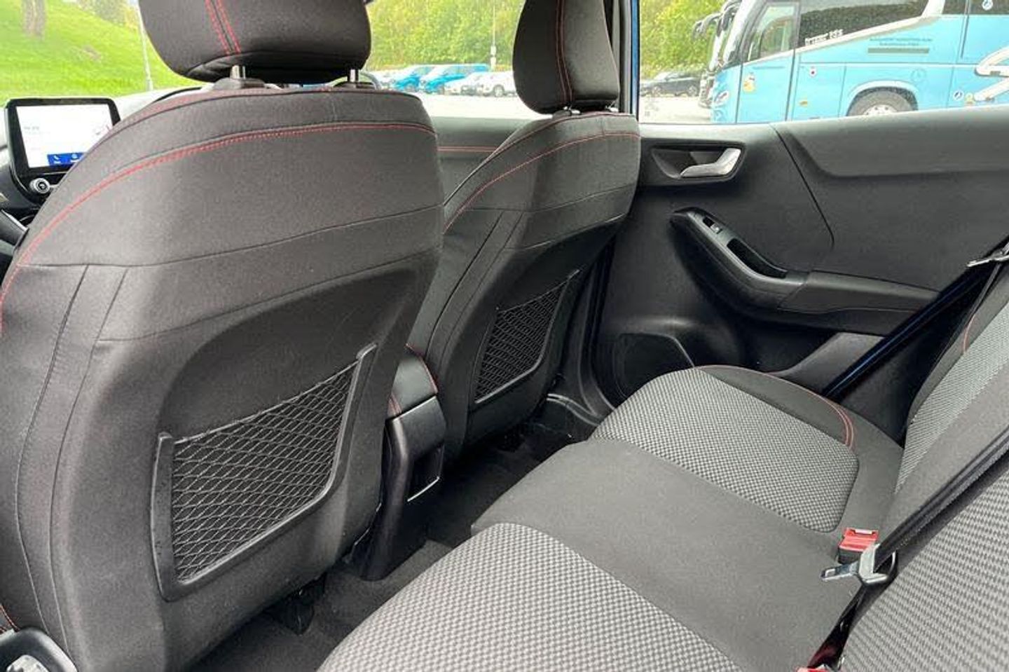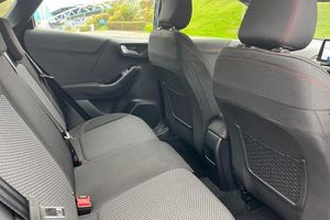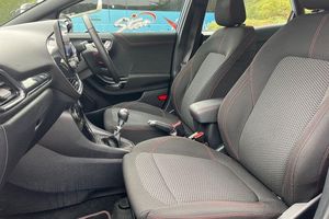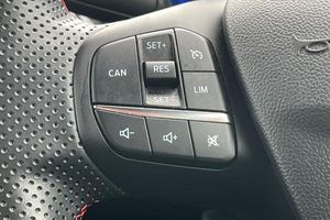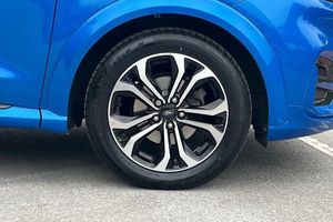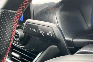 Driver impairment monitor, Emergency call service, Ford easy fuel, Full digital 12.3 instrument cluster, Lane keeping aid with lane departure warning, Power assist steering, Power start button, Rear parking sensor, Selectable drive modes(Normal, sport, Eco, trail, slippery), Speed sign recognition, Automatic headlights with auto high beam, Automatic rain sensing wipers, LED rear lamps, Power foldable heated door mirrors with puddle lamps, Projector headlamps with LED day time running lights and front fog lamps, Quickclear heated windscreen, Rear side wing doors, Rear wiper, ST-Line body styling kit with unique grille, Third brake light, 3 seat bench in 2nd row, Centre console with armrest and stowage, Ford megabox extended bootspace, Front and rear head restraints, Front floor mats, Manual 2 way passenger seat adjustment, Manual 4 way driver seat adjust with lumbar adjustment, Single front passenger seat, ST- Line cloth trim with red stitching, ST-Line flat bottomed sensico leather steering wheel with leather handbrake and aluminium gear knob, 3 rear seatbelts, Child safety lock, Electronic stability control (ESC) and hill start assist, Pedestrian/cyclist detection & post-collision braking, Pre collision assist system, Tyre pressure monitoring system (TPMS)