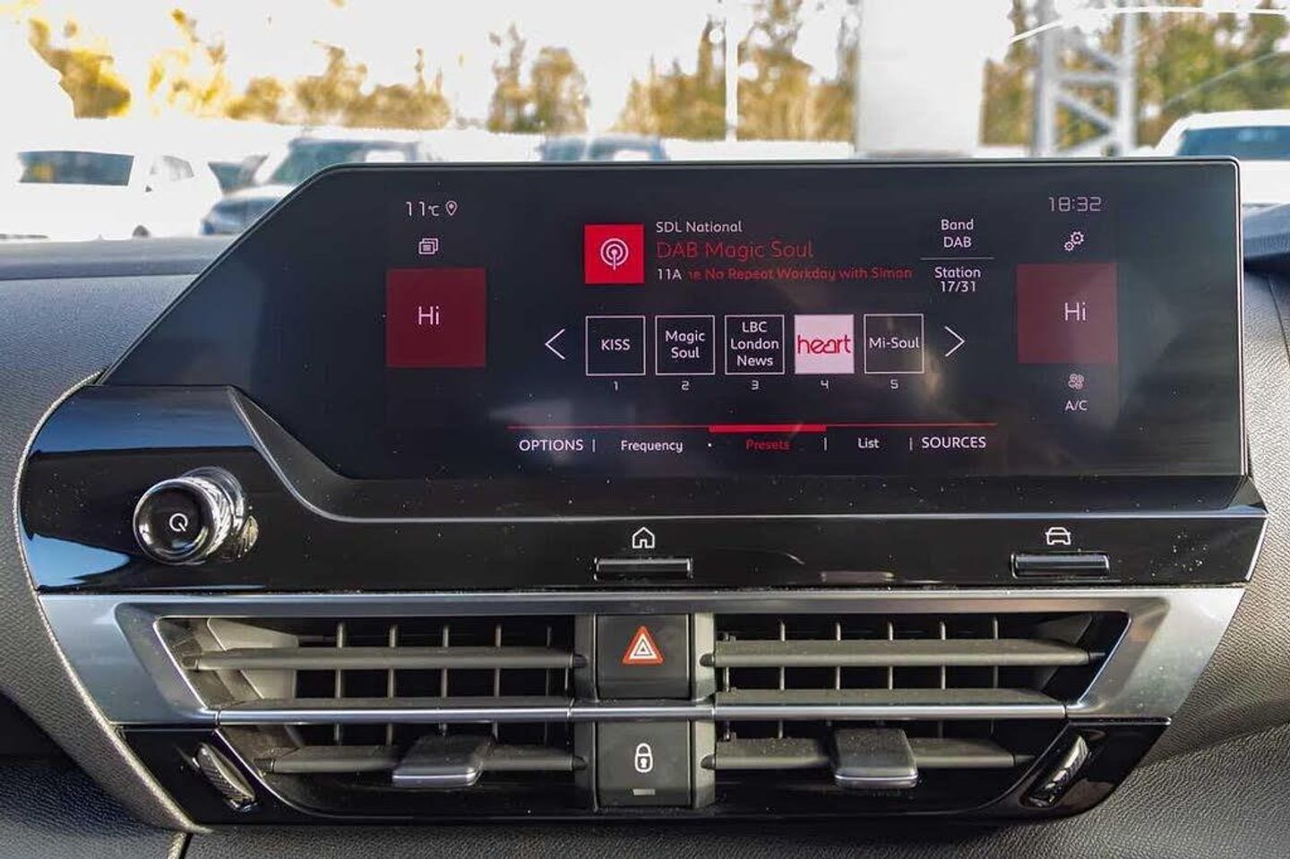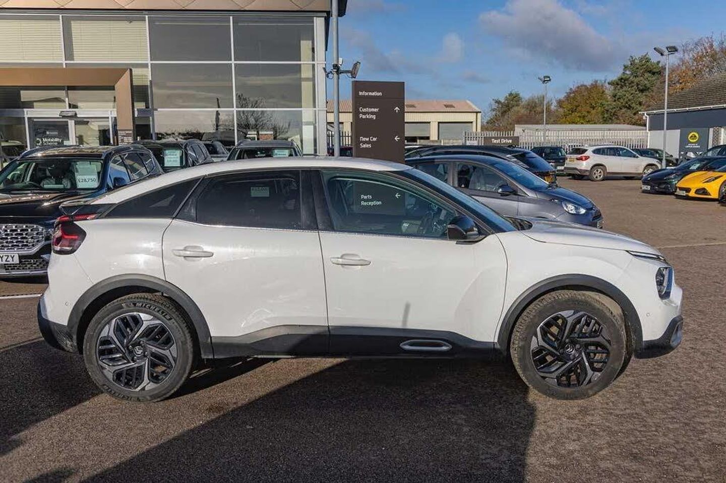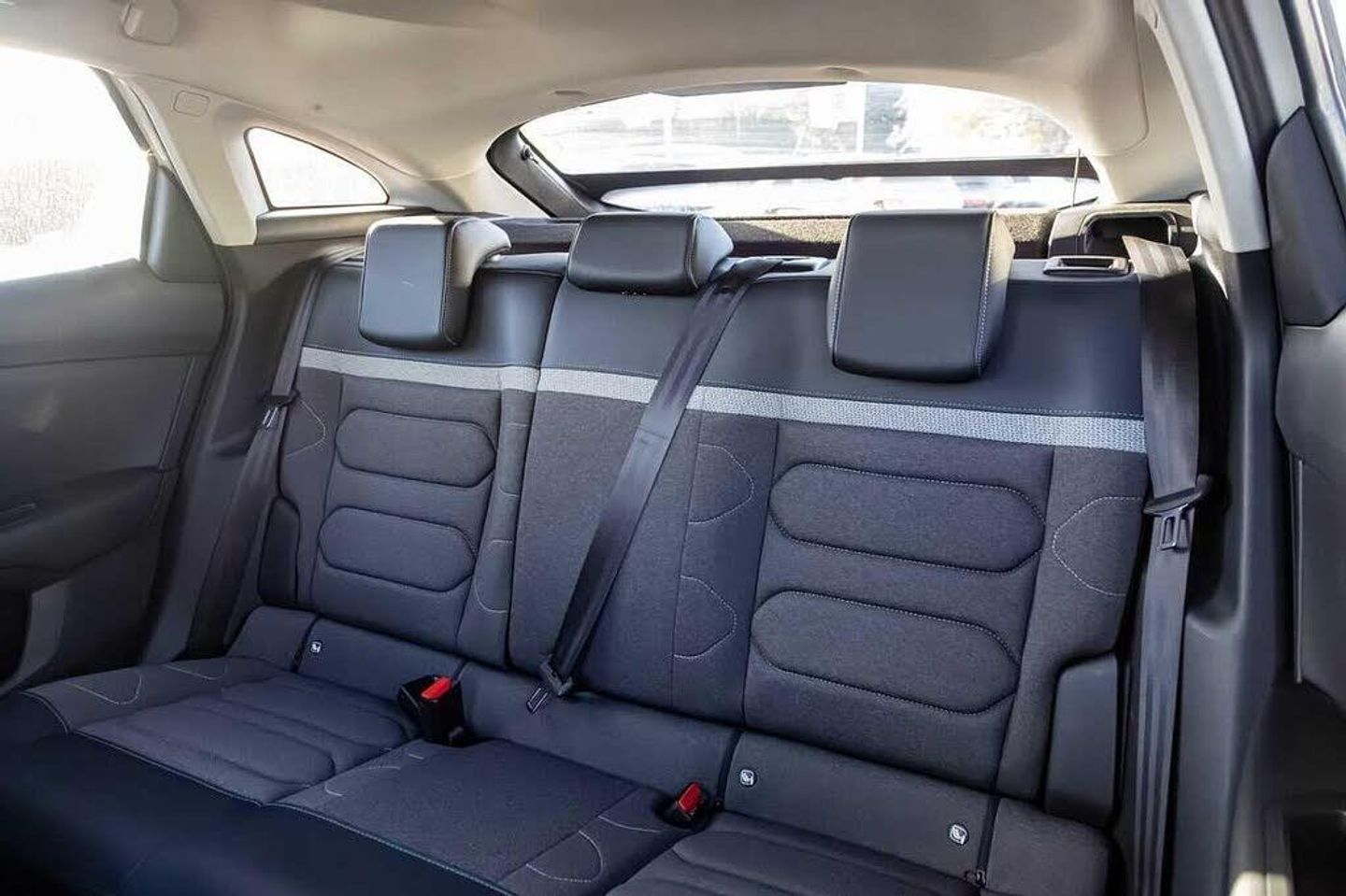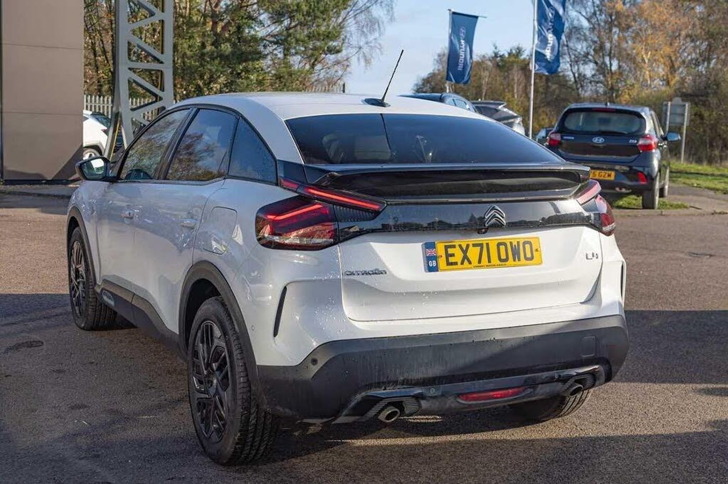 Dark tinted rear windows and side windows with chrome detail, Front and rear electric windows, Rain sensing automatic front windscreen wipers, Suspension with progressive hydraulic cushions - double hydraulic stops on front suspension and single on rear suspension, Body colour bumpers, Body colour door handles, Gloss black rear skirt, Intelligent beam headlights, LED daytime running lights in V signature, LED front fog lamps with static cornering function, LED front headlamps, Welcome and goodbye lighting, ABS, Electric parking brake, ESP, Hill start assist, Post collision safety brake, Active blind spot detection, Citroen connect box emergency and assistance system, Cruise control + speed limiter, Electronic Power Steering (EPS), In-crash braking, Body colour painted external rear view mirrors, Electrically heated, folding and adjustable external rear view mirrors with courtesy lighting, Electrochrome interior rear-view mirror with automatic day-night switching, 3x3 point rear seatbelts, Driver and front passenger airbags, Front seatbelt pretensioners, Manual child lock in second row, Manual deactivation of front passenger airbag, Row 1 and 2 curtain airbags, Row 1 side thorax airbags, Seatbelt unfastened on the move warning, Tyre underinflation detection, Apple car play and Android auto, Voice commands, Auxiliary input socket, Bluetooth telephone and audio streaming, DAB Digital radio, 10'' high resolution touchscreen user interface, controlling media, connectivity and vehicle settings, 5.5 inch backlit full TFT driver's instrument cluster with LED ambient lighting, Citroen connect nav with speed cam and danger zones alert, Driver's head-up display, Dual zone automatic air conditioning, 12V power outlet, 1x USB Type-C socket charging & data connection and 1x USB Type-A socket in 1st row and 1x USB Type-A socket charging in 2nd row, Dashboard tray in front cabin, Deluxe leather steering wheel with two command blocks, Height and reach adjustable steering wheel, Raised centre console with armrest and two cup holders, Two position boot floor, Boot light, Front and rear LED interior lighting, Driver and passenger sunvisors with illuminated vanity mirrors, High level acoustic insulation pack - C4/C4 X/e-C4 X, Safety pack plus - C4 Shine/ Shine Plus, 3 rear headrests, Front head restraints, Height adjustable front passenger seat, Map pockets in rear of front seats, Split folding rear seats, Anti-theft alarm (volumetric protection), Immobiliser, Keyless entry and start, Remote locking with deadlocks, 18'' Bi-tone diamond-cut aeroblade alloy wheels with anti-theft locking wheel nuts, Puncture repair kit with compressor