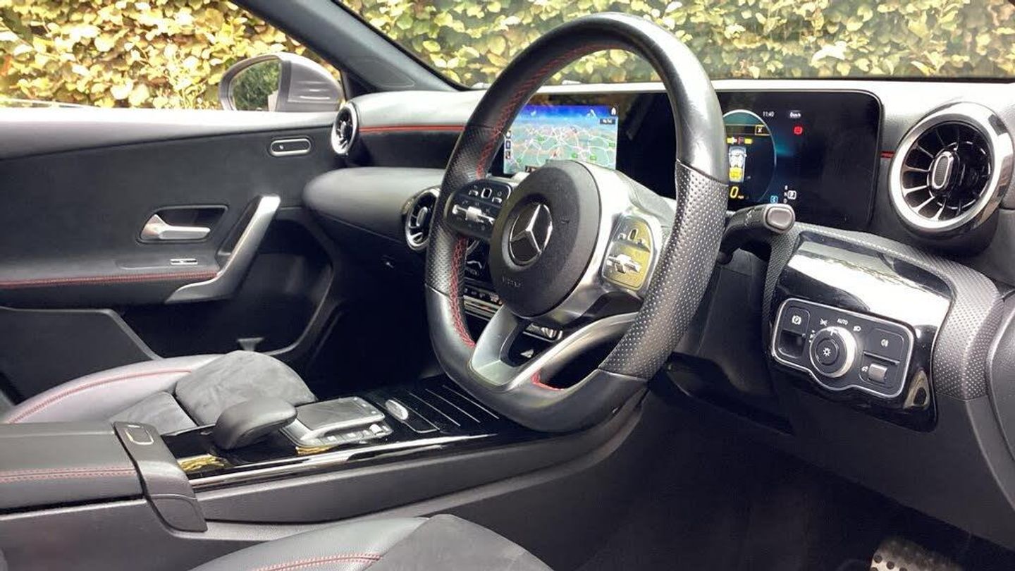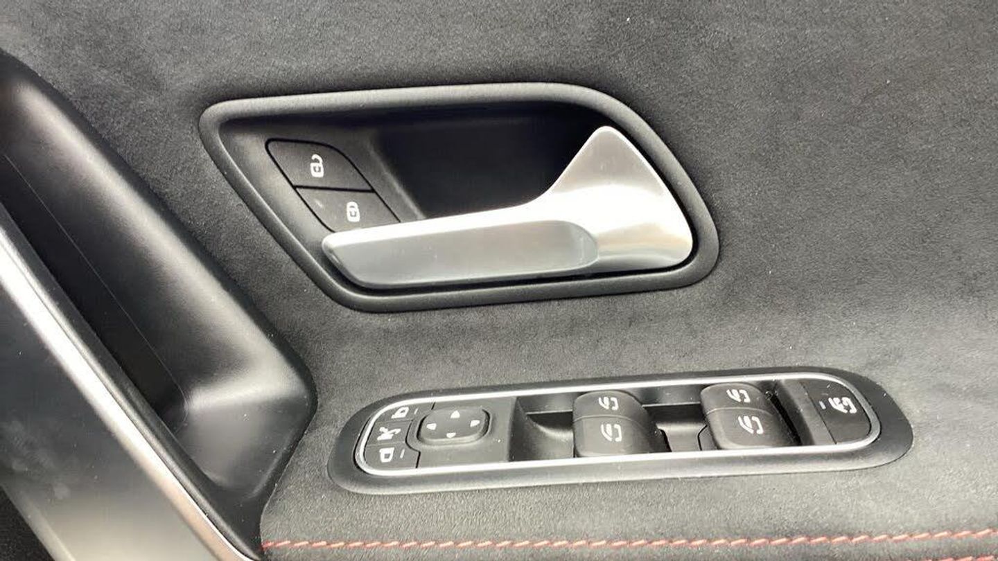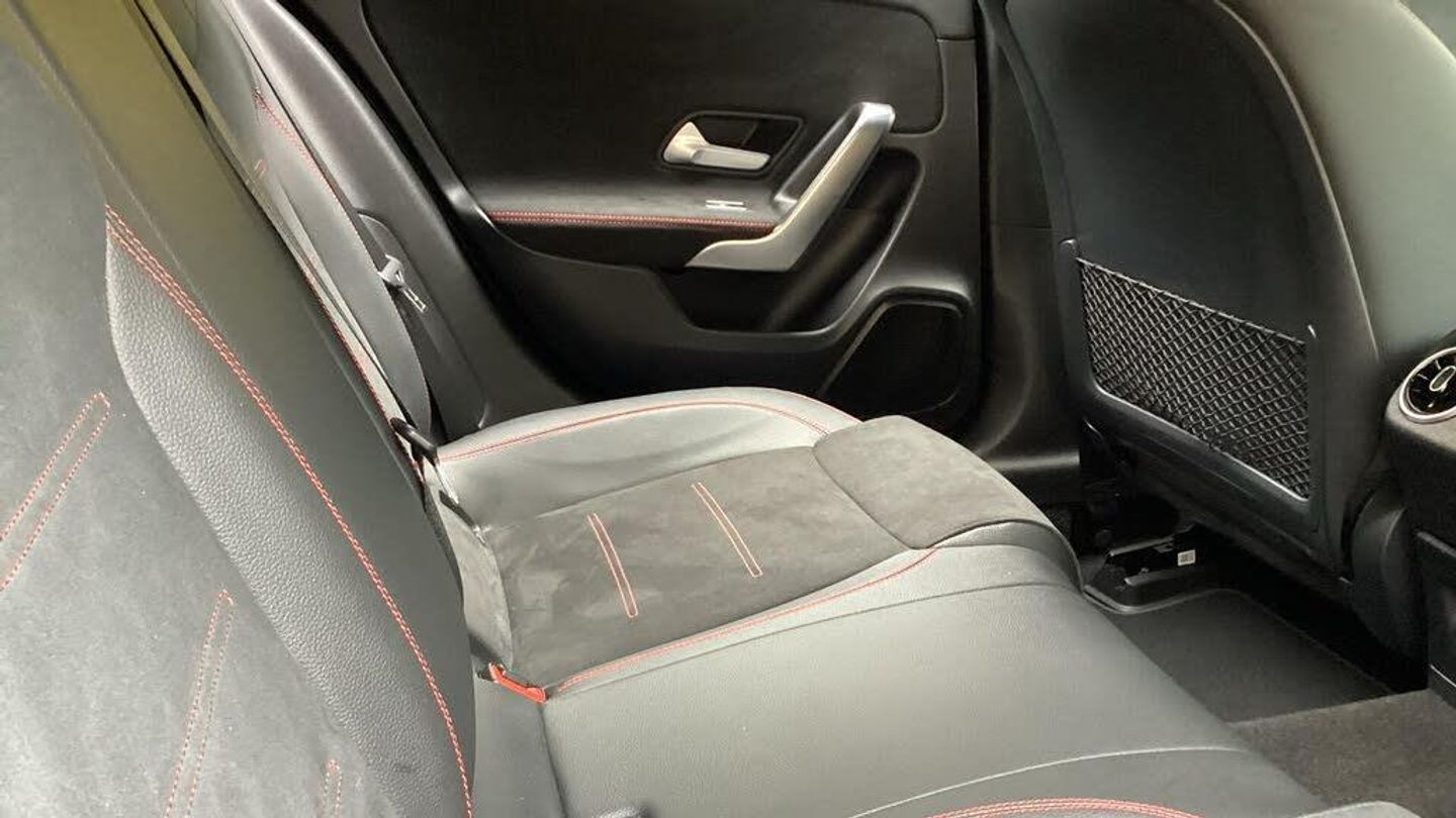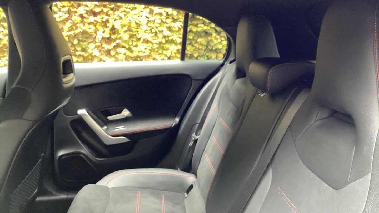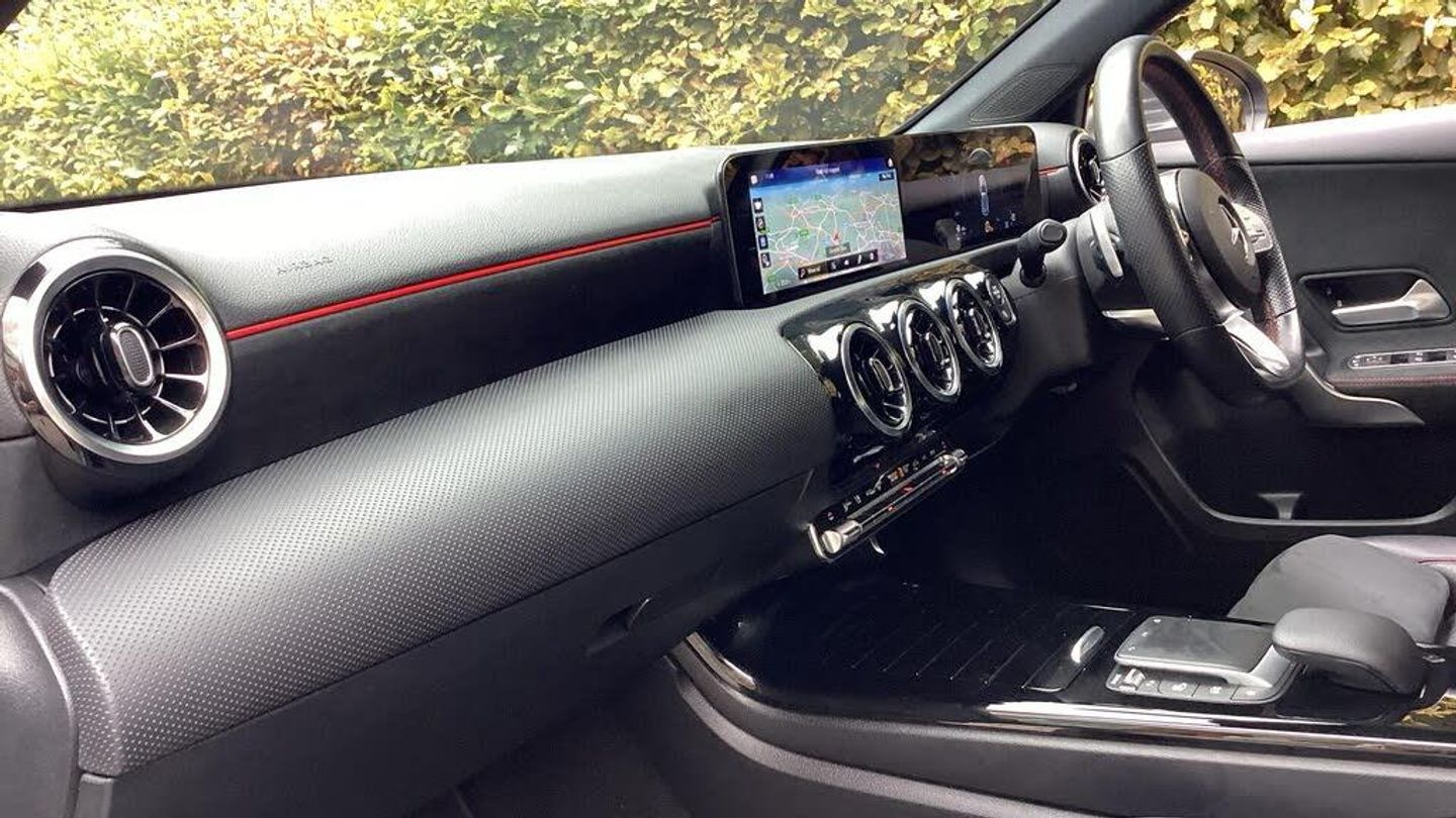 10.25'' media display, 180 degree rear view camera with parking guidelines, 7'' colour screen in instrument panel, Active parking assist with visual and audible warning of detected obstacles, Attention assist, Brake pad wear indicator warning light, Car wash mode, Cruise control + speed limiter, Direct steering, Dual bluetooth interfaces, DYNAMIC SELECT with a choice of driving modes (ECO, Comfort, Sport and Individual), ECO start/stop function, Fluid level warning indicator for fuel, oil, coolant and washer fluid, Hard-disk navigation, Hey Mercedes Voice activation, Lamp failure indicator, Mercedes me connect including emergency call system, accident recovery, breakdown and maintenance management, Mercedes me remote services, Outside temperature gauge, Owners manual in English, Pre-installation for private car sharing, Preinstallation for Mercedes Benz link, Service indicator (ASSYST), Smartphone integration with Apple CarPlay and Android auto, Speed sensitive power steering, Trip computer, Ultrasonic sensors positioned in the front and rear bumpers, Wireless charging, Lowered comfort suspension, Rear axle torsion beam, 2 USB ports (type C) in rear stowage compartment and one in front of center console, 6 speakers, DAB Digital radio, MBUX multimedia system with DAB digital radio and touchpad including satellite navigation, Mercedes-Benz sound system - 100W, 4 Electric Front and Rear windows, Adaptive brake lights, AMG bodystyling - Front apron with splitter in chrome, rear apron with chrome trim and chrome visible trim elements in tailpipe, Black weather strip, Body colour bumpers, Body colour door handles, Body colour side skirt, Body coloured door mirrors, Chrome beltline trim, Diamond radiator grille with chrome pins and silver louvre + chrome insert, Electric adjustable and heated door mirrors with integrated LED side indicators, Exhaust system - Twin visible tailpipes in polished stainless steel, Headlamp assist automatic headlamp activation, Heated glass rear windscreen + timer control, LED high performance headlamps with integrated LED daytime running lights, LED tail lamp, LED third brake light, Privacy glass, Radio aerial, Rain sensing windscreen wipers with two sensitivity settings, Rear fog lights, Rear wiper, Window line trim strip in chrome, 3 Spoke flat bottom leather multi function steering wheel with perforated leather in grip area, 40:20:40 split folding rear seats, Artico man-made leather/Microfibre Dinamica upholstery with red contrast stitching, Auto Mercedes-Benz child seat recognition sensor, Black air vents with surround in silver chrome, Black roof lining, Brushed stainless steel sports pedals with rubber studs, Controller on centre console with chrome surround, Floor mats with stitched edging and AMG lettering, Front centre armrest with storage compartment, Front door sills with Mercedes Benz lettering, Front seat backs luggage nets, Front seat cushion length adjustment, Galvanished gear shift paddles on steering wheel, Heated front seats, Height/reach adjustable steering column, Interior mirror with reading lamps in black and frameless, Manual height adjustable front seats, Rear head restraints, Seat occupancy sensor for front passenger seat, Sports seats with integrated headrests, Stowage compartment in centre console with retractable cover, Sunvisors with illuminated vanity mirrors, Touchpad on center console, Twin front cupholders, Two zone thermotronic luxury automatic climate control, Light and sight pack - A Class, Mirror package - A Class, Seat comfort pack - A Class, 3 rear 3 point seatbelts, ABS with Brake Assist, Active bonnet, Active brake assist includes forward collision warning system with autonomous braking, Adaptive brake assist with hold function and hill start assist, Black seatbelts, Childproof locks manually operated for rear doors and electrically operated for rear power windows, Crash responsive emergency lighting, Driver and passenger head and side airbags, Drivers knee airbag, D