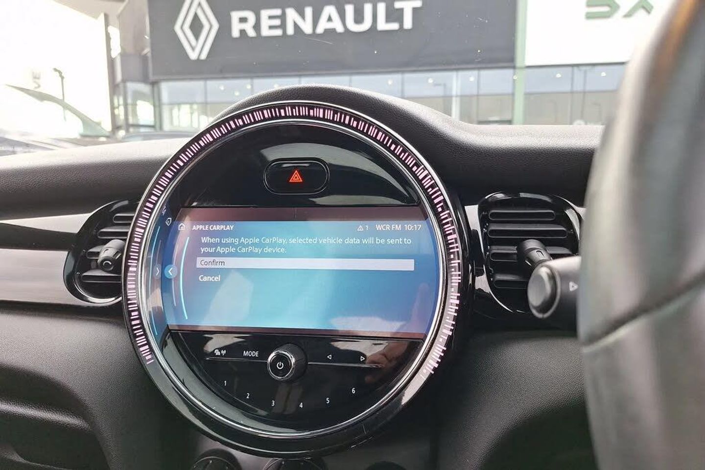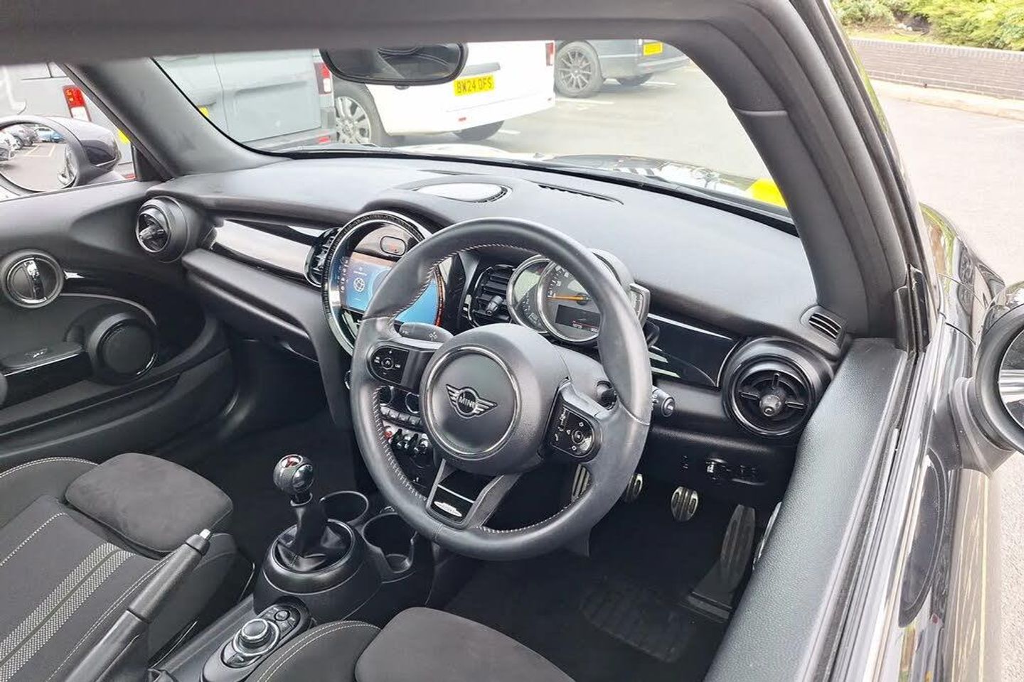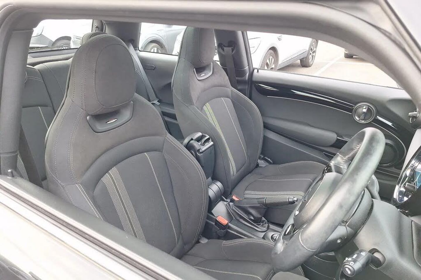 Automatic start/stop function with brake energy recuperation,Compatible mobile phone bluetooth with audio streaming,Cruise control with brake assist,Electro-mechanical speed dependant steering assistance,Flexible car sharing preparation,Instrument cluster,MINI Driving Modes - centre toggle switch to control driving setting (sport, mid and green),Mini E-call,MINI TeleServices,On board computer,Rear park distance control,Service interval indicator,6 Speed manual transmission including gear change indicator display,Adaptive suspension,Double Vanos system,Fully variable valve control,High precision injection,Performance Control,4 speakers in front door trims and underneath front seats,8.8" touchscreen with LED ring,FM tuner and DAB digital radio,Automatic headlight activation switch,Body colour fuel filler cap,Chrome border high gloss black slats radiator grille,Dynamic brake lights,Electric front windows,Exhaust tailpipe on left with chrome finisher,Heated rear window,Heated windscreen washer jets,JCW Aerodynamic kit - Front and rear bumpers with sporty JCW styling and part-painted side sills with MINI John Cooper Works door sill finishers,John Cooper Works rear spoiler,LED headlight with closed ring and daytime driving lights,Metal door sill strips with MINI imprint,Model logo Cooper on right of tailgate,Rain sensor window wipers,Rear fog lights,Rear LED lights with union jack design,Rear window wiper,Side scuttle panel with integrated indicator,Sun/heat protection glass,White indicator lenses,12V Accessory socket in centre console,4 lashing eyes in luggage compartment,60/40 split folding rear seat,Anthracite headliner including grab handles and clothes hooks,Carbon black colour line - Knee roll and door armrest,Chrome interior highlights,Cupholders,Front and rear isofix with front passenger airbag deactivation,Glove compartment,Height and length steering column adjustment,Interior lighting with 12 different colours across the dashboard, underneath door bezel with illuminated laser-engraved design on central display,JCW Sport seats with integrated headrests, adjustable thigh support and John Cooper Works logo,Leatherette gearshift lever and handbrake gaiters,LED reading lights, vanity mirror lights, front foot well light and spotlight on front seats,Manual air conditioning,Mechanical seat adjustment - forward/back & backrest for front seats and driver seat height adjust,Multifunction steering wheel,Passenger seat height adjuster,Storage compartments in doors,Sunvisors with vanity mirrors,Velour floor mats,Walknappa leather steering wheel with grey seam and John Cooper Works badge on Piano Black lower steering wheel spoke,Piano black exterior pack - Mini Hatchback Cooper,3 point seatbelts on all four seats,6 Airbags - front, side, head and seat belt tensioners,Anti-lock braking system (ABS),DSC - Dynamic Stability Control,Front and rear disc brakes,Single tone fanfare horn,Tyre pressure monitoring system,Alarm system with tilt sensor, monitoring doors, bonnet interior and tailgate,Electronic vehicle immobiliser,Start/stop toggle with keyless go,Piano black interior trim,Tool kit,Comfort Pack,Dinamica-Cloth - Carbon Black,Heated Front Windscreen,Midnight Black,Panoramic Glass Sunroof,Roof and Mirror Caps - Body-Colour