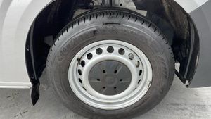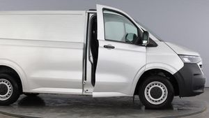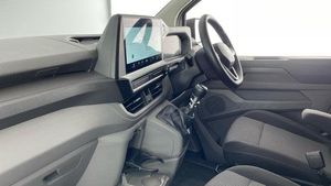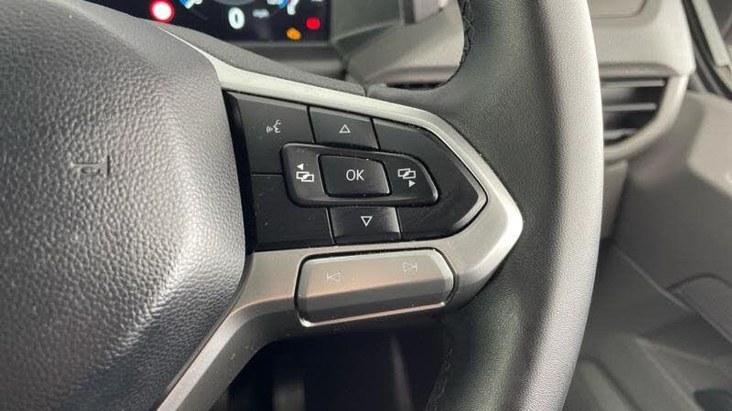 16 steel wheels with full wheel covers, Heat reflecting side window glass, Body coloured door handles, Mud flaps front and rear, Rear Transporter nameplate in black grained decorative trim, Vehicle opening configuration 1x 1st row of seats, 2x all doors, Electronic stability control, ABS, ASR with deactivation button, hill start assist and brake assist system, Cruise control, Electromechanical speed sensitive power steering, height and longitudinally adjustable steering column, Lane assist, Wrong way driver warning, Driver and front passenger airbag with front passenger airbag deactivation, Dual tone horn, Front and curtain airbags for driver and front passenger, Seat belt pretensioner for driver seat, Apple CarPlay and Android Auto, 4 speakers - 2x dashboard, 2x cab doors, 12 digital drivers display, 13 touchscreen infotainment display with wireless app connect and DAB radio, 5G Modem, Dynamic road sign display, eCall emergency system, Preparation of VW connect and connect plus, Alternator - 230A, 2x 15-W USB data/charging ports in dashboard and 1x USB-C, 1x USB-A center bottom, 3 spoke leather wrapped multi function steering wheel, Black plastic scuff plate for sliding door in cargo without illumination, Leatherette gear lever, Narrow centre console with cup holder and compartment for mobile phone, Overhead storage compartment, Roof grab handle on front passenger side, Rubber floor covering in cab, Striped fabric upholstery, Cabin interior lighting, 2x LED lights in load compartment, Lashing rings for reinforced floor covering, Without passenger seats in load compartment, 4 way height and tilt adjustable head restraints, Anti theft alarm system with interior monitoring in cab, backup horn and towing protection, Electronic immobiliser, Preparation for alcohol ignition interlock, 5+ Promise