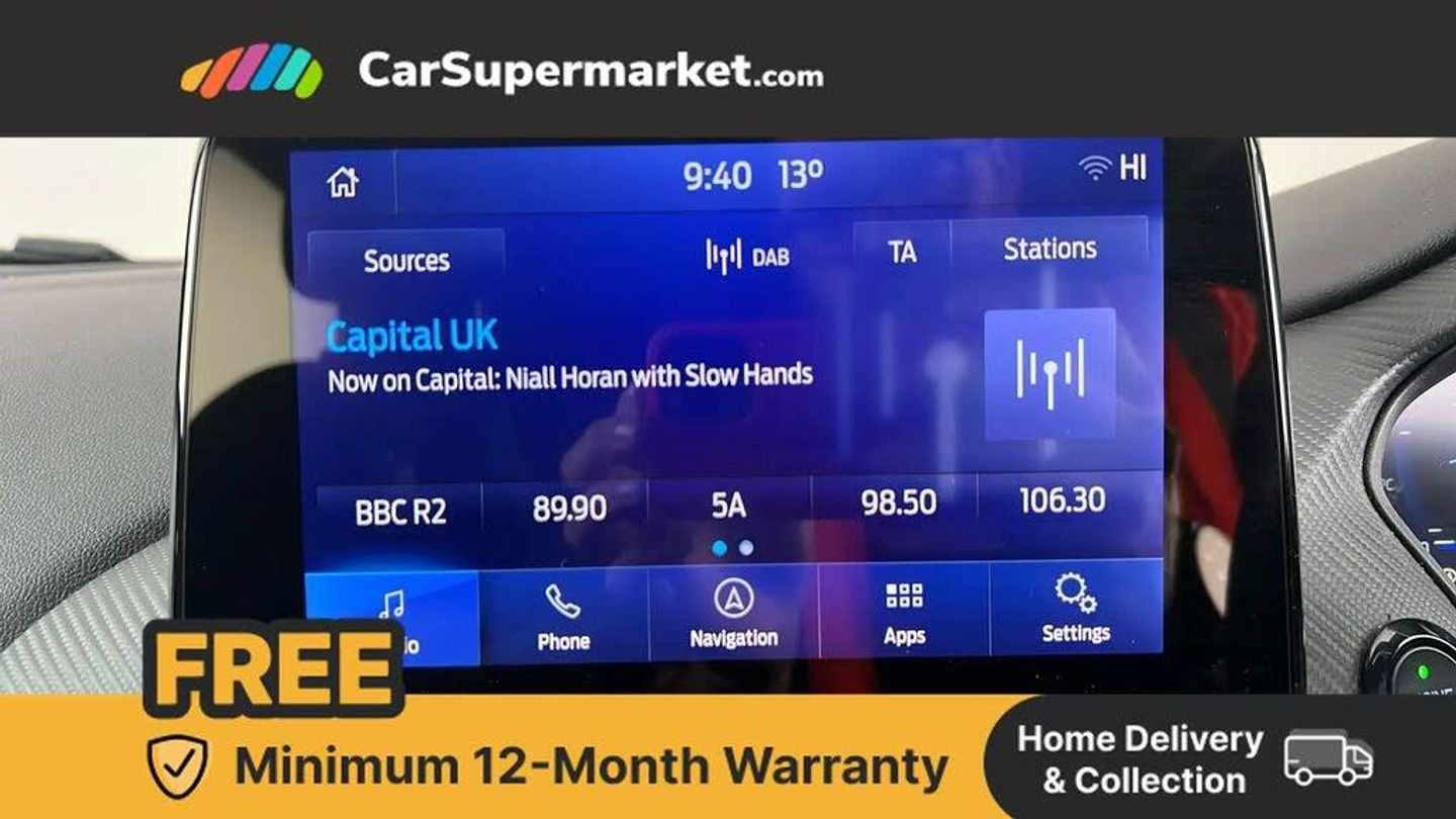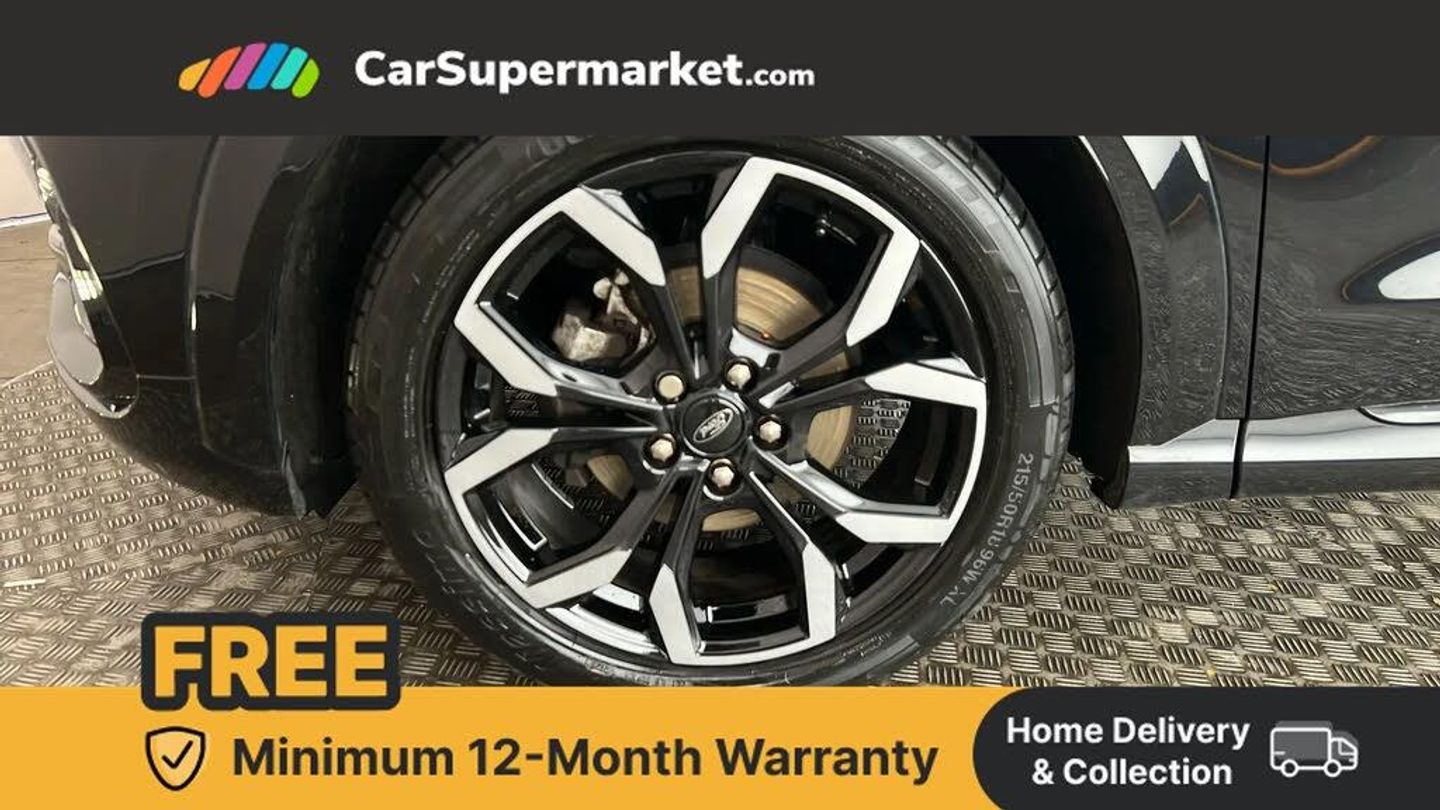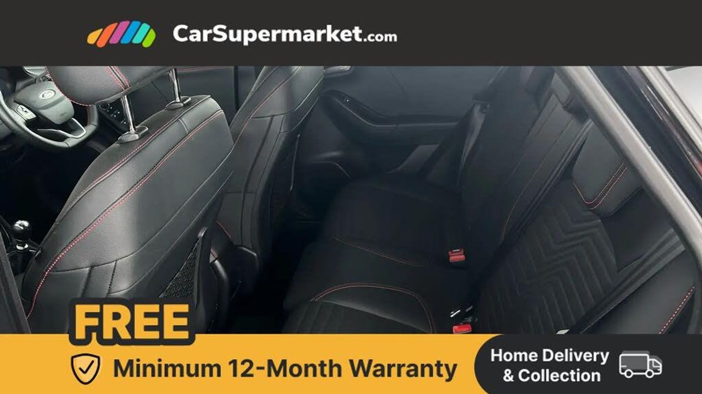 Driver impairment monitor,Emergency call service,Ford easy fuel,Full digital 12.3" instrument cluster,Lane keeping aid with lane departure warning,Power assist steering,Power start button,Rear parking sensor,Selectable drive modes(Normal, sport, Eco, trail, slippery),Speed sign recognition,Sport suspension,Automatic headlights with auto high beam,Automatic rain sensing wipers,Front fog lamps,LED daytime running lights,LED rear lamps,Power foldable heated door mirrors with puddle lamps,Privacy glass to side rear windows and tailgate glass,Quickclear heated windscreen,Rear side wing doors,Rear wiper,ST-Line body styling kit with unique grille and large body colour rear spoiler,Third brake light,3 seat bench in 2nd row,Centre console with armrest and stowage,Ford megabox extended bootspace,Front and rear head restraints,Manual 4 way driver seat adjust with lumbar adjustment,Manual 4 way passenger seat with lumbar seat adjustment,Sensico partial premium upholstery,Single front passenger seat,ST-Line flat bottomed sensico leather steering wheel with leather handbrake and aluminium gear knob,Wireless charging pad with electronic air temperature control (EATC),B&O Premium Audio system + Ford SYNC 3 navigation pack - Puma,3 rear seatbelts,Child safety lock,Electronic stability control (ESC) and hill start assist,Pedestrian/cyclist detection & post-collision braking,Pre collision assist with autonomous emergency braking,Tyre pressure monitoring system (TPMS),Thatcham alarm,Carbon look interior deco spears,Agate Black,Partial Premium Sensico - Black with Red Stitching