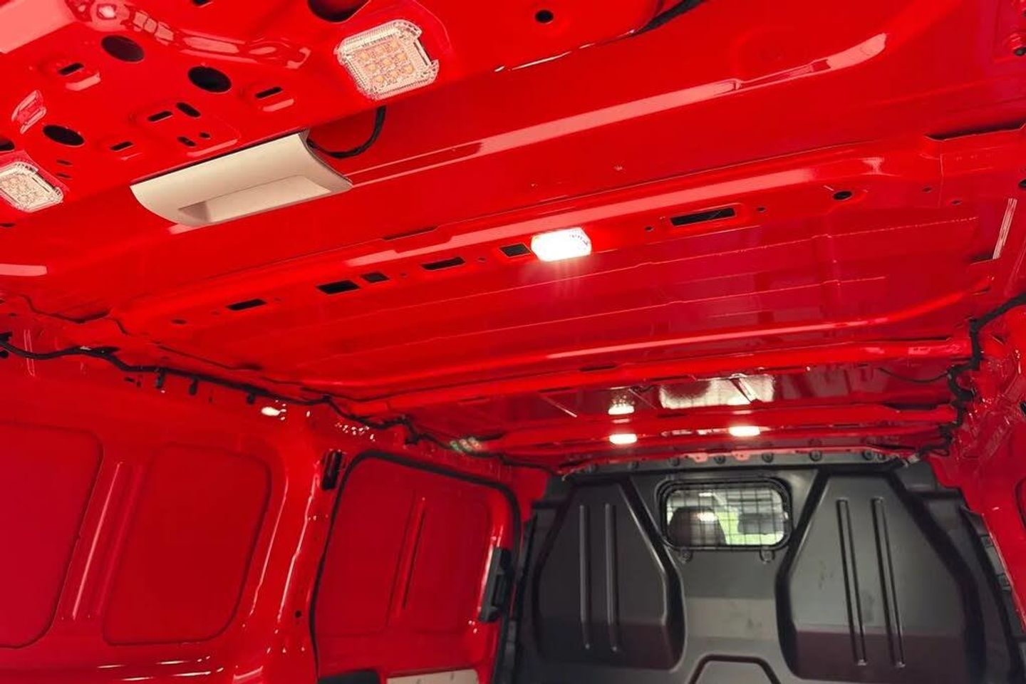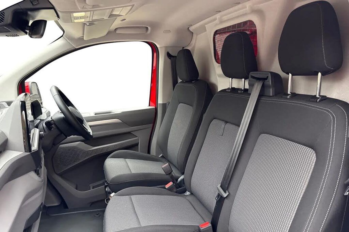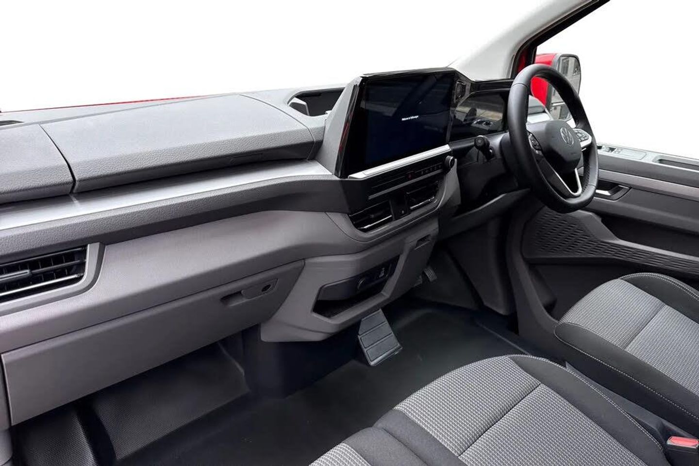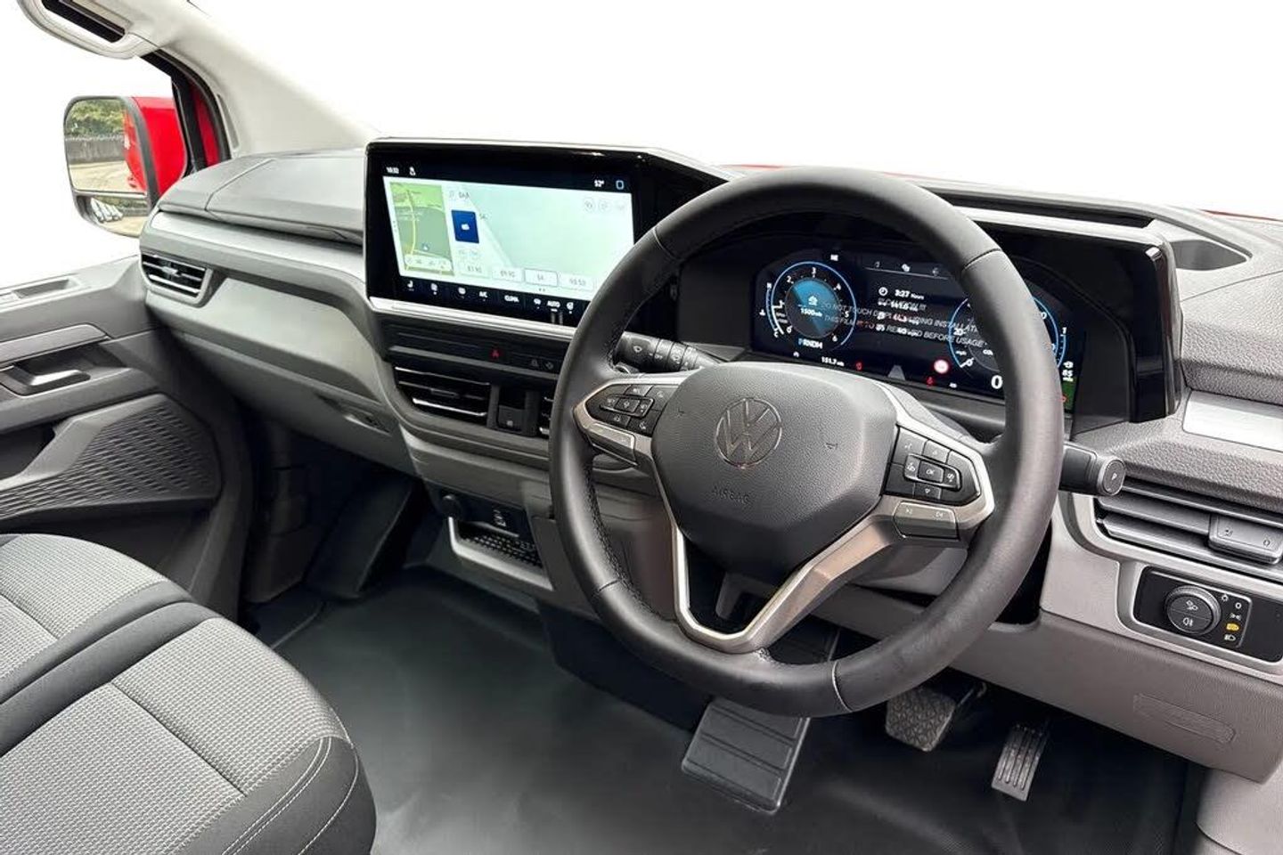 Heated rear window,Solid paint,IQ light LED matrix headlight with coming home and leaving function,Harman kardon sound system with 4 speakers,Navigation system,3 spoke heated leather wrapped multi function steering wheel,High metal partition with window,fabric covering on upper part of partition on cab side,Rear tailgate,3 seat cab life package heated - Transporter,Life interior trim pack - Transporter,Parking package premium plus - Transporter,Solid - Intensive red,16" Montreal silver alloy wheels,Heat reflecting side window glass,Body colour bumpers,Body coloured door handles,Body coloured radiator grille,Mud flaps front and rear,Rear Transporter nameplate in black grained decorative trim,Vehicle opening configuration 1x 1st row of seats,2x all doors,Electromechanical brake booster,Electronic stability control,ABS,ASR with deactivation button,hill start assist and brake assist system,Adaptive cruise control,Electromechanical speed sensitive power steering,height and longitudinally adjustable steering column,Lane and blind spot assist with exit warning system,Traffic jam assist,Wrong way driver warning,Body coloured door mirrors,Electrically heated,adjustable and folding door mirrors,Driver and front passenger airbag with front passenger airbag deactivation,Dual tone horn,Front and curtain airbags for driver and front passenger,Seat belt pretensioner for driver seat,Apple CarPlay and Android Auto,Wireless mobile phone charging,12" digital drivers display,13" touchscreen infotainment display with wireless app connect and DAB radio,5G Modem,Dynamic road sign display,eCall emergency system,Preparation of VW connect and connect plus,Alternator - 230A,2x 15-W USB data/charging ports in dashboard and 1x USB-C,1x USB-A center bottom,5 additional USB-C charging ports,Black plastic scuff plate for sliding door in cargo without illumination,Gear selector lever on steering wheel,Glasses compartment in driver side roof,Grab handle on A-pillar passenger side,Illuminated lockable glovebox,Narrow centre console with cup holder and compartment for mobile phone,Overhead storage compartment,Rubber floor covering in cab,Striped fabric upholstery,Cabin interior lighting,12V outlet in centre console and 12V outlet on rear right D-pillar,2x LED lights in load compartment,3x additional super bright LED lights in load compartment,Lashing rings for reinforced floor covering,Without passenger seats in load compartment,4 way height and tilt adjustable head restraints,Anti theft alarm system with interior monitoring in cab,backup horn and towing protection,Electronic immobiliser,Lockable wheel bolts,Preparation for alcohol ignition interlock,5+ Promise