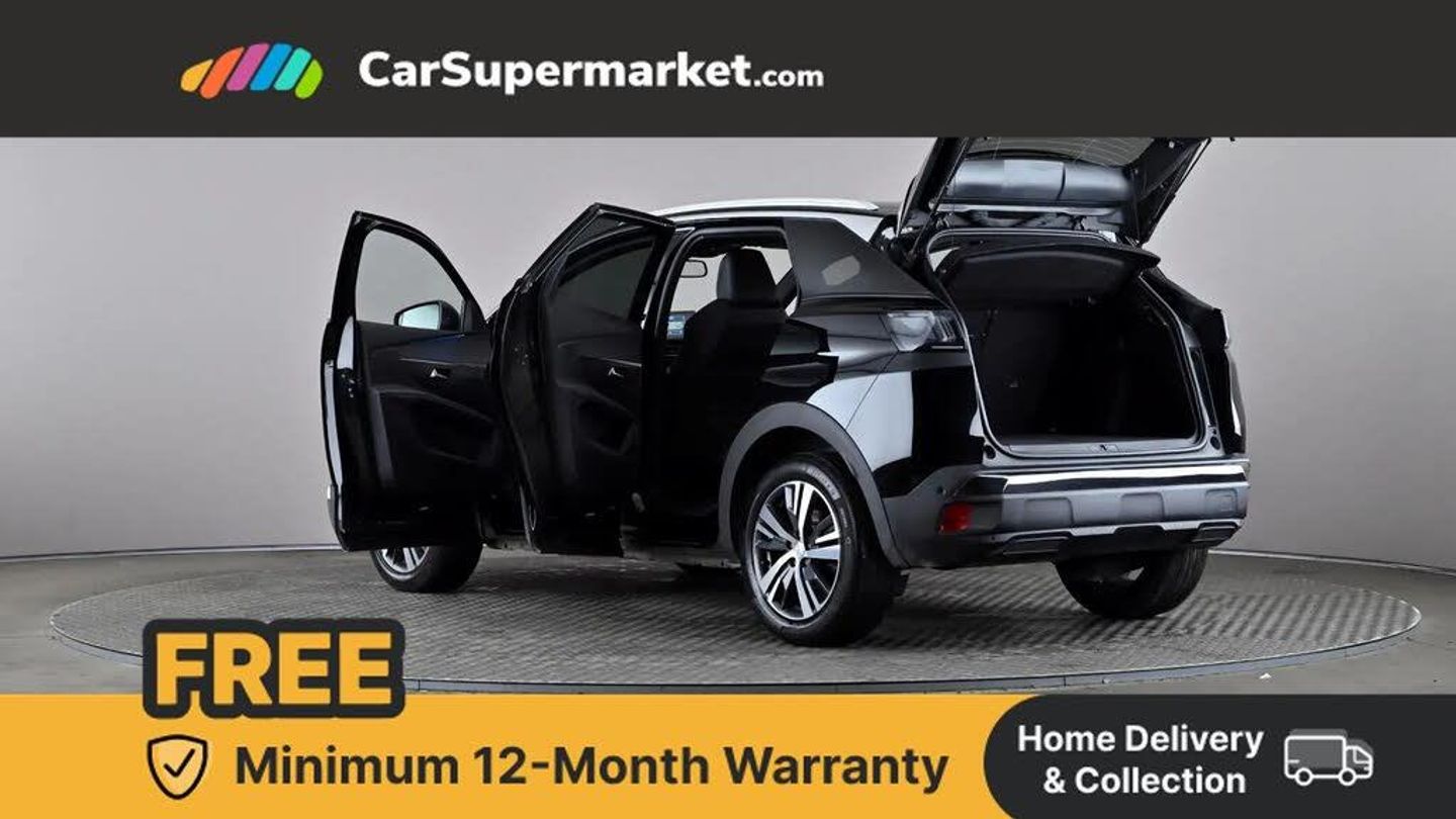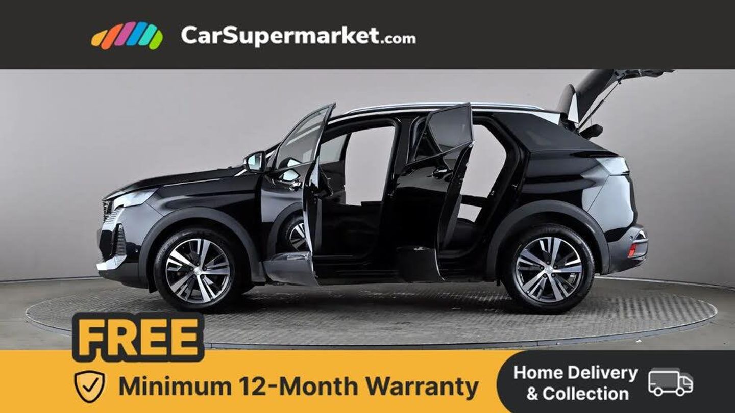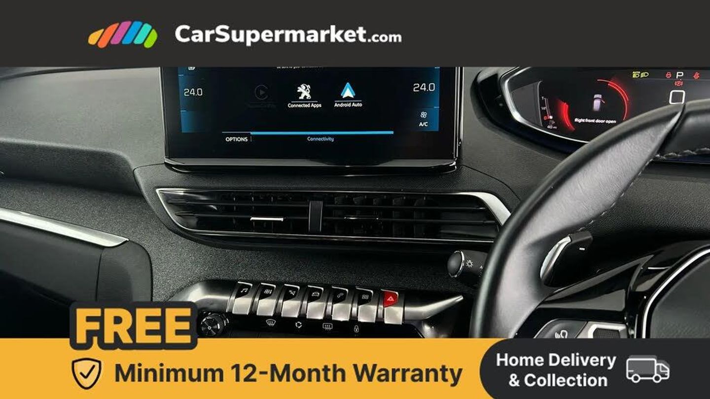 3D connected navigation with 10" HD touchscreen + voice recognition system,Apple car play and Android auto,Bluetooth telephone facility,Drive modes select (Eco, normal and sport),Driving Time Warning (DAA1),Emergency services call system,Extended traffic sign recognition,Exterior temperature indicator with ice warning,Front and rear parking sensors,Lane departure warning system,Mirror screen with mirror link, apple carplay and android auto,Multi function trip computer,Peugeot i-cockpit with compact multi-function sports steering wheel,PEUGEOT i-Cockpit with configurable 12.3" Head-up digital instrument panel,PEUGEOT SOS and assistance,Speed limit recognition and recommendation,Dynamic stability control and electronic anti-skid system,6 speakers radio with mp3 compatible,DAB Digital radio,USB socket,Aluminium front door sills,Aluminium longitudinal roof bars,Automatic hazard light activation upon heavy brake application,Automatic triggered rear windscreen wiper in reverse gear,Black diamond roof,Black rubber side window trim,Black with chrome detailed front wing trim,Body colour door handles,Body colour rear roof spoiler with stainless steel edging trim,Body protectors (wheel arches + protection at bottom of doors) in black,Chrome frameless 'Classic' grille,Chrome rear bumper facia,Dark tinted rear side windows + tailgate window,Diamond Black door mirror shells,Door mirror mounted LED courtesy floor lighting,Eco LED headlights,Electric folding door mirrors with exterior courtesy LED lighting,Electric operated/heated door mirrors,Front and rear door and sill protectors with polished stainless steel insert,Front bumper lower trim in Silver,Front windscreen wiper with magic wash cleaning system,Gloss black B and C pillar and aerodynamic deflector trim,Gloss black front bumper air scoops,Gloss black rear cluster connecting strip,Gloss black windscreen trim,Headlights left on audible warning,Heated rear windscreen with integrated antenna,LED daytime running lights in fang style,LED front indicator,LED rear number plate lighting,LED side indicator lights integrated into door mirrors,LED third brake light,One touch electric front/rear windows with pinch protection,Rear LED Peugeot signature 'Claw Effect' lights with clear lens and scrolling LED direction indicators,Rear side wing doors,Stainless steel door sill scuff plates,Stainless steel roof arches,1/3 to 2/3 split folding rear seats,12V Sockets in dashboard, rear cabin and load area,2 cupholders in front centre console,2 x Rear reading spotlights,2x Rear coat hooks,3x Isofix child seat fittings in the front passenger and outer rear seats,4 Grab handles retractable and damped,Aluminium pedals,Blue ambient lighting for connecting zone,Blue ambient lighting to front door panels,Blue ambient lighting to headup instrument panel,Brumeo fabric trimmed door armrests,Centre front armrest with butterfly wing opening and illuminated storage compartment,Driver seat lumbar adjustment,Driver seat manual adjustment (longitudinal and back rest angle),Dual zone automatic climate control,e-Toggle compact gear selector,Electric power steering with reach and rake adjustable steering column,Flocked glovebox interior,Footwell illumination,Front interior light with 2 reading spotlights and rear interior light with timer,Front passenger seat manual adjustment (longitudinal and back rest angle),Front seat back map pockets,Gear shift indicator,Height adjustable front seats,Illuminated glove box, central storage area and load area,Individual left and right controls in boot for seat folding,Leather steering wheel with detail stitch,LED interior lighting in storage spaces and load area,LED roof interior lighting,Rear armrest with ski flap and two cup holders,Rear bench seat with central armrest and ski hatch,Rear centre console ventilation system,Roof lining - Mistral black,Satin chrome dashboard trim,Satin chrome digital instrument panel and touchscreen trim,Satin chrome front door panel recess trim,Satin chrome interior door handles,Satin chrome scorpion's tail and toggle switch trim,Seatbelt not fastened audible and visual alert for front seats,Seatbelt unfastened on the move audible and visual alert for front and rear seats,Single front passenger seat,Sunvisors with illuminated vanity mirrors,Two position boot floor,Safety Plus Pack - 3008,Visibility pack - 3008,3x Rear three-point retractable seatbelts with force limiters in the outer rear seats,ABS (Anti-lock Braking System) with EBD (Electronic Brakeforce Distribution) and EBA (Emergency Braking Assistance),Acoustic vehicle alerting system,Adaptive driver and front passenger airbags with passenger airbag deactivation function,Driver and front passenger side airbags,Electric child locking functionality on rear windows and doors,Electric parking brake,Front and rear curtain airbags,Front optimised safety headrests and 3 x rear retractable headrests with height adjustable