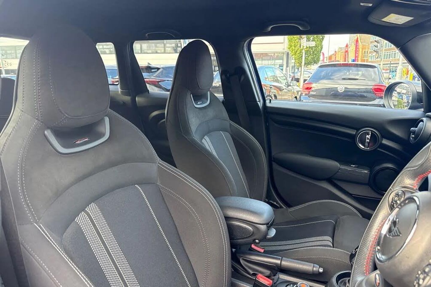 12V Socket in Centre Console,17in Alloy Wheels - Track Spoke in Black,3 Point Seatbelts on all Seats,4 Lashing Eyes in Luggage Compartment,6 Speakers - in Front Door Trims and Underneath Front Seats,6.5in Screen with LED Ring,Air Conditioning - Manual,Airbags,Alarm System,Anti-Lock Braking System - ABS,Automatic Headlight Activation Switch,Bluetooth for Compatible Mobile Phone - with Audio Streaming,Carbon Black Colour Line - Knee Roll and Door Armrests,Chrome Highlights,Cruise Control with Brake Function,Cup Holders,Door Storage Compartments,Dynamic Brake Lights,Dynamic Stability Control - DSC,Electric Windows,Electro-Mechanical Steering with Speed Dependant Steering Assistance,Electronic Vehicle Immobiliser,Exhaust Tailpipe - Left with Chrome Finisher,FM Tuner and DAB Digital Radio,Foldable Rear Seats 60-40,Front and Rear ISOFIX - including Front Passenger Airbag Deactivation,Fuel Filler Cap in Body Colour,Glove Compartment,Headliner - Anthracite,Heated Rear Window,Heated Windscreen Washer Jets,Instrument Cluster,Interior Lighting,Interior Surface - Hazy Grey,John Cooper Works Aerodynamic Kit,John Cooper Works Leather Steering Wheel,John Cooper Works Roof Spoiler,John Cooper Works Sport Seats,LED Headlights with Closed Ring as Daytime Driving Lights,LED Reading Lights - Vanity Mirror Lights - Front Footwell Lights - Spotlights on Front Seats,Leatherette Gearshift Lever and Handbrake Gaiters,MINI E-Call,MINI Logo Projection on Floor from Drivers Exterior Mirror,MINI TeleServices,Mechanical Seat Adjustment,Model Logo Cooper on Right of Tailgate,Multifunction Controls for Steering Wheel,On-Board Computer,Performance Control,Radiator Grille - Chrome Border with Black High-Gloss Slats,Rain Sensor Window Wipers,Rear Fog Light,Rear LED Lights with Union Jack Design,Rear Window Wiper,Roof and Mirror Caps - Body-Colour,Side Scuttle Panels with Integrated Indicators,Single Tone Fanfare Horn,Start-Stop Toggle including Keyless Go,Steering Column Height and Length Adjustment,Sun Visor with Vanity Mirrors,Sun-Heat Protection Glass,Tool Kit in Luggage Compartment,Tyre Pressure Monitoring System,White Direction Indicators Lights,Comfort Pack,Darkened Rear Glass,Dinamica-Cloth - Carbon Black,Navigation Pack,Roof and Mirror Caps - Black