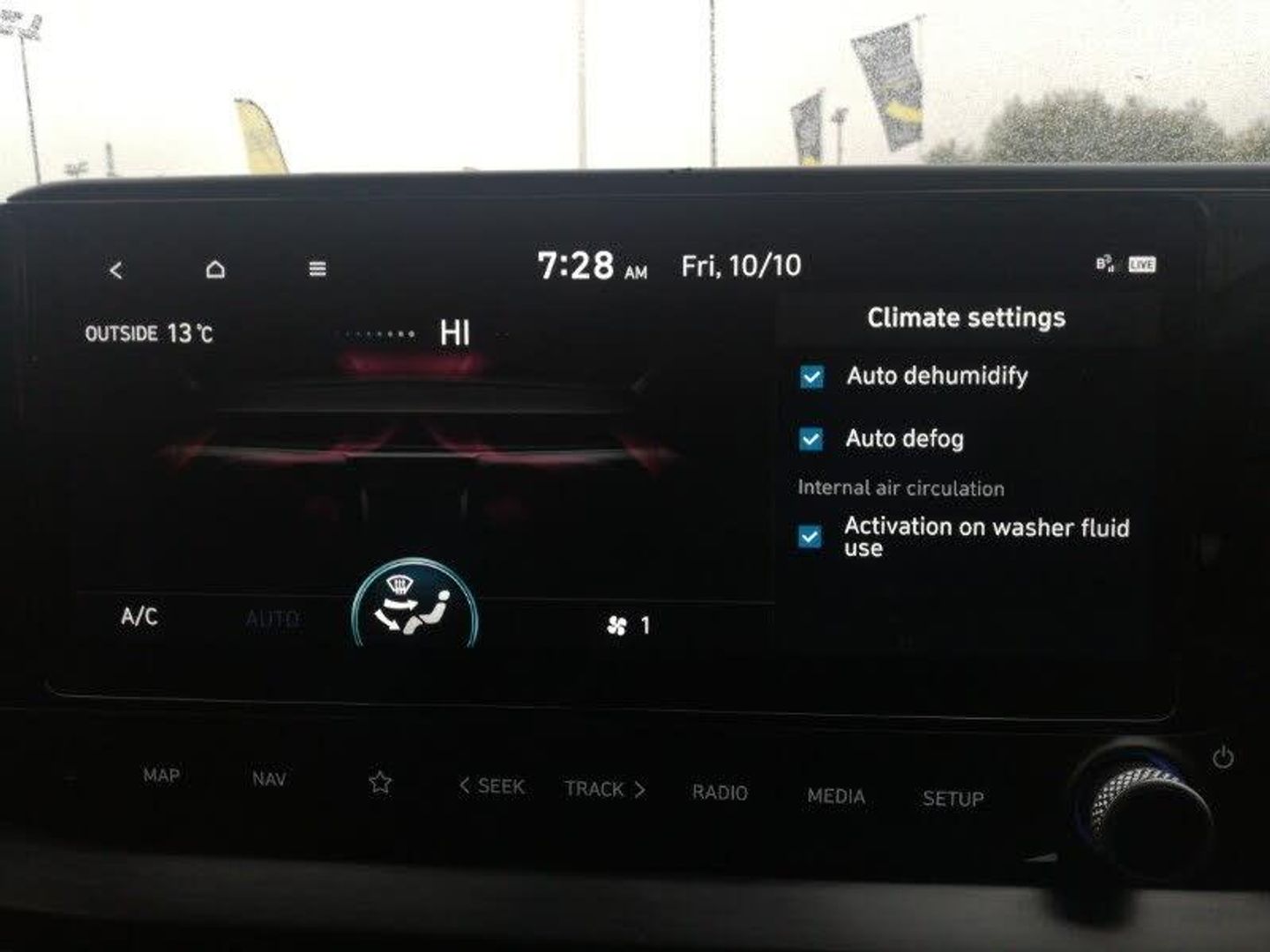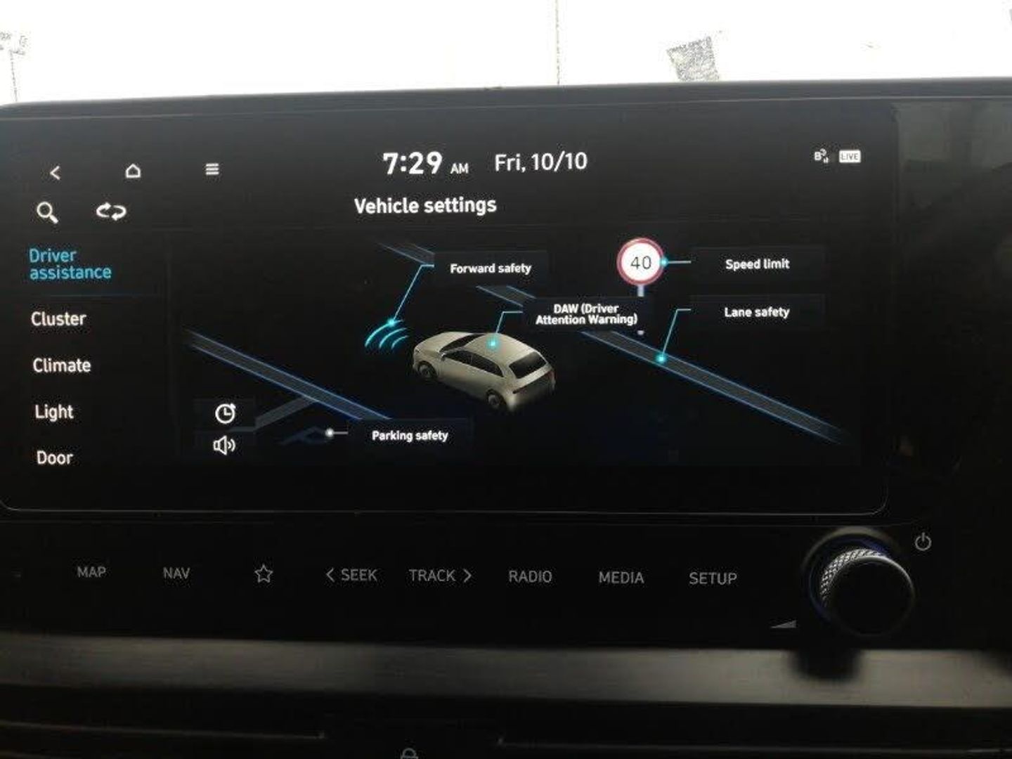 10.25" touchscreen centre console display satellite navigation including traffic messaging channel, map care and live services, 10.25" digital supervision cluster, Bluelink telematics, Bluetooth connectivity with voice recognition, Cruise control with speed limiter, Drive mode selector, Electric power steering, Rear parking sensors, Rear view camera, Phone connection with apple carPlay and android auto, DAB radio, Steering wheel mounted audio/phone controls, USB and aux connection in front, Auto dimming rear view mirror, Automatic headlights with dusk sensor, Automatic windscreen wipers with rain sensor, Adjustable intermittent front windscreen wipers with aero wiper blade, Electric adjustable/heated/folding door mirrors, Electric front/rear windows with drivers one touch/anti-trap, LED daytime running lights, Static Cornering lights, Automatic climate control with defog system for front windscreen, Blue interior mood lighting, Heated front seats, Height/reach adjustable steering column, Illuminated driver/passenger vanity mirror, Isofix child seat anchorage points - rear, Electronic Stability Programme (ESP), Anti-lock braking system (ABS), Vehicle stability management