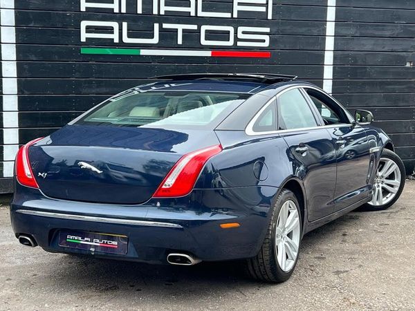 Amalfi Autos are proud to offer this stunning jaguar XJ ! This top of the range portfolio model comes finished in a classy combination of Royal Navy blue with a cream leather interior. Endless specification including sliding panoramic roof , bowers Wilkins sound system , rear camera , cruise control , satnav , rear climate , heated seats plus much more ! Mechanically the car will come freshly serviced and sold with a 12 month advisory free mot-PAN ROOF + BOWERS WILKINS