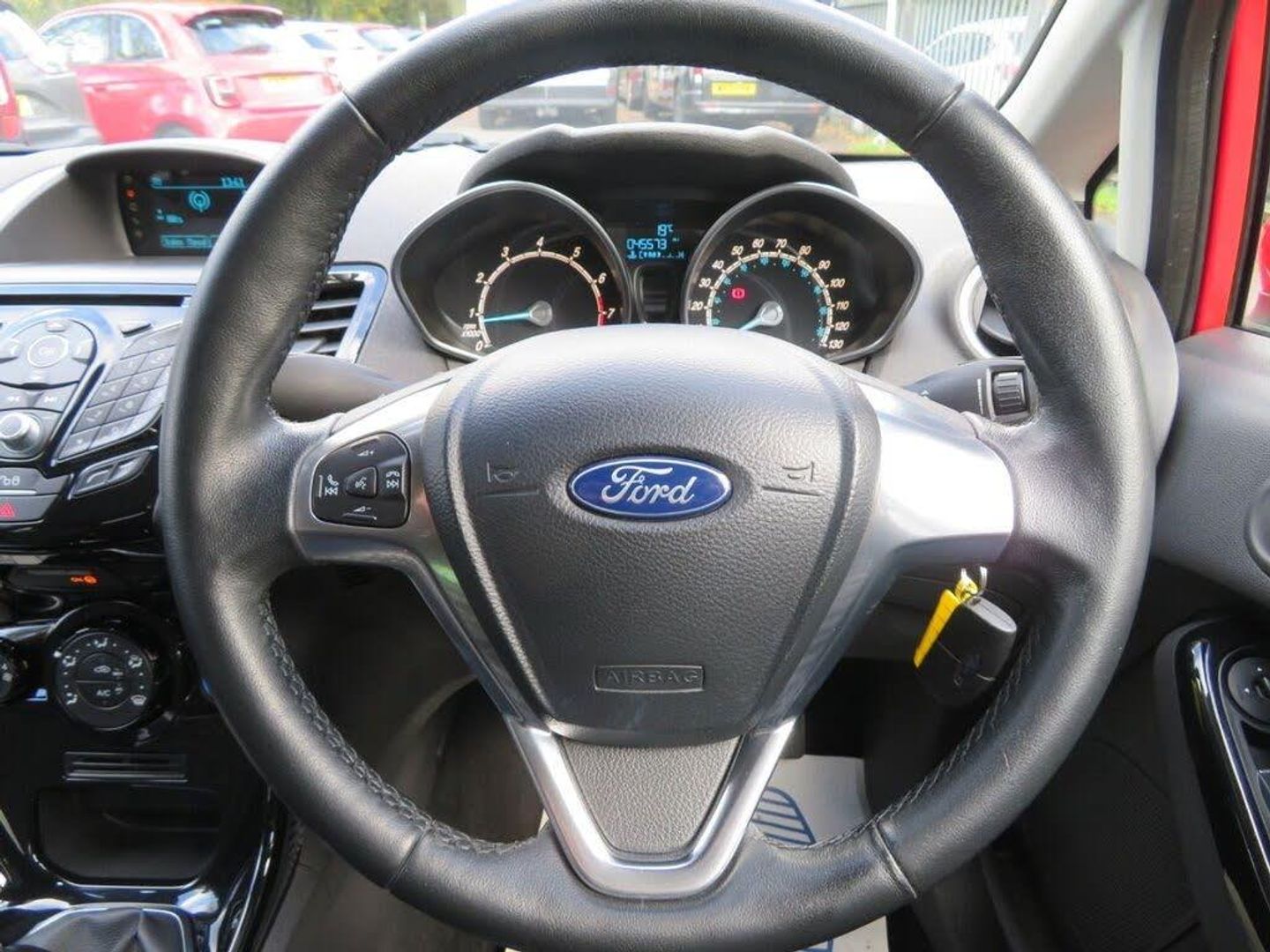 12V Power Socket - Front, 15in Alloy Wheels - 5x2 Spoke, ABS - Anti-lock Braking System, Aesthetic Lighting Package, Air Conditioning - Manual, Airbags - Curtain, Airbags - Driver Side Knee, Airbags - Front Passenger, Airbags - Head and Thorax, Airbags - Passenger Deactivation, AUX Connection, Bluetooth Hands-free Phone, Body Colour Exterior Mirrors, Brake Warning Lights - Automatic Flashing of Brake Lights Under Heavy Braking, Bumpers - Front and Rear - Body Colour, Candy Red, Centre Console - with Trinket Tray - Two Cup Holders, Chrome Belt Line Finisher, Courtesy Light - Overhead with Theatre-Style Dimming, Courtesy Lights with Map Reading Lights, DDS - Deflation Detection System, Door Handles - Body Colour, Door Mirrors - Electrically Operated and Heated, Drivers Airbag, EBA - Emergency Brake Assist, EBD - Electronic Brakeforce Distribution, ECOmode, Electric Windows - Front with One Touch Lowering Drivers, Emergency Assistance, Emergency Brake Warning - Automatic Hazard Warning Lights, Engine Immobiliser, EPAS - Electric Power Assisted Steering, ESP - Electronic Stability Programme, Flow Through Centre Console, Ford AM-FM CD Audio System, Ford DAB with Ford SYNC, Ford Easy Fuel Capless Refuelling System with Misfuel Inhibitor, Ford SYNC, Front Fog Lights - Chrome Bezel Rings, Front Lower Grille Insert and Surround - Black, Front Seatback Map Pockets - Driver and Passenger, Front Upper Grille - Chrome Finish Surround, Front Upper Grille Insert - Chrome bars, Gear Knob - Leather, Gearshift Indicator Light, Gearshift Knob - Leather-Trimmed with Chrome Finish Bezel, Glovebox - Illuminated, Head Restraints - 2-way Adjustment, Head Restraints - Rear 2-Way Adjustment, Headlights - Halogen Projector with Silver Bezel, Headliner - Woven, Heated Front Windscreen, High-Mounted Rear Brake Light, Hill Start Assist, Interior Door Lever - Chrome Finish, IPS - Intelligent Protection System, Leather-Trimmed Handbrake, LED Daytime Running Lights, Lithos Cloth - Charcoal Black, Loadspace Compartment Light, Loadspace Floor Carpet, Locking Wheel Nuts, MyKey, Pollen Filter, Rake and Reach Steering Adjustable, Rear Courtesy Lights, Rear Spoiler - Body Colour, Remote Central Locking, Removable Package Tray, Seats - 60-40 Split Folding Back and Fixed Cushion, Seats - Drivers 4-Way Adjustment, Seats - Front Comfort Style, Seats - ISOFIX Mounting Brackets for Child Seats, Speakers - x6, Steering Wheel - 3-Spoke - Leather Trimmed with Bezel, Steering Wheel - Multifunction, Stowage Pockets - Driver and Front Passenger Seatbacks, Tailgate Handle - Body Colour with Chrome Finisher, Tinted Glass, Traction Control - TC, Trip Computer, Tyre Inflator Kit, Tyre Pressure Monitoring System, USB Connection, Voice Control - Audio