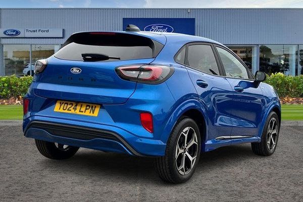 Driver impairment monitor, Emergency call service, Ford easy fuel, Full digital 12.8 instrument cluster, Lane keeping aid with lane departure warning, Power assist steering, Selectable drive modes(Normal, sport, Eco, trail, slippery), Speed sign recognition, Automatic headlights with rain sensing wipers and auto high beam, Front fog lamps, LED daytime running lights, LED rear lamps, LED third brake light, Power foldable heated door mirrors with puddle lamps and puma logo protection, Quickclear heated windscreen, Rear privacy glass, Rear side wing doors, Rear wiper, ST-Line body styling kit with unique grille, 3 seat bench in 2nd row, Centre console with armrest and stowage, Electronic automatic temperature control (EATC), Ford megabox extended bootspace, Front and rear head restraints, Front floor mats, Manual 4 way driver seat adjust with lumbar adjustment, Single front passenger seat, ST- Line cloth trim with red stitching, 3 rear seatbelts, Child safety lock, Electronic stability control (ESC) and hill start assist, Pre-collision assist with autonomous emergency braking, pedestrian/cyclist detection & post-collision braking, Tyre pressure monitoring system (TPMS)