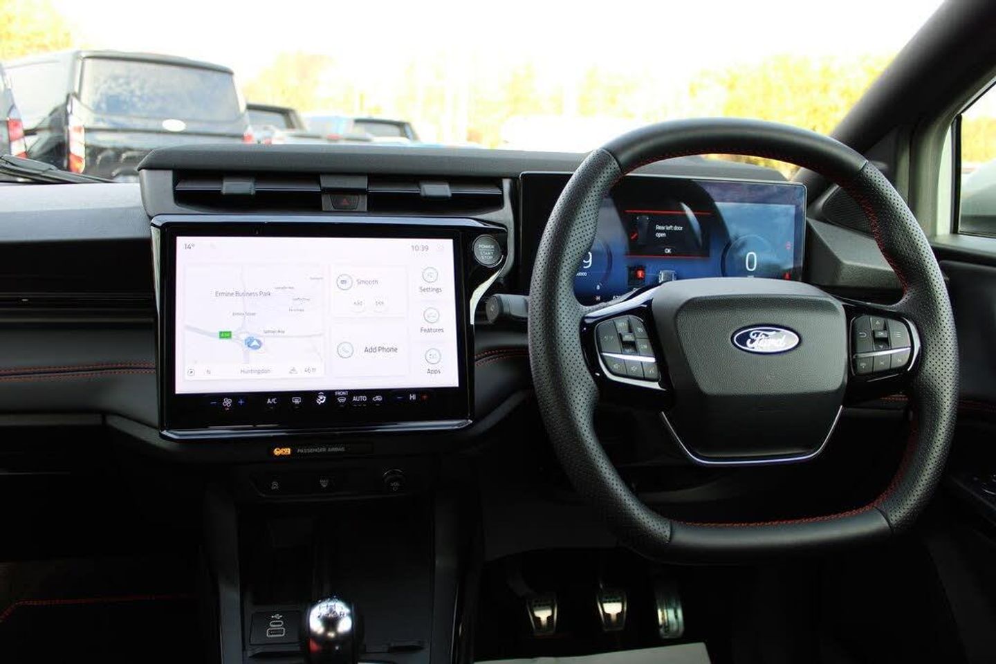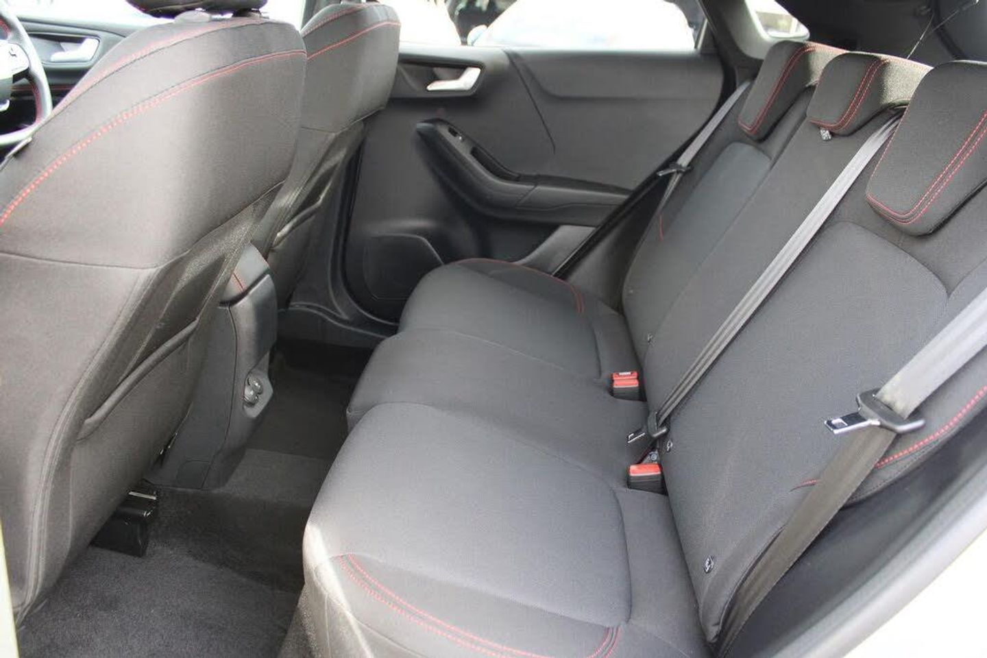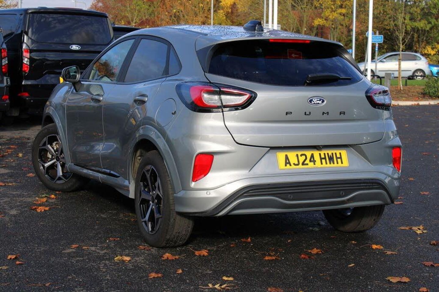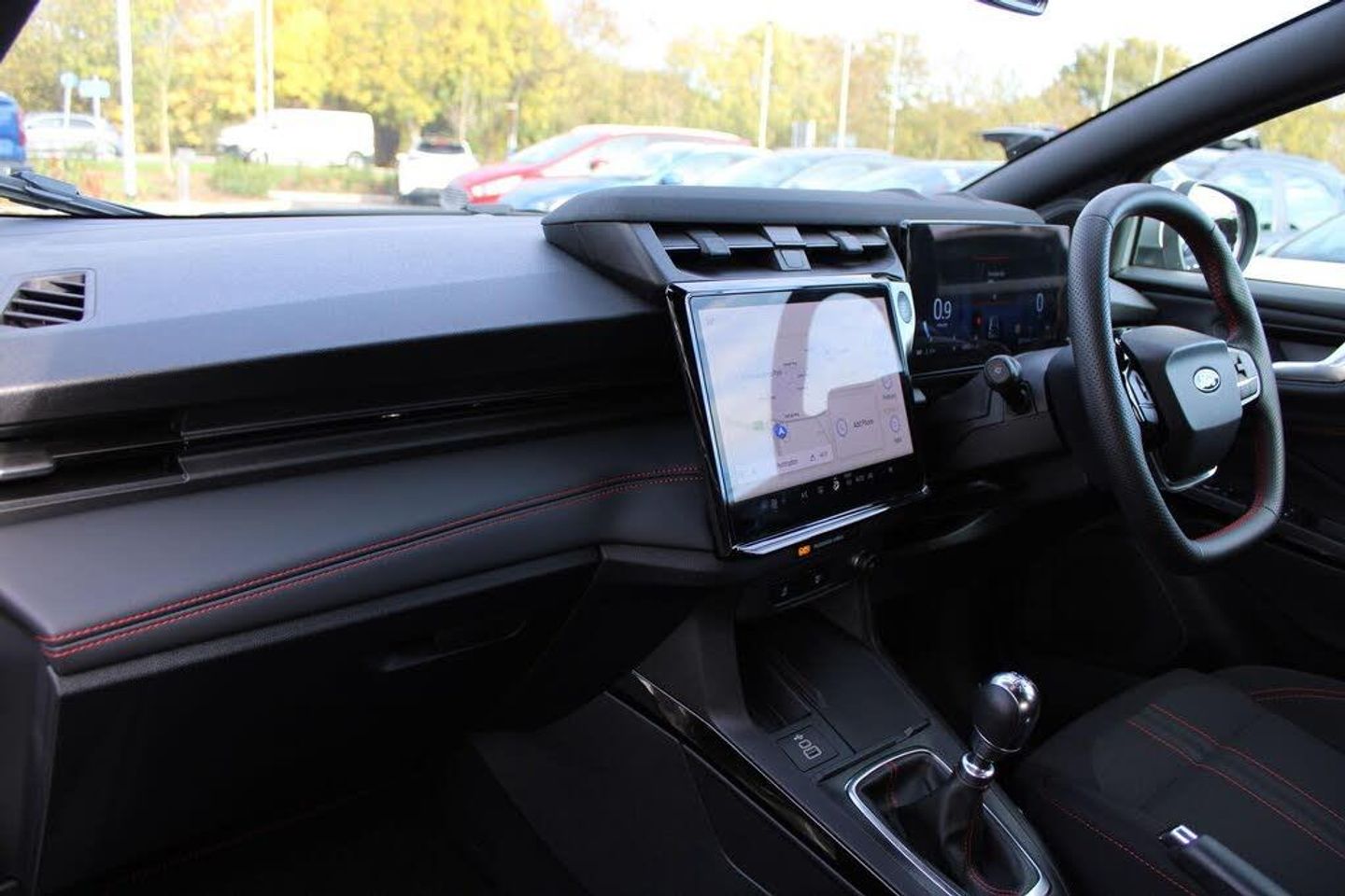 Driver impairment monitor, Emergency call service, Ford easy fuel, Full digital 12.8" instrument cluster, Lane keeping aid with lane departure warning, Power assist steering, Selectable drive modes(Normal, sport, Eco, trail, slippery), Speed sign recognition, 12" landscape touchscreen display with wireless apple car play and android auto 6 speaker audio system, Ford pass connect and emergency assistance, Ford SYNC4 with connected navigation, Automatic headlights with rain sensing wipers and auto high beam, Front fog lamps, LED daytime running lights, LED rear lamps, LED third brake light, Power foldable heated door mirrors with puddle lamps and puma logo protection, Quickclear heated windscreen, Rear privacy glass, Rear side wing doors, Rear wiper, ST-Line body styling kit with unique grille, 3 seat bench in 2nd row, Centre console with armrest and stowage, Electronic automatic temperature control (EATC), Ford megabox extended bootspace, Front and rear head restraints, Front floor mats, Manual 4 way driver seat adjust with lumbar adjustment, Single front passenger seat, ST- Line cloth trim with red stitching, Thatcham alarm, Cloth - Black with Red Stitching