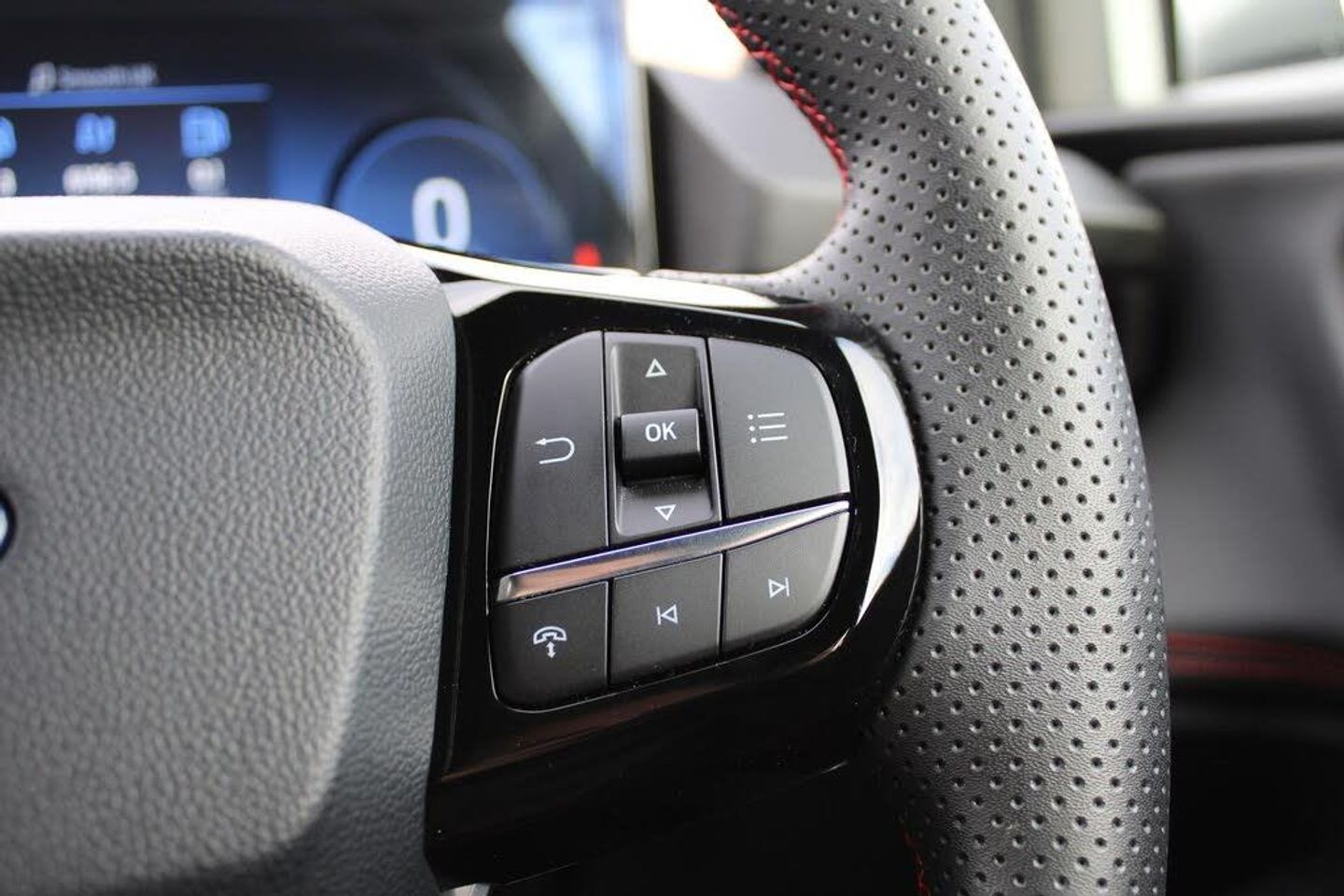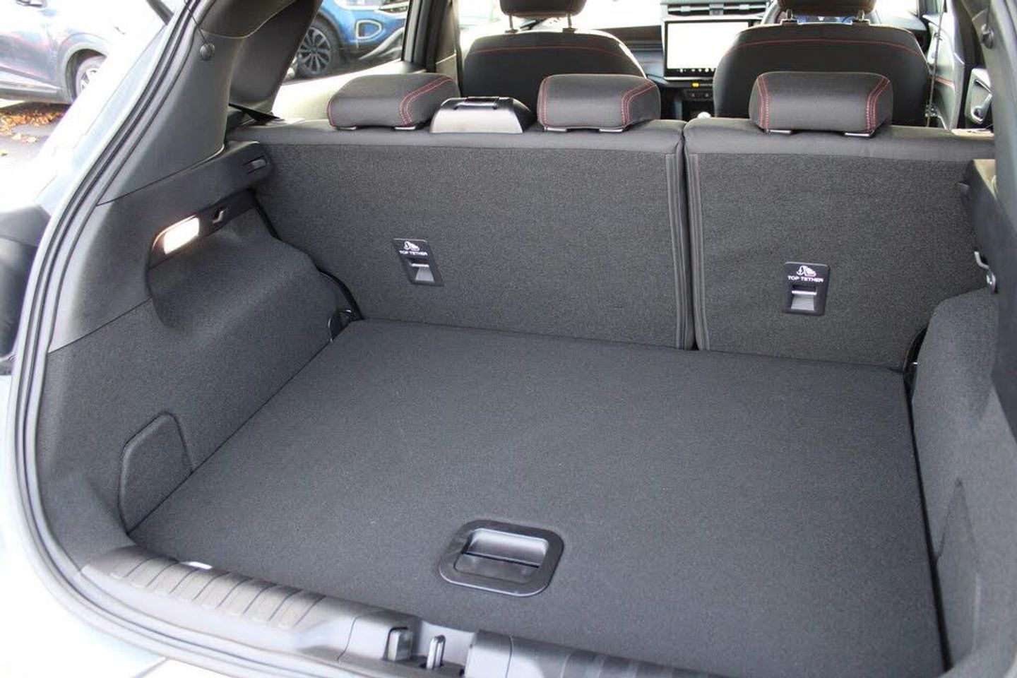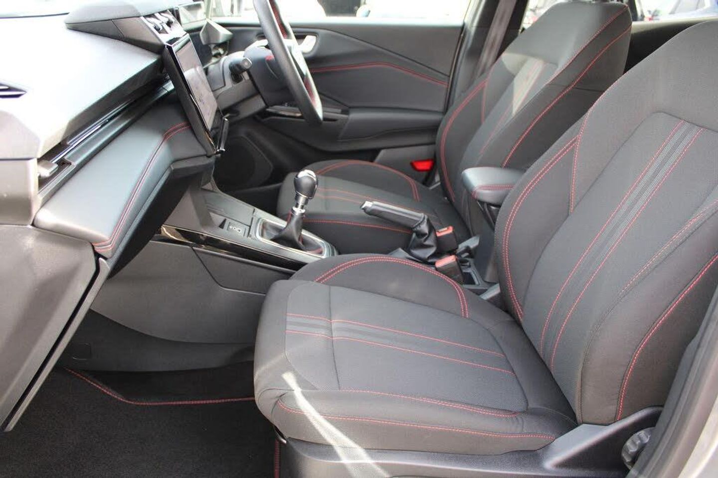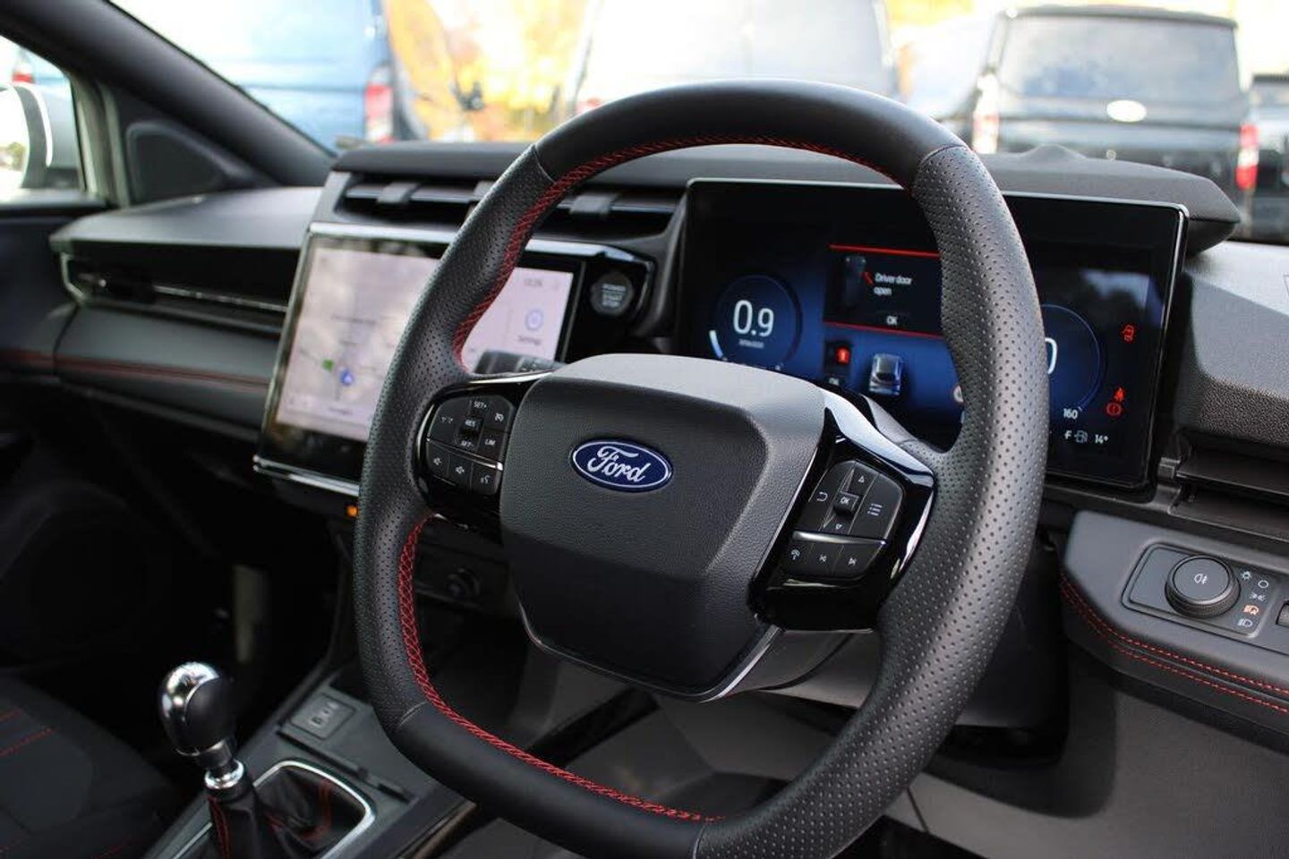 Driver impairment monitor, Emergency call service, Ford easy fuel, Full digital 12.8" instrument cluster, Lane keeping aid with lane departure warning, Power assist steering, Selectable drive modes(Normal, sport, Eco, trail, slippery), Speed sign recognition, 12" landscape touchscreen display with wireless apple car play and android auto 6 speaker audio system, Ford pass connect and emergency assistance, Ford SYNC4 with connected navigation, Automatic headlights with rain sensing wipers and auto high beam, Front fog lamps, LED daytime running lights, LED rear lamps, LED third brake light, Power foldable heated door mirrors with puddle lamps and puma logo protection, Quickclear heated windscreen, Rear privacy glass, Rear side wing doors, Rear wiper, ST-Line body styling kit with unique grille, 3 seat bench in 2nd row, Centre console with armrest and stowage, Electronic automatic temperature control (EATC), Ford megabox extended bootspace, Front and rear head restraints, Front floor mats, Manual 4 way driver seat adjust with lumbar adjustment, Single front passenger seat, ST- Line cloth trim with red stitching, Thatcham alarm, Cloth - Black with Red Stitching