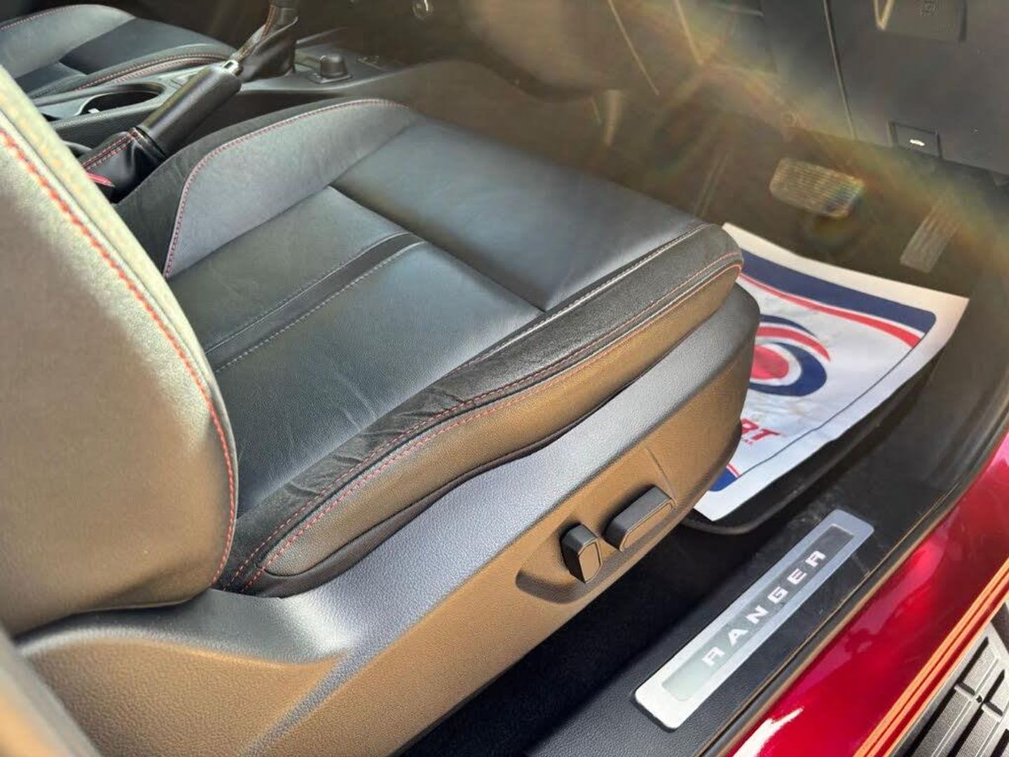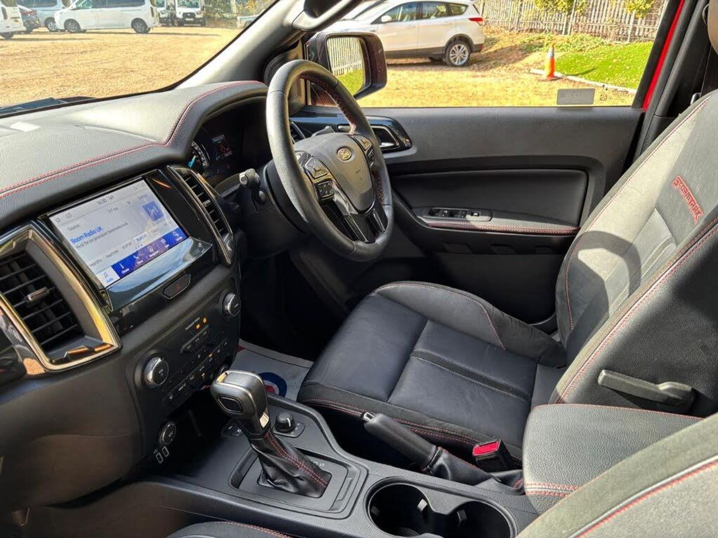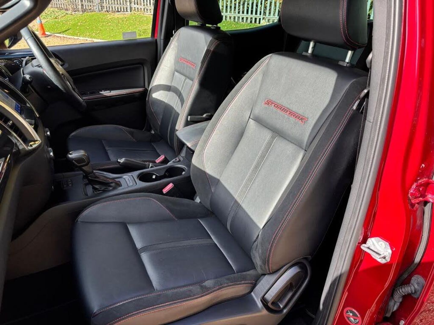 Partial leather interior.FORD RANGER STORMTRAK 2.0 Bi-Turbo 4x4 10 Spd Auto in RAPID Red / Stormtrak Leather/Suede RO72GVX with 28911 miles. FORD PROTECT 1-3 Years Available - 6 months included ** NO VAT ** Unique Leather / Suede Interior ** SYNC 3.4 Satellite Navigation with Apple Car Play / Android Auto Connectivity ** Power Mountain Top Roll Cover **18" Gloss Black Alloy Wheels ** Factory Fitted Tow Bar ** Dual Zone Climate Control ** Heated Front Seats ** Keyless entry and GO ** Front and Rear PArking Sensors ** Rear Vision Camera ** Full Ford Service History ** Cruise Control ** Power/ Heated / Folding Door Mirrors ** Stormtrak Stripe kit