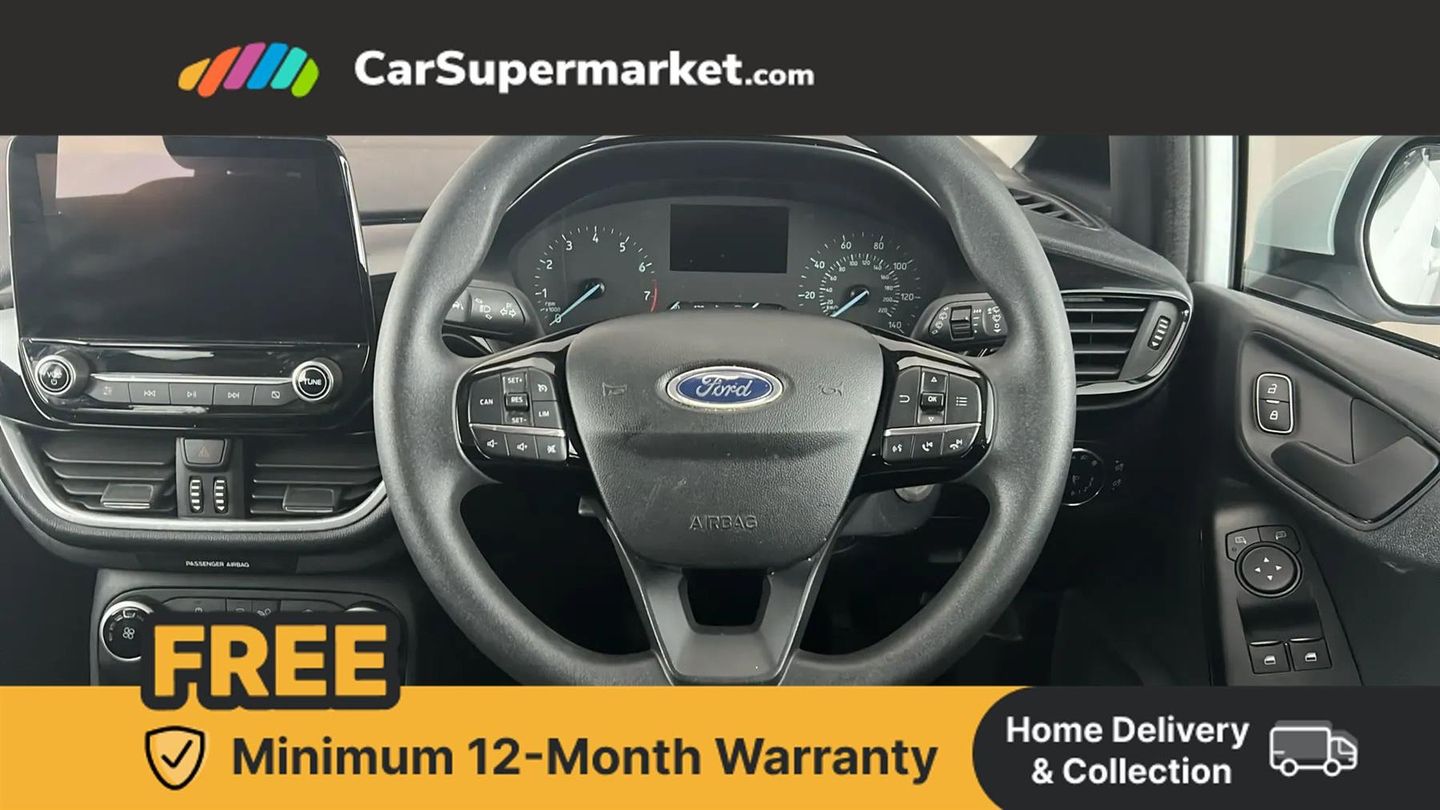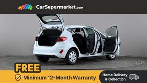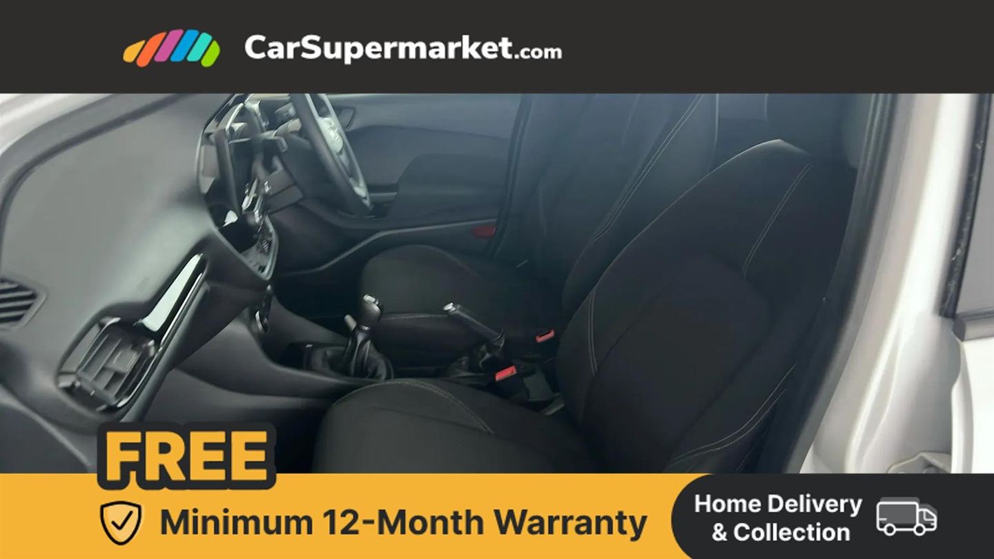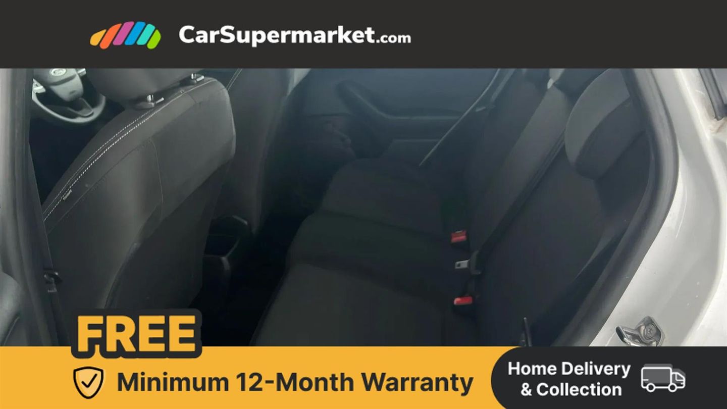 Bluetooth system,Electric power steering,Ford easy fuel,Trip computer,2 USB ports,Auxiliary input socket,DAB Digital radio,Ford SYNC includes 8" touchscreen, 6 speakers, apple carplay, android auto and emergency assistance,Steering wheel mounted controls,Body colour bumpers,Body colour door handles,Body colour rear spoiler,Chrome beltline trim,Electric front windows/one touch facility,Electric rear windows,LED projector low beam headlamps with LED daytime running lights,Mesh design front grille with chrome surround,Quickclear heated windscreen,Rear wiper,12V Accessory socket in centre console,60/40 split folding rear seat,Adjustable head restraints,Ambient lighting,Boot carpet,Chrome inner door handles,Cloth upholstery,Footwell illumination,Front map reading lights,Front seat and rear pockets,Illuminated glovebox,Load area light,Luxury woven headliner,Manual 2 way passenger seat adjust,Manual 4-way driver seat adjust,Manual air conditioning,Overhead console with sunglasses holder,Pollen filter,Rake/reach adjustable steering wheel,NCAP Pack - Fiesta,3 point seatbelts on all rear seats,ABS+EBA,Curtain airbags,Driver and passenger airbags,Drivers knee airbag,Electronic stability control with hill start assist,Front passenger airbag deactivation,Front side airbags,Tyre pressure monitoring system,MyKey system,Remote central locking & engine immobiliser,Thatcham Cat.1 alarm,16" 8 spoke alloy wheels with rock metallic machined finish,Tyre repair kit,Cloth - Black with Metal Grey Stitching,Frozen White,Parking Pack