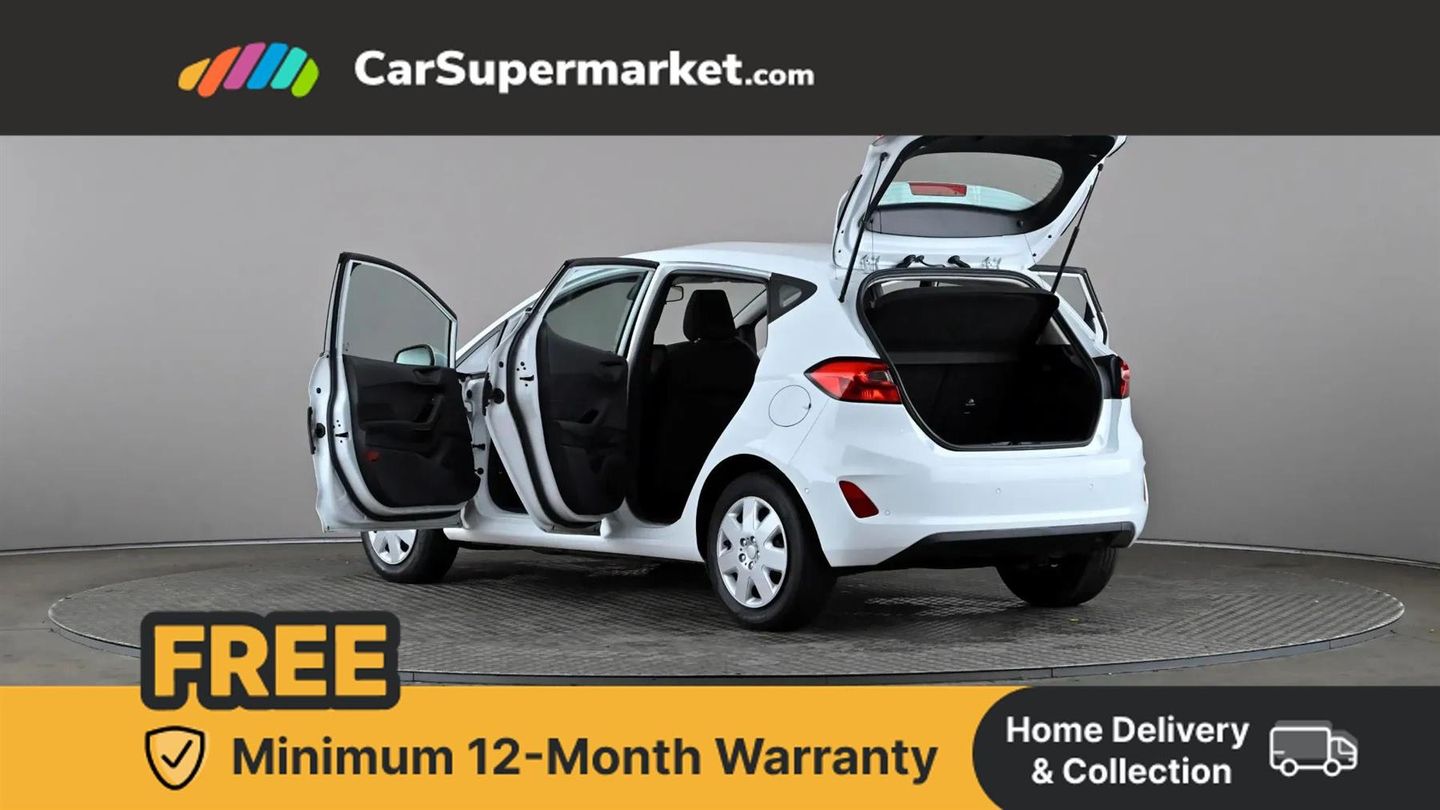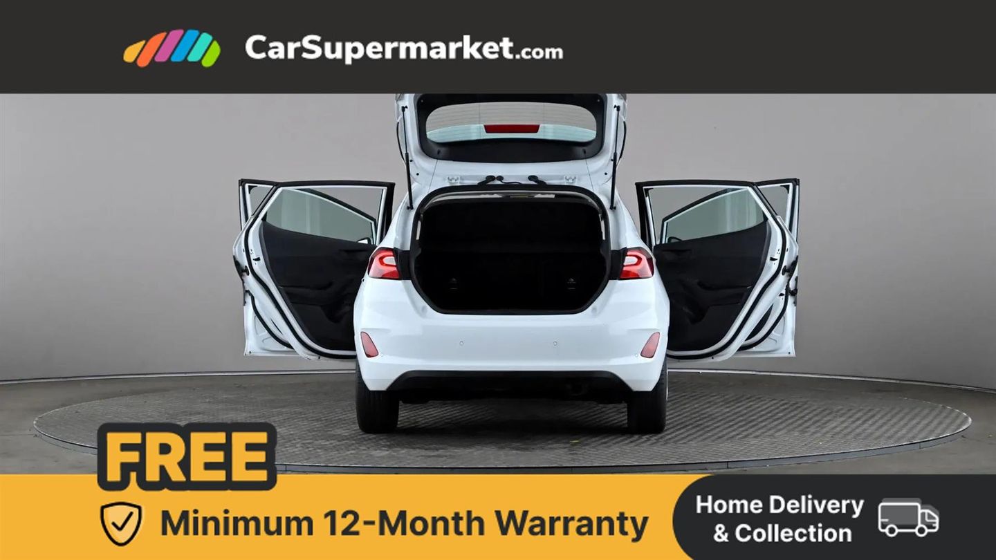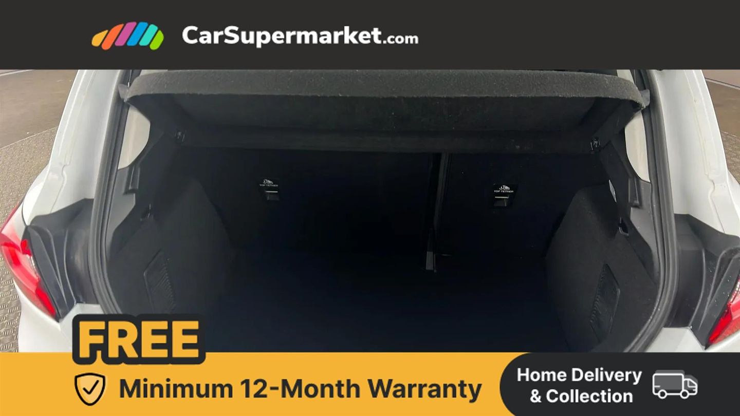 Bluetooth system,Electric power steering,Ford easy fuel,Trip computer,2 USB ports,Auxiliary input socket,DAB Digital radio,Ford SYNC includes 8" touchscreen, 6 speakers, apple carplay, android auto and emergency assistance,Steering wheel mounted controls,Body colour bumpers,Body colour door handles,Body colour rear spoiler,Chrome beltline trim,Electric front windows/one touch facility,Electric rear windows,LED projector low beam headlamps with LED daytime running lights,Mesh design front grille with chrome surround,Quickclear heated windscreen,Rear wiper,12V Accessory socket in centre console,60/40 split folding rear seat,Adjustable head restraints,Ambient lighting,Boot carpet,Chrome inner door handles,Cloth upholstery,Footwell illumination,Front map reading lights,Front seat and rear pockets,Illuminated glovebox,Load area light,Luxury woven headliner,Manual 2 way passenger seat adjust,Manual 4-way driver seat adjust,Manual air conditioning,Overhead console with sunglasses holder,Pollen filter,Rake/reach adjustable steering wheel,NCAP Pack - Fiesta,3 point seatbelts on all rear seats,ABS+EBA,Curtain airbags,Driver and passenger airbags,Drivers knee airbag,Electronic stability control with hill start assist,Front passenger airbag deactivation,Front side airbags,Tyre pressure monitoring system,MyKey system,Remote central locking & engine immobiliser,Thatcham Cat.1 alarm,16" 8 spoke alloy wheels with rock metallic machined finish,Tyre repair kit,Cloth - Black with Metal Grey Stitching,Frozen White,Parking Pack