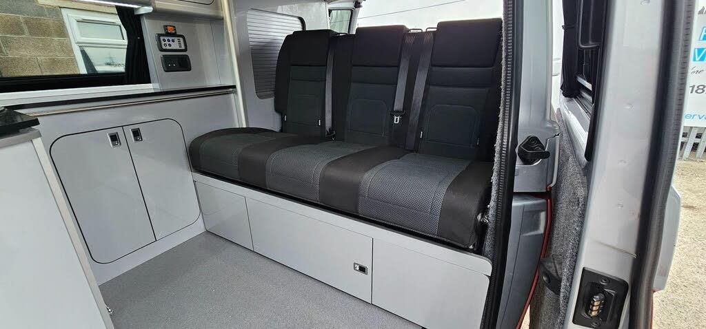 This superb vw T6 150bhp Highline campervan has is on the lookout for its new lucky owner.This van has fsh including cambelt. It has been fully health checked here and a new full service carried out along with mot ready for its new owner.What do you get for your money. Supplied with a 12 month 12000 mile motorhome warranty which gives both van and campervan warranty plus European breakdown cover New DSG flywheel just fitted also.This is a high standard converted campervan. The biggest plus point for a van of this size is it has a rib-bed type. This gives you the greatest width possible for sleeping and is made with factory seat comfort for the journeys ahead when travelling in rear. These aren't cheap beds and only seen in more upmarket conversions. It has full rear electrics and leisure battery power controlling rear lights, water pump, fridge. Your see a unusual design layout whereby the fridge is fully hidden by a cupboard which can act as a secondary fixed workspace or table but also allows the fridge to be used when bed is out.The van has a sink and hob making it fully usable as what I would call a weekender type camper although many people would utilise the drive away awning rail for longer stays away. The van has a Slimline pop up roof which can be used as a bed and also gives the user additional height when using the van during the day. The roof has a Allen key type fastening which is easier to secure and more appealing then the cheaper strap type hold downs. It has multiple lighting in the van and can also be used in the cover months with its rear diesel heater. Passenger seat is swivel and there are various storage cupboards throughout, blinds over all windows. The van also benefits with a lockable safe to keep your important valuables, documents secure. The van itself has factory nav, dab and Bluetooth,a rear reversing camera, cruise control, 150bhp of power a 7 speed dsg gearbox, electric windows, heated powerfold wing mirrors, upgraded led headlights giving great visabilty at night, alliy wheels, soft close side door, 2tone met paint-12mth wrnty,SH, DSG 150HP,AIR-Quality High specification Vans at Competitive prices backed by 5 star service.