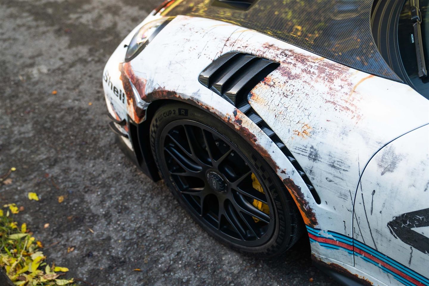 Distressed Martini Racing wrap (Carrara White underneath), Weissach package, Front axle lift, PCCB’s, 918 bucket seats, LED lights with PDLS+, BOSE stereo, Sport Chrono Plus package, Exterior mirror top half in Carbon, Guards Red instrument dials, Carbon interior trims, Aluminium look fuel cap, Centre storage lid in Alcantara with Porsche crest, Titanium roll cage, Upper part of windscreen tinted, Carbon illuminated door sills and 20/21″ Magnesium wheels.
