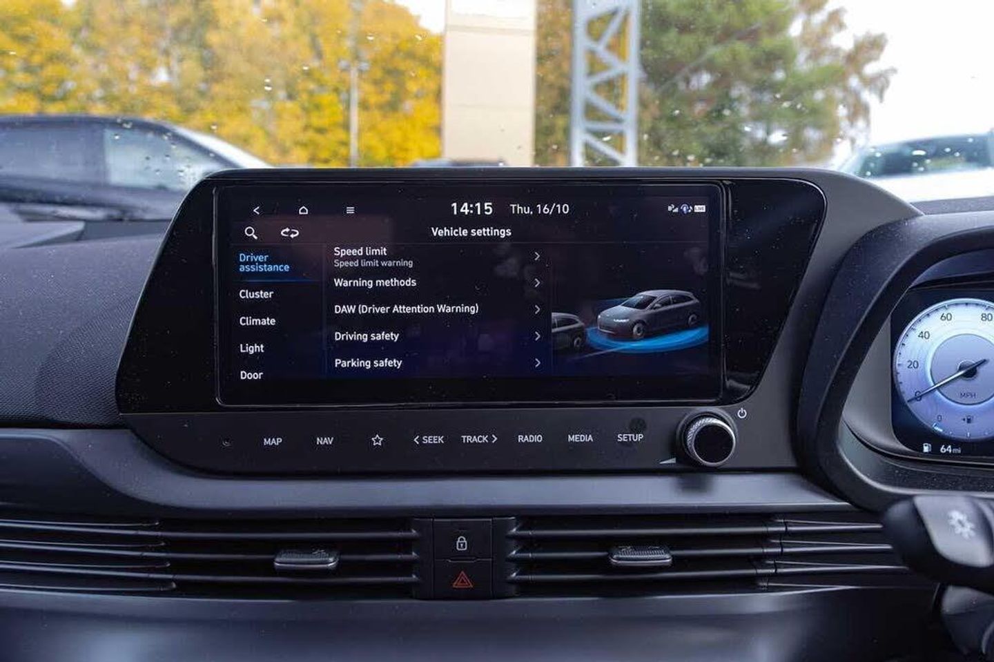 Privacy glass - Rear windows and tailgate, Rain sensor, Rear wiper, Front grille mesh pattern design, Rear side wing doors, Repositioned flat metal hyundai emblem, Automatic headlights with dusk sensor, High beam assist, LED 3rd brake light, LED daytime running lights, LED Headlights, LED taillights, ABS with front and rear diagonally split, Autonomous emergency braking, Front ventilated disc brakes, Rear solid disc brakes, Cruise control + speed limiter, Forward collision assist with car, pedestrian and cycle detection, Front parking sensor, Intelligent speed assist, Intelligent speed limit warning, Lane follow assist, Lane keep assist, MAP OTA updates, PAS, Rear parking sensor, Rear view camera with dynamic guidelines, Electric adjustable heated door mirrors, Electric folding door mirrors, 3x3 point rear seatbelts, Child locks on rear doors, Tyre pressure monitoring system, Floor mats, Automatic air conditioning, Cloth upholstery, Heated steering wheel, Leather steering wheel, Multi colour ambient lighting, 10.25'' touchscreen + navigation, 2nd Gen eCall, 8'' Touchscreen DAB Radio with android auto and apple carplay, USB C port front, USB C Port in rear, 3 seat bench in 2nd row, Adjustable head restraints, Heated front seats, Single front passenger seat, Trailer wiring, 17'' Alloy wheels, Tyre repair kit