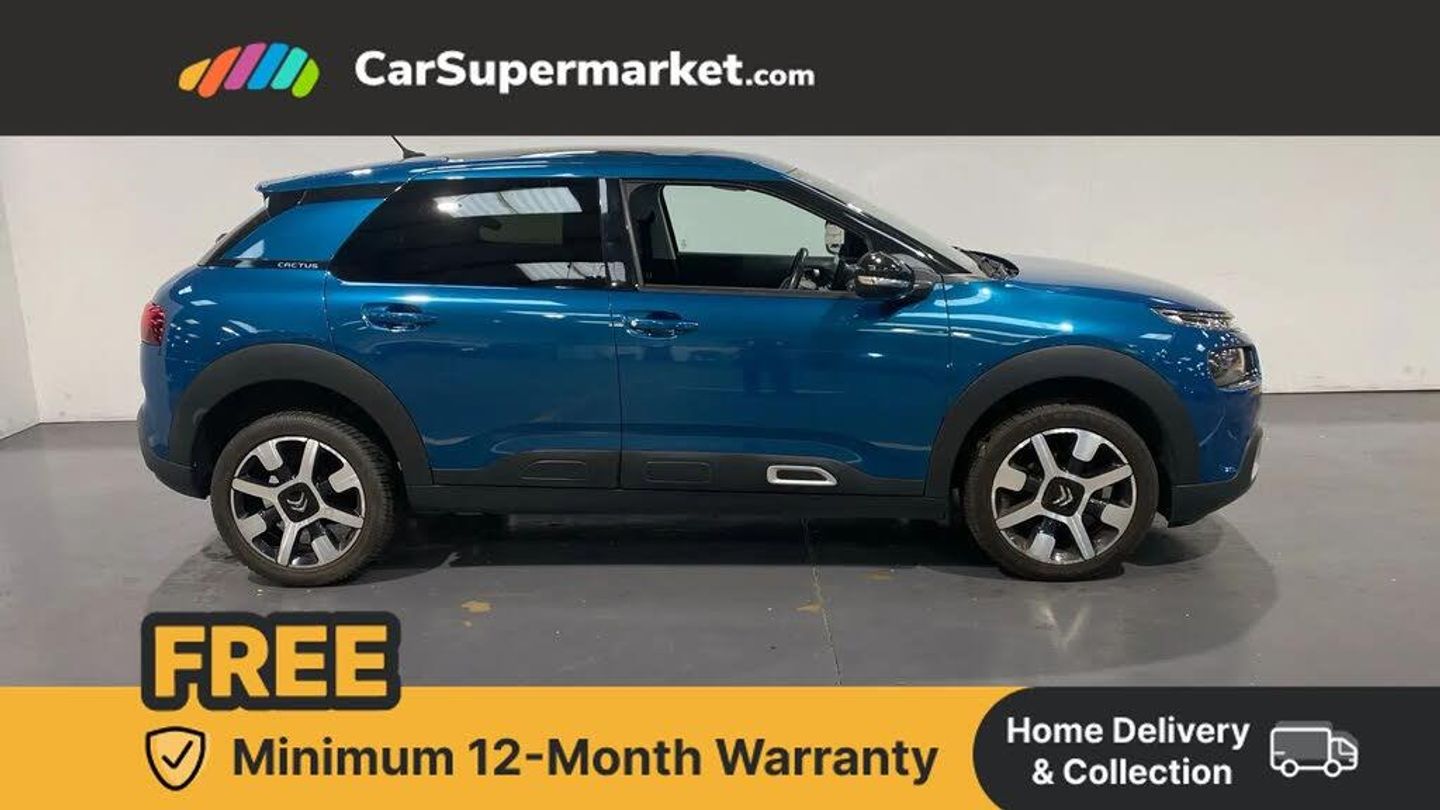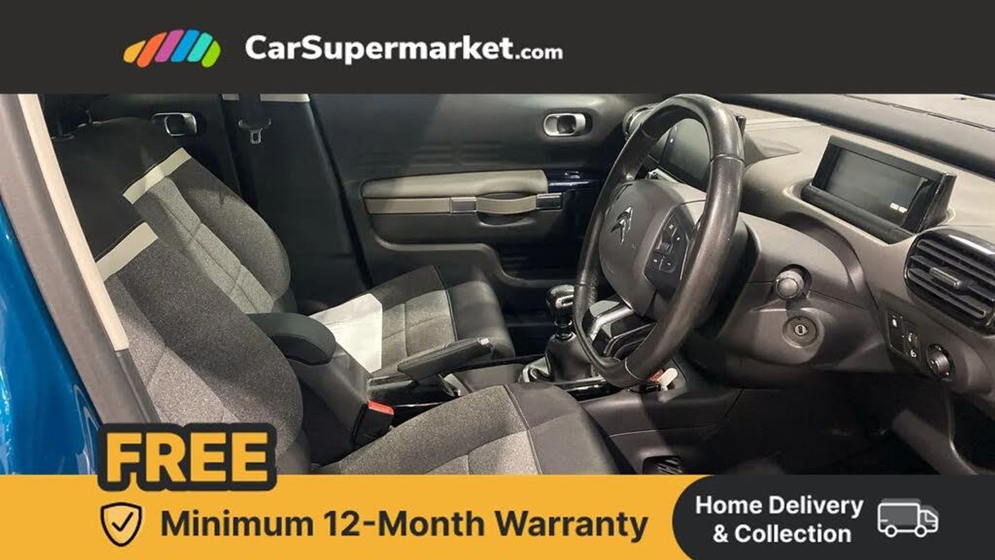 7" touch screen,Citroen connected nav with connect box and emergency assist system,Coffee Break Alert,Cruise control + speed limiter,Driver attention alert system,Electric power steering,Exterior temperature display with ice alert,Gear efficiency indicator,Lane departure warning system,Mirror Screen with Apple car play/Android Auto,Suspension with Progressive Hydraulic Cushions,Auxiliary input socket,Bluetooth handsfree and media streaming,DAB Digital radio,RDS radio with MP3 player and 6 speakers,USB socket,3D effect LED rear lights,Acoustic windscreen,Black airbump,Body colour door handles,Body coloured bumpers,Dark tinted rear windows,Electric adjustable/heated/folding door mirrors,Electric front windows - anti trap + one touch,Electrochrome rear view mirror,Front fog lights with cornering function,Gloss black rear insert with Cactus lettering,Halogen headlights with height adjustment,Hinged rear windows,LED daytime running lights,Magic wash,Rear wiper,Wheel arch extensions,1/3 to 2/3 split folding rear seats,12V socket in cabin,3 rear headrests,Driver seat lumbar adjustment,Driver's footrest,Front armrest,Front courtesy lights,Front head restraints,Front sunvisors with driver courtesy mirror,Height adjustable driver/front passenger seats,Larger front door pockets,Lashing eyes in boot,Leather steering wheel with integrated controls,Open storage towards top of rear doors,Reach + rake adjustable steering column,Rear door pockets with bottle holders,Rear garment hooks,Rear parcel shelf,Rear storage pockets,Semi raised centre console with two cup holders,Top box dashboard storage compartment,Two front cupholders,Two rear isofix mounting points,Wild cloth upholstery with advanced comfort seats,Auto pack - C4 Cactus,City camera pack with Rear parking sensor - C4 Cactus,Gloss black pack - C4 Cactus,3x3 point rear seatbelts,ABS with Electronic brakeforce distribution and Emergency braking assistance,Active safety brake,Airbags - Driver and front passenger with cut off device, front lateral and curtain,Electric child locks,Electronic stability control,Front seatbelt pretensioners with force limiters,Height adjustable front seatbelts,Hill start assist,Passenger airbag deactivate switch,Road sign recognition,Tyre pressure monitor,Unfastened seat belt warning on all seats,Alarm,Keyless entry and start,Locking wheel nuts,Remote central locking + deadlocks,Transponder immobiliser,Emerald Blue