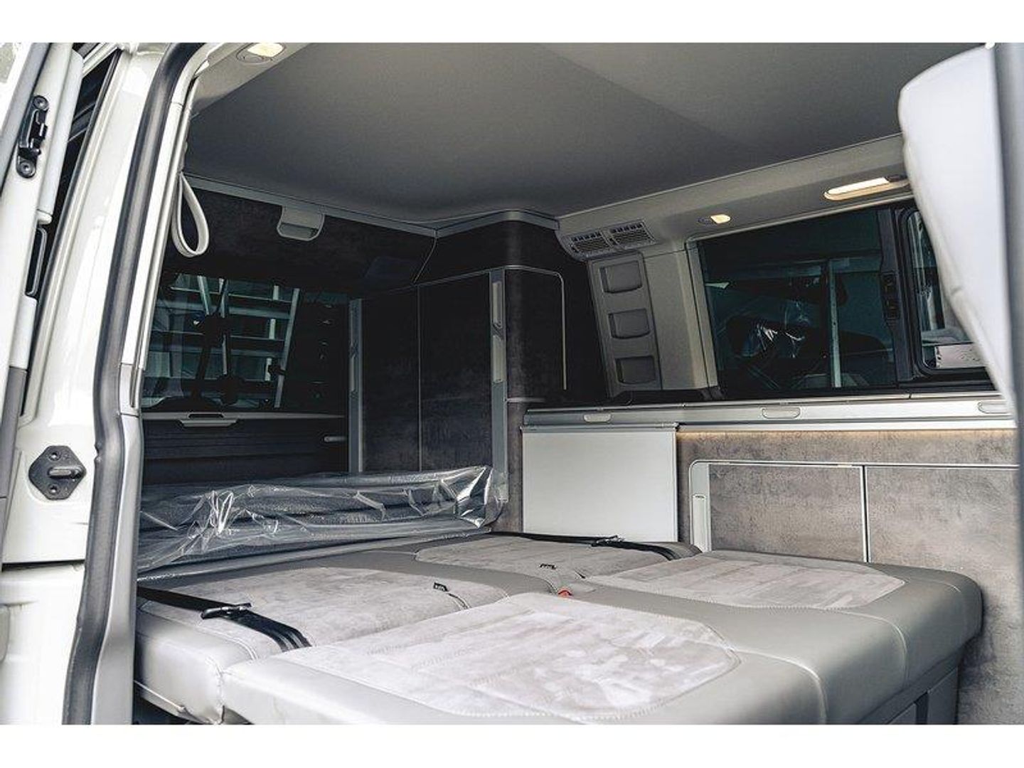 18in Alloy Wheels - 8J Palmerston,Art Velours Seat Centre Section and Leather Look Side Bolsters - Palladium-Titanium Black,Ascot Grey,Bed Extension with Comfort Sleeping Mat,Cupboards in Graphite Grey - Slate Effect with Outdoor Shower Connection,Navigation System Discover Media Pro including Streaming and Internet,Tyres 255-45 R18 103H XL - Super-Low Rolling Resistance, 230V External Inlet with Charging Feature for Vehicle Batteries and Internal 230V Outlet on the Side of the Kitchen Unit, 230V Inverter with Socket on Drivers Seat, eCall Emergency System, Navigation System Discover Media including Streaming and Internet, Two 12V Outlets - Dashboard, We Connect Plus, Wired and Wireless App Connect, Adaptive Cruise Control ACC including Front Assist and City Emergency Braking, Multi-Function Display Premium with Colour Display, Parking Sensors - Front and Rear with Park Assist, Rear View Camera, Tyre Pressure Loss Indicator, Washer Fluid Level Indicator, 17in Alloy Wheels - 7J Aracaju - Silver, Awning - Housing and Rail in Black, Body-Coloured Door Mirrors - Handles - Front and Rear Bumper, California Badge on the Front Wing and on the Rear, Door Mirrors - Electrically Adjustable and Heated and Folding, Electric Windows - Front, Electro-Hydraulic Elevating Roof, Heated Windscreen Washer Nozzles - Front, Lights and Vision Package, Locking Wheel Bolts, Mounting Rails on the Roof - Preparation for Movable Roof Rack, Privacy Glass with Heat Insulation, Radiator Grille Painted Black with 5 Chrome Trims - Additional Chrome Trim at Lower Radiator Grille, Rear Window - Insulating Glass with Rear Window Wiper and Washer System - Not Heated, Side Step Illumination with California Lettering, Sliding Window Above Kitchenette and Fixed Window in Rear Passenger Compartment - Right, Sliding Window in Front with Fly Screen and Fixed Window in Rear in Load-Passenger Compartment - Left, Sliding Window in Front with Fly Screen and Fixed Window in Rear in Load-Passenger Compartment - Right, Steel Spare Wheel with Original Equipment Tyre, Tailgate with Window and Power Latching, Tyres 215-65 R17 C 109-107T with Optimised Rolling Resistance, Automatic Headlight Activation with Separate LED Daytime Running Light with Manual Coming Home - Automatic Leaving Function, Automatic Headlight Range Control, Front Fog Lights with Cornering Lights, Headlights - LED with Separate LED Daytime Running Lights, Red LED Tail Light, 1 Waste Bin in Door Storage Compartment in Cab, Air Conditioning - 3-Zone Climatronic with 2nd Evaporator-Auxiliary Heater-Air Conditioned Headliner and Additional Passenger Control, Armrest for Both Cab Seats, Auto-Dimming Breakaway Interior Rearview Mirror, Bed Extension for Rear Bench Seat, Camper Control Unit, Camping Table for Inside-Outside - in Sliding Door - and 2 Folding Chairs in Tailgate, Comfort Dashboard with Chrome Elements and Bezels Finished in Black, Cupboards in Graphite Grey, Decorative Inserts - Pewter Wave Grey, Digital Cockpit and Driver Alert System, Gas Hob with Two Burners, Gas Storage Compartment - Takes 2.8kg Gas Cylinder and Includes Gas Pressure Regulator with Shut-Off Valve, Glovebox - Illuminated, Grab Handles on A-Pillars - on Driver and Front Passenger Side, Heated Driver and Front Passenger Seats, Illuminated Dash Instruments - Dimmable, Illuminated Sun Visors with Airbag Label on Front Passenger Sun Visor, Interior LED Lighting, Interior Lighting Concept for Camper - Comfort in Passenger Compartment, Loft Bed with Comfortable Sprung Base Mattress and Child Safety Net, Lumbar Support for Drivers and Front Passenger Seat - Manually Adjustable, Plastic Floor Covering, Sliding Door in Passenger - Compartment - Right, Soft-Folding Grab Handles on Roof Frame, Special Sound Deadening Measures in Cab and Passenger Compartment, Stainless Steel Sink with Height-Adjustable Tap and Removable Fitted Washing-up Bowl, Steering Wheel - Multifunction - Leather Trimmed, Swivel Seats for Driver and Front PassengHere we have our Volkswagen California Bulli edition finished in Ascot Grey.