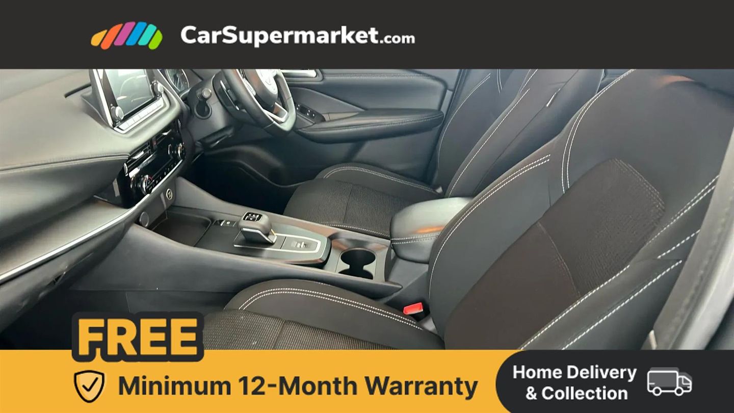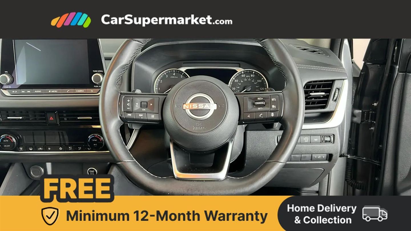 7" High definition full colour TFT screen combimeter,Android auto/Apple CarPlay (Wired),Blind spot warning,Drive modes (sport, normal, eco),Electric speed sensitive power steering,Emergency and breakdown call,Idle stop/start system,Intelligent Cruise control (ICC),Intelligent driver alert system,Intelligent forward collision warning,Intelligent lane intervention,Lane departure prevention,Lane departure warning system,Maximum speed limiter,Nissan connect 8" touchscreen infotainment system,Push button starter,Rear cross traffic alert,Rear parking sensors,Rear view camera,Traffic sign recognition with legal speed adjustment,Trip computer,6 speakers,AM/FM audio system with DAB,Bluetooth audio streaming,Front USB connections (Type-A and Type-C),Auto dimming rear view mirror,Auto rear wiper when reversing,Automatic hazard signal with emergency stop signal,Body colour mirror caps,Body coloured door handles,Bodyside mouldings,Chrome side window finisher,Door handle with button,Electric auto folding door mirrors,Electrically adjustable and heated door mirrors with LED turn indicator,Follow me home headlights,High beam assist,Intelligent auto headlights,LED 3rd brake light,LED daytime running lights,LED Headlights,LED rear lights,One touch front and rear electric windows with remote opening and closing,Partially body coloured bumpers,Rear reversing light (bulb lighting),Rear roof spoiler,Rear side wing doors,Shark fin antenna,Splash free rain sensing wipers,Three blink turn signal,12v power socket in dashboard and luggage,2x Rear coat hooks,3 bench rear seats in 2nd row,3 rear headrests,4 folding assist grip,6-way manually adjustable driver's seat,60/40 split folding rear seat bench,Centre console storage tray,Chrome interior door handles,Cloth monoform upholstery,Driver and front passenger sunvisors with illuminated vanity mirrors,Dual zone automatic climate control with pollen filter,Electrically adjustable lumbar support for driver,Front and rear door storage,Front centre console and armrest,Front cupholders x 2,Front door with bottle holders,Glovebox with light,Hard trunk cover,Height adjustable driver's seat,Height adjustable front headrests,Height adjustable passenger seat,Luggage space lighting,Manually adjustable passenger (slide recline + lifter),Multifunction steering wheel,Passenger seat back pocket,Rear armrest with 2 cupholders,Rear door bottle holders,Single front passenger seat,Steering wheel gearshift paddles,Steering wheel switches,Sunglasses holder,Tilt/telescopic adjustable steering wheel,Two rear isofix child seat anchorage points with top tether,3x3 point rear seatbelt pretensioners + load limiters,ABS with EBD and brake assist,Active brake limited slip,Auto hold function,Child locks on rear doors,Curtain and front side, far side airbags,Driver and passenger airbags,Driver, passenger and 2nd row rear seat belt reminder,Electronic parking brake,Front seatbelt pretensioners + load limiters,Height adjustable front seatbelts,Hill start assist,Intelligent blind spot intervention,Intelligent front emergency braking with pedestrian, cyclist recognition and junction assist,Intelligent rear automatic braking,Tyre pressure monitoring system,Vehicle dynamic control,Capless fuel filler,Engine immobiliser,Intelligent Key,Remote central door locking with deadlocking,Thatcham Cat.1 alarm,Interior instrumental panel A finisher,17" Alloy wheels,Tyre puncture repair kit,Gun Metallic