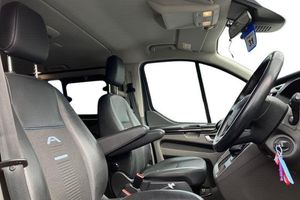 Audio controls mounted on steering wheel, Voice control system, Power front windows with one shot up/down, 'Guide me home' headlights, Front door map pockets, Driver and passenger storage bins on facia with lids, Facia mounted tray with pen holder and cupholders, Rain sensing wipers, Body colour door and tailgate handles, Remote central locking, Driver's airbag, Full moulded headlining, PAS, Twin sliding side load doors, Alternator - 150A, Carpet floor covering in passenger compartment, Category 2 immobiliser, Isofix child seat attachments - centre and offside 2nd row seats, 3rd Row left and right fixed windows, Fixed rear window, Anti-lock brake system, Rear side window blinds, Twin bottle holders, Accent colour exterior mirror finish, Reclining rear seats, Trans linked rear washer/wiper, Header mounted package tray, Diesel particulate filter, Tool kit, Tutone painted plastic rear bumper, Height and reach adjustable steering wheel, Tyre pressure monitor, Front bumper with body colour lower accent, 2 Speed wipers with electric wash, Configurable Unlocking, Front passenger airbag with deactivation, 3 point seatbelts for all seats, Load compartment interior light, Height adjustable head restraints, Body colour front and rear bumpers, Manual air conditioning, Lockable glove box lid, Silver roof rails, Leather gearknob, Front seatbelt pretensioners, Passenger sunvisor, Passengers side open storage, Rear auxilliary power point socket, Header mounted courtesy lights - 2 map lights, Heated rear window, Anti-theft perimeter alarm system, Rear compartment, Driver and passenger seatbelt reminder, Power socket in drivers stowage bin, heating, Rear seat climate control, Extended length running boards, Trip computer, Map reading lights, Coat hook, Battery saver, Illuminated footwell, Aux input socket, Rear armrest, Low roof line, Roll stability control, Side wind mitigation, 10 speakers, Rear splash guard, Front and rear wheel arch extensions, Unique active style front grille, Colour keyed grille with satin nickel insert, 17 Mini spare wheel, Leather seats with unique bossing, Embedded modem, Brakes - ESP/HLA/FBS, Rear cargo liftgate door, Locking wheel lug nut, Silver roof rack without crossbars, Wide bodyside body coloured moulding, Colour keyed exterior pack 4 - Tourneo custom, Interior trim accent pack E - Tourneo custom, Door entry remote control unit 2 Fobs key, 17 5 Spoke alloy mach wheels, Electric rear window defroster, Single passenger seat pack 8A - Tourneo Custom, Front splash guard, SHORT WHEEL BASE, Minibus, ULEZ COMPLIANT, ULEZ, NATIONWIDE DELIVERY AVAILABLE, EURO 6
