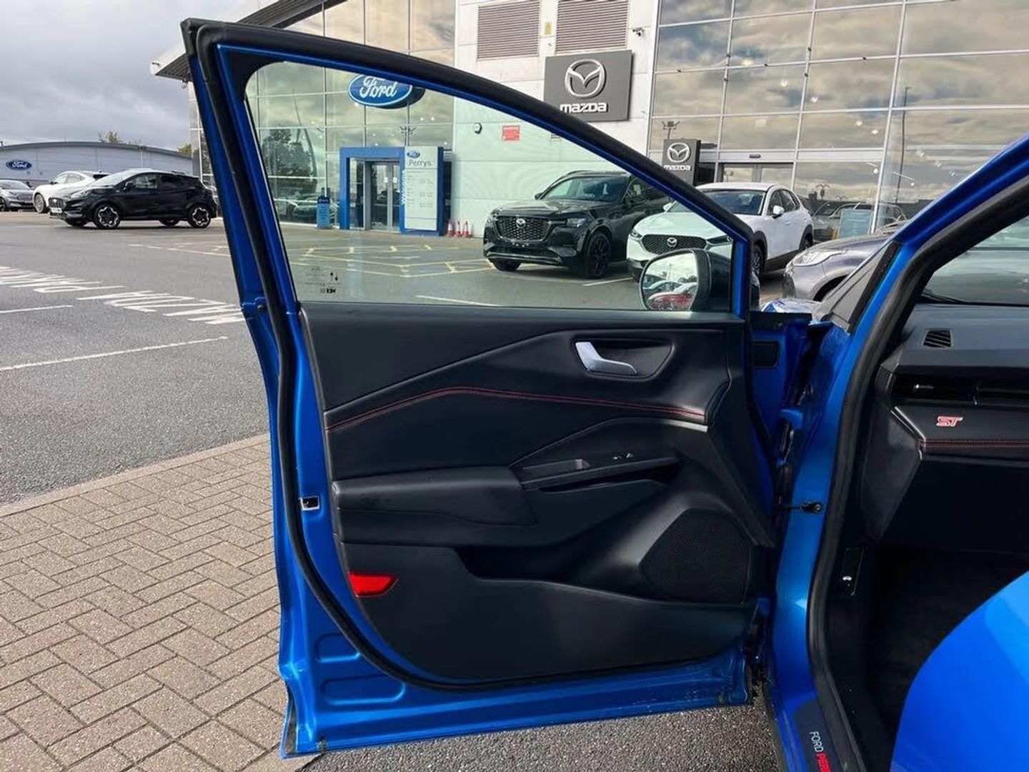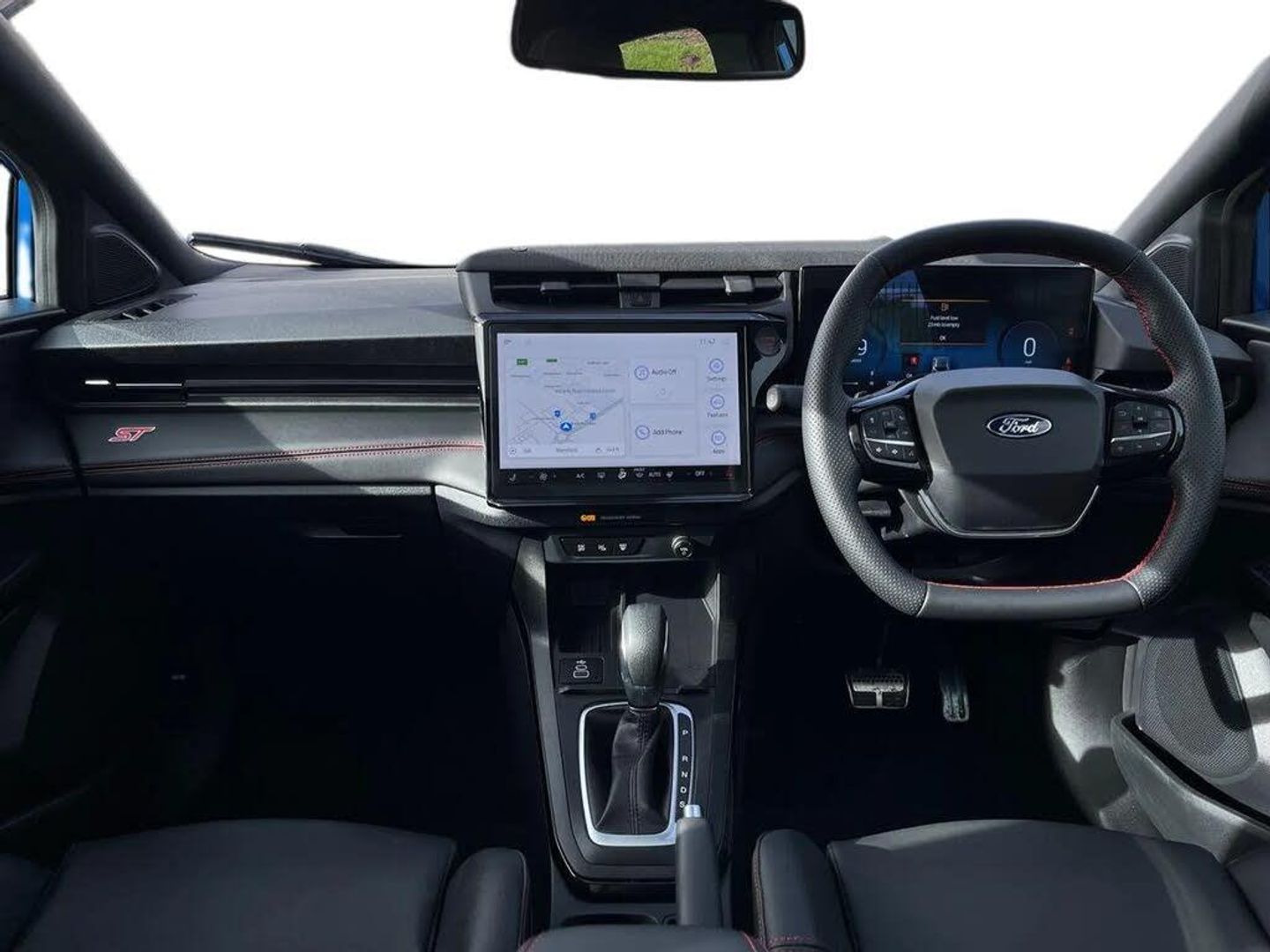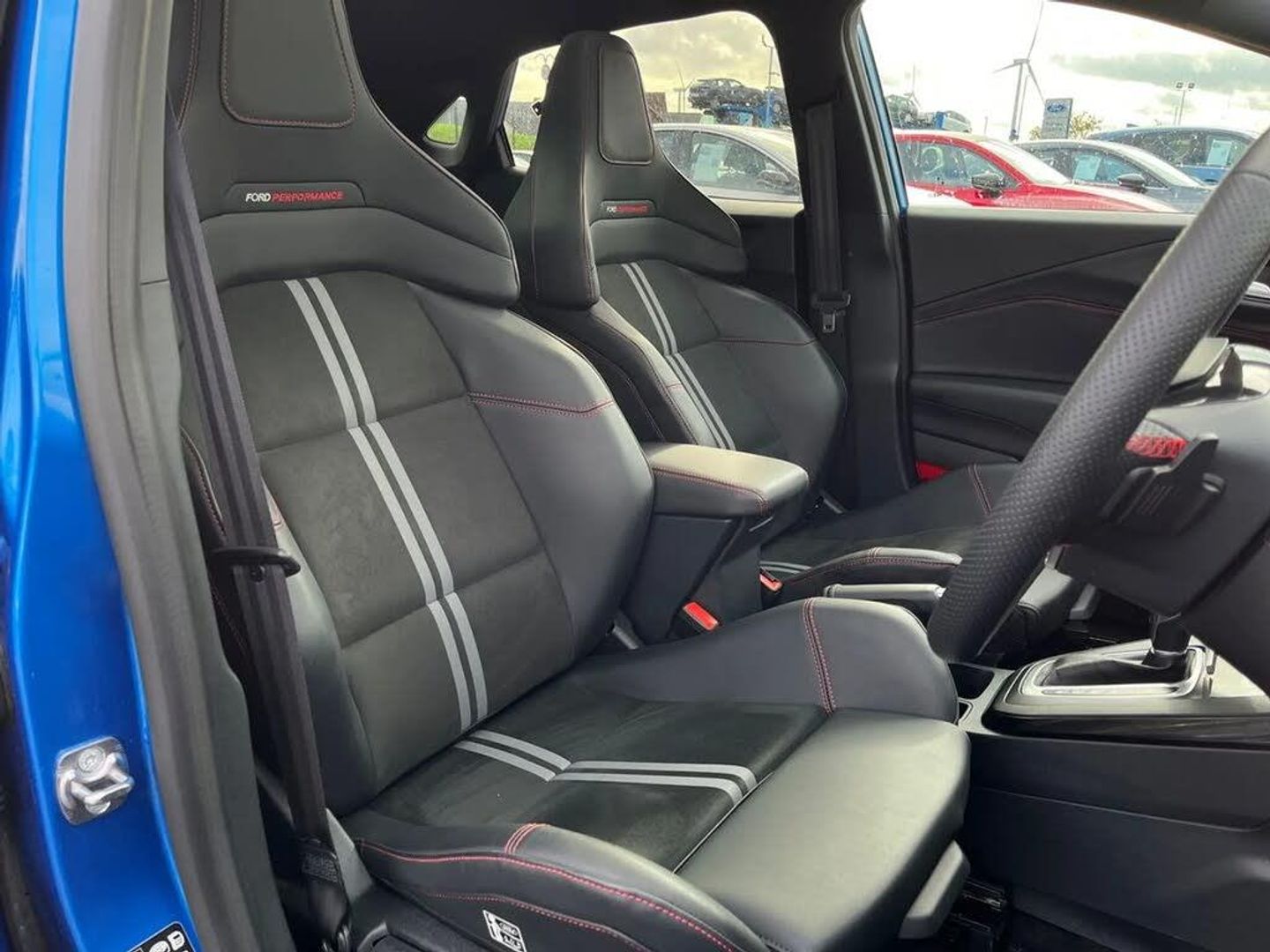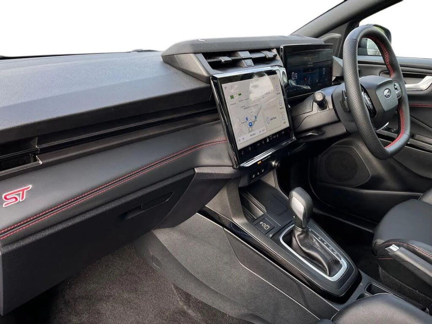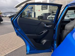 Driver impairment monitor,Emergency call service,Ford easy fuel,Full digital 12.8" instrument cluster,Lane keeping aid with lane departure warning,Power assist steering,Power lift tailgate,Selectable drive modes (normal, sport, eco, track),Speed sign recognition,ST suspension,12" landscape touchscreen display with wireless apple car play and android auto premium B&O audio system with 10 speakers,Ford pass connect and emergency assistance,Ford SYNC4 with connected navigation,Automatic headlights with rain sensing wipers and auto high beam,Front fog lamps,Glare-free matrix LED headlamps,LED daytime running lights,LED rear lamps,LED third brake light,Power foldable heated door mirrors with puddle lamps and puma logo protection,Quickclear heated windscreen,Rear privacy glass,Rear side wing doors,Rear wiper,Unique ST body styling kit including wing mirrors and Ford Performance embossed splitter,3 seat bench in 2nd row,Centre console with armrest and stowage,Electronic automatic temperature control (EATC),Ford megabox extended bootspace,Ford Performance seats premium synthetic leather upholstery,Front and rear head restraints,Front floor mats,Manual 6 way driver seat adjust with lumbar adjustment,Manual 6 way passenger seat with lumbar seat adjustment,Single front passenger seat,ST flat bottomed steering wheel with metal grey stitching,Driver assistance pack with blind spot information system - Puma for automatic transmission,Winter pack - Puma,3 rear seatbelts,Child safety lock,Electronic stability control (ESC) and hill start assist,Pre-collision assist with autonomous emergency braking, pedestrian/cyclist detection & post-collision braking,Red brake calipers,Tyre pressure monitoring system (TPMS),Keyless entry and power start button,Keyless start and wireless charger,Thatcham alarm,19" alloy wheels with magnetite dark finish,Tyre inflation kit,Panorama Roof - Power Opening,Premium Synthetic Leather - Synthetic Suede Inserts - Red Stitching - Black