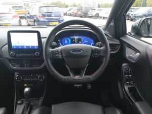 19" 5 Spoke magnetite dark finished alloy wheel, Full digital 12.3" instrument cluster, B&O Premium Audio system + Ford SYNC 3 navigation pack - Puma, Winter pack - Puma, Cruise control with Intelligent speed assist, Lane keeping aid with lane departure warning, Automatic headlights with auto high beam, Automatic rain sensing wipers, Power foldable heated door mirrors with puddle lamps and puma logo protection, Unique ST body styling kit including wing mirrors and Ford Performance embossed splitter, Quickclear heated windscreen, Manual 6 way driver seat adjust with lumbar adjustment, Manual 6 way passenger seat with lumbar seat adjustment, Ford Performance sensico partial premium leather upholstery with metal grey stitching, Wireless charging pad with electronic air temperature control (EATC)