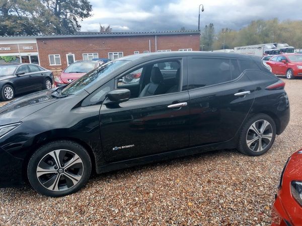 Apple car play/Android Auto,Intelligent Cruise control (ICC),Nissan connect sat nav system,Push button starter,Speed limiter,Speed sensitive power steering,Telematics system,Trip Computer,Voice control system,6.6 kW onboard charger,6.6kw charger,EVSE charging cable,6 speakers,Steering wheel mounted audio/telephone controls,Auto dimming rear view mirror,Automatic activation of hazard warning lights,Black side pillars,Chrome door handles,Electric front/rear windows,Electrically adjustable and folding door mirrors,Follow me home headlights,Front fog lights,LED rear lamps,Rain sensor,Rear privacy glass,60/40 split folding rear seat,Climate Control,Fabric/leather upholstery,Front head restraints,Front seatback pocket,PTC (Positive Temp Co-efficent) heater,Quick charge port,Rear assist grips,Rear head restraints,Rear heater duct,Tilt adjustable steering wheel,3 point front seatbelts with pre-tensioners,3x3 point rear seatbelts,Driver and passenger airbags,Front seatbelt pretensioners + load
