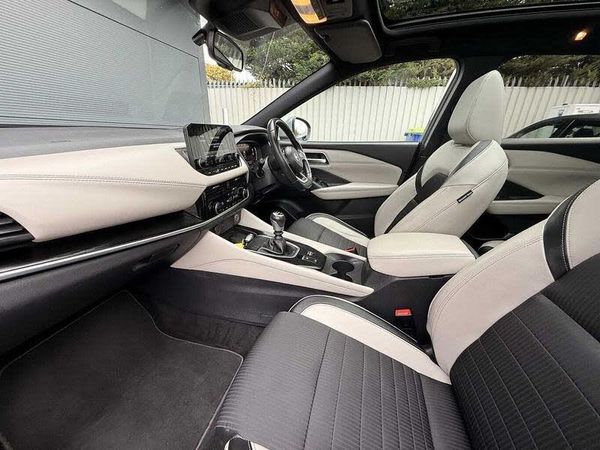 Exterior Features, Pearlescent paint, Paint - Pearlescent, Pearl - Ceramic grey, Trim - Part Leather, Cloth/syntech leather monoform - Light grey, Exterior Features, Auto rear wiper when reversing, One touch front and rear electric windows with remote opening and closing, Privacy glass, Splash free rain sensing wipers, Super UV and infrared cut glass, Thermaclear heated windscreen, Body coloured door handles, Bodyside mouldings, Chrome side window finisher, Door handle with button, Fixed panoramic glass roof with electric sunshade, Partially body coloured bumpers, Rear bumper with graphite insert, Rear roof spoiler, Rear side wing doors, Rear styling plate, Roof rails, Shark fin antenna, Automatic hazard signal with emergency stop signal, Dusk sensor, Follow me home headlights, Front and rear LED turning signals, Intelligent auto headlights, LED daytime running lights, LED rear lights, Rear reversing light (bulb lighting), Three blink turn signal, Safety, ABS with EBD and brake assist, Active brake limited slip, Auto hold function, Electronic parking brake, Hill start assist, Intelligent blind spot intervention, Intelligent front emergency braking with pedestrian, cyclist recognition and junction assist, Intelligent rear automatic braking, Vehicle dynamic control, Blind spot warning, Drive modes (sport, normal, eco), Electric speed sensitive power steering, Front and rear parking sensors, Intelligent around view monitor, Intelligent Cruise control (ICC), Intelligent driver alert system, Intelligent forward collision warning, Intelligent lane intervention, Lane departure prevention, Lane departure warning system, Moving object detection, Rear cross traffic alert, Rear view camera, Traffic sign recognition with legal speed adjustment, Auto dimming rear view mirror, Body colour mirror caps, Electric auto folding door mirrors, Electrically adjustable and heated door mirrors with LED turn indicator, 3x3 point rear seatbelt pretensioners + load limiters, Child locks on rear doors, Curtain and front side, far side airbags, Driver and passenger airbags, Driver, passenger and 2nd row rear seat belt reminder, Front seatbelt pretensioners + load limiters, Height adjustable front seatbelts, Tyre pressure monitoring system, Audio / Communications, Android auto/Apple CarPlay (Wired), Wireless apple carplay, Wireless charging pad, 6 speakers, AM/FM audio system with DAB, Bluetooth audio streaming, Front USB connections (Type-A and Type-C), Rear USB charging only ports (Type-A and Type-C), Driver Convenience, Hands free power tailgate, Idle stop/start system, Push button starter, Miscellaneous, Emergency and breakdown call, Full Digital 12.3 inch TFT Digital Combimeter, Google maps services - search, weather, 3D maps and Google street view, Nissan connect 12.3 inch touchscreen infotainment system, Nissan connect navigation, Remote control services - door locks, lights, horn and car locator, Telematics - notifications and connectivity services, TomTom live traffic services, Trip computer, Virtual personal assistant and firmware over the air capability, Trim, Interior instrumental panel C finisher, 2 way electrical driver lumbar adjustment, 3 bench rear seats in 2nd row, 3 rear headrests, 60/40 split folding rear seat bench, 8 way electric adjustable drivers seat, Driver seat back pocket, Heated front seats, Height adjustable front headrests, Height adjustable passenger seat, Manual lumbar support on passenger seat, Manually adjustable passenger (slide recline + lifter), Passenger seat back pocket, Single front passenger seat, Two rear isofix child seat anchorage points with top tether, Interior Features, Dual zone automatic climate control with pollen filter, 12v power socket in dashboard and luggage, 2x Rear coat hooks, 4 folding assist grip, 6 Luggage hooks - 4 on floor, 2 on side, Centre console storage tray, Chrome interior door handles, Cloth/syntech leather monoform upholstery, Dark black/blueish PVC wrapping, Dark headlining, Front and