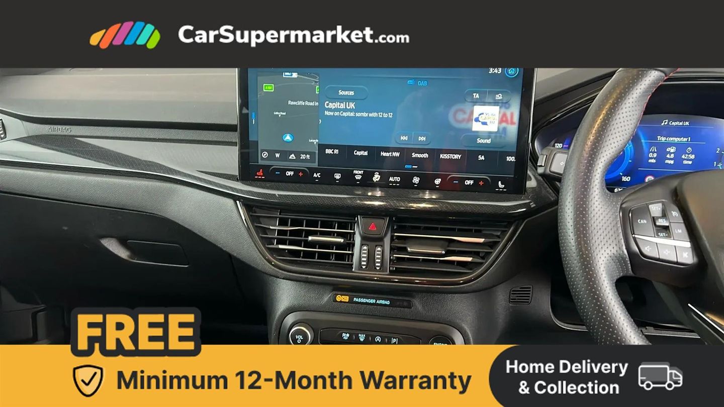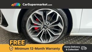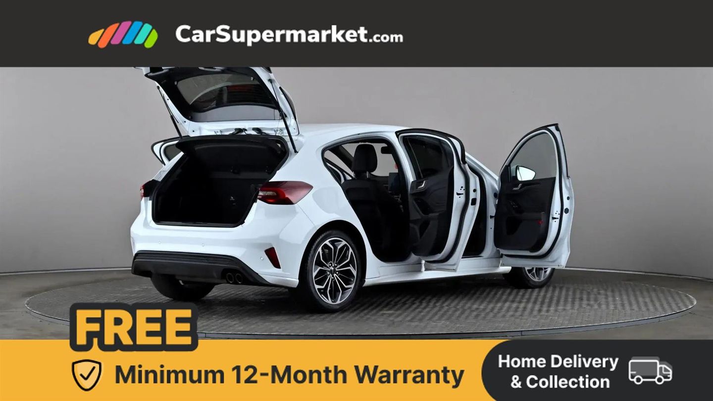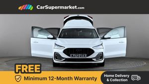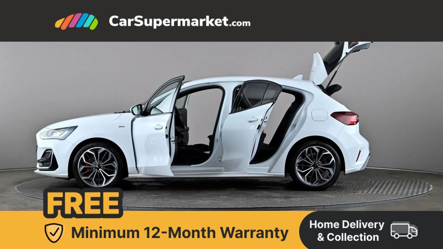 12.3" Digital instrument cluster,Bluetooth system,Digital clock,Easy fuel capless refuelling system,Eco mode,Ford SYNC4 Nav with 13.2'' touchscreen, DAB, Emergency Assistance, Apple Carplay & Android Auto, B&O Premium Audio with 10 speakers, FordPass Connect,Lane keeping system - lane keeping alert and lane keeping aid,PAS,Rev counter,Selectable drive mode,Service interval indicator,Trip computer,Wireless charging pad,Sports tuned suspension,2 USB ports,Auto headlamps (on/off),Body coloured door handles,Electrically operated front and rear windows with one touch opening and closing,Electrically operated heated power fold door mirrors with puddle lamp with side indicators,Front variable intermittent wipers with electric wash,Heated rear window,LED daytime running lamp,LED rear lamps,LED third brake light,Polished twin tailpipe,Privacy glass,Quickclear heated windscreen,Rain sensor,Rear side wing doors,Tailgate wash/wipe,Unique ST-Line grille, full bodystyling kit, and large body coloured rear spoiler,3 rear headrests,3 seat bench in 2nd row,Dual zone electronic air temperature control,Full sensico premium upholstery,Height adjustable front headrests,Isofix child seat preparation,Load through ski hatch,Manual 4-way passenger seat adjusts,Power 4-way driver seat adjust, with power lumbar adjust,Reach + rake adjustable steering column,Single front passenger seat,Winter pack - Focus,3x3 point rear seatbelts,ABS+Electronic Brake force Distribution,Auto hold function,Driver airbag,EDL traction control,Electronic parking brake,Electronic stability control,Front and rear seatbelt reminder,Front inertia reel height adjustable seatbelts with pre-tensioners,Front passenger airbag,Front side airbags,Passenger airbag deactivate switch,Post collision braking,Pre collision assist with autonomous emergency braking and pedestrian/cyclist detection,Red brake calipers,Remote/power child rear door locks,Side curtain airbags,Three rear inertia reel lap/diagonal seatbelts,Tyre pressure monitoring system,Keyless entry and keyless start,MyKey system,Remote central locking & engine immobiliser,Thatcham alarm with power door dead locks,18" 5x3 spoke pearl grey high gloss machined finish alloy wheels with mini spare wheel,Frozen White,Full Sensico - Ebony with Red Stitching