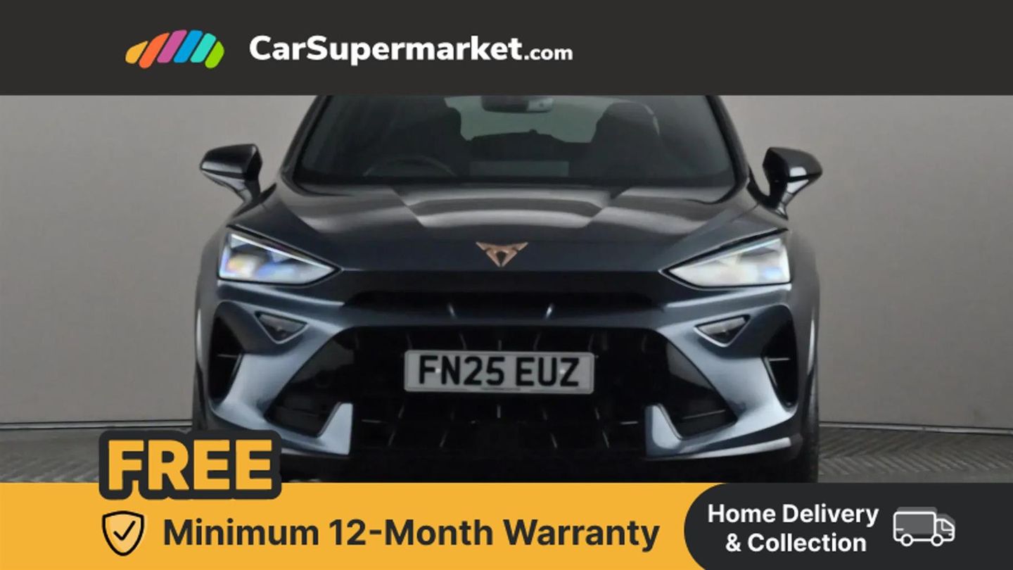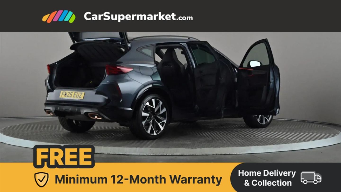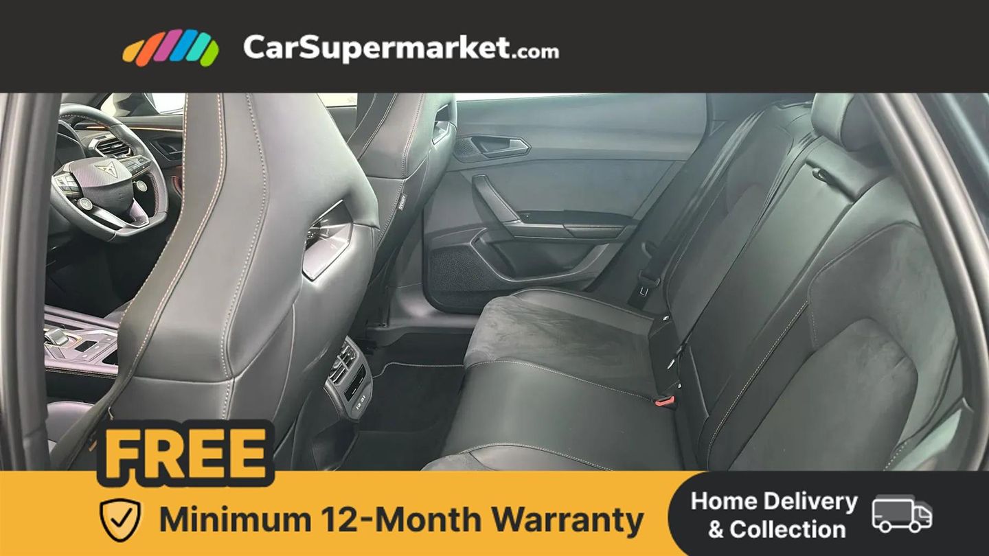 10.25" digital cockpit and configurable dashboard,Adaptive cruise control with follow-to-stop and speed limiter,Advanced driver alert system,Driving profile selection,Dynamic road sign display,Emergency steering support with turn assist,Forward collision warning with automatic braking,Front and rear parking sensors,Full link phone integration,Lane assist,Progressive steering,Rear view camera,RPM, trip computer, outside temp gauge, instrument light brightness, low fuel warning light, lights on reminder, gearshift indicator,Service interval indicator,Start/stop system with regenerative braking,Virtual pedal and electric tailgate,Voice control system,Wired Android Auto,Wireless apple carplay,Wireless phone charger,10 amp mode 2 charging cable,32 amp mode 3 charging cable,CUPRA sport suspension,Electronic locking differential and dynamic traction support,2 front and 2 rear USB type C sockets,Media system with navigation, 12.9" touchscreen display, voice control, DAB, steering wheel mounted controls,Auto dimming rear view mirror,Body colour door handles,Body coloured bumpers,Dark grey wing mirror,Daytime running light with automatic headlight control and coming home feature,Door panel ambient lighting,Dynamic headlight range control,Electric front/rear windows,Electrically adjustable heated and folding door mirrors with memory function,Gloss black roof rails and window surrounds,High beam assist,LED 3rd brake light,LED front fog lamps with cornering function,LED Headlights,LED Taillights with dynamic indicator,Rain sensing wipers,Rear diffuser with copper simulated exhaust pipes,Rear fog lights,Rear side wing doors,Rear wash/wipe,Tinted rear windows,Welcome lights (within exterior mirror housing),12V socket,2 front and 2 rear reading lights,3 seat bench in 2nd row,60/40 split rear bench seat with armrest and mechanical seat release,Black headlining,Black interior roof lining,Cupra sports pedals,Dust/pollen filter,Electrically adjustable front seats with lumbar support and memory function,Front and rear head restraints,Front centre armrest,Heated front seats,Heated supersports multifunction leather steering wheel with satellite buttons and gear shift paddles,Height/reach adjust steering wheel,Illuminated aluminium doorsteps,Illuminated interior front door sills,Illuminated sunvisor with mirror,Isofix,Leather dashboard, door insert and side trim panel,LED smart wraparound lighting,PVC/Dinamica microfiber upholstery + bucket seats,Satellite steering wheel,Single front passenger seat,Storage pockets on rear of front seats,Three zone climate control with control panel in rear,3 point seatbelts on all rear seats,ABS,Brake control system - ESC and brake booster,Child proof door locks,Driver and front passenger airbags with front passenger airbag de-activation,Electronic parking brake,Front and rear disc brakes,Front side curtain airbags,Hill hold control,Public e-call,Seat belt reminder for front and rear seats,Tyre pressure monitoring system,Anti theft alarm system,KESSY Advanced - Keyless start, keyless entry with SAFELOCK,Locking wheel bolts,Copper and aluminium interior detailing,19" Sandstorm machined sport black and silver alloy wheels,Breakdown and tool kit,Magnetic Tech Grey