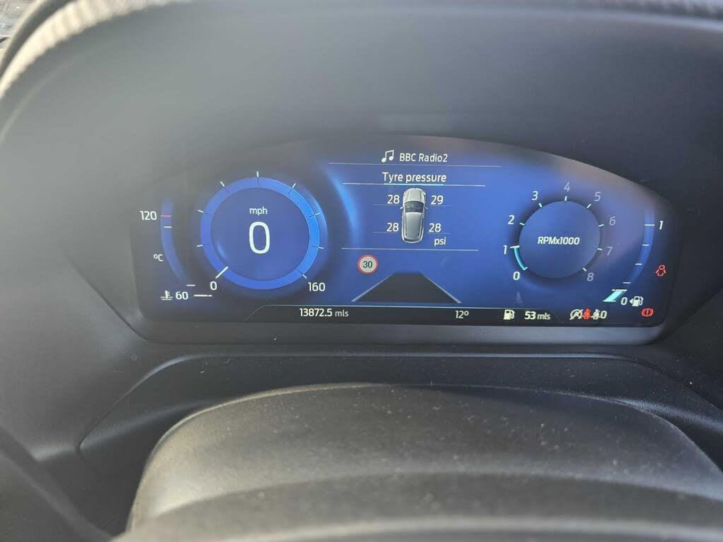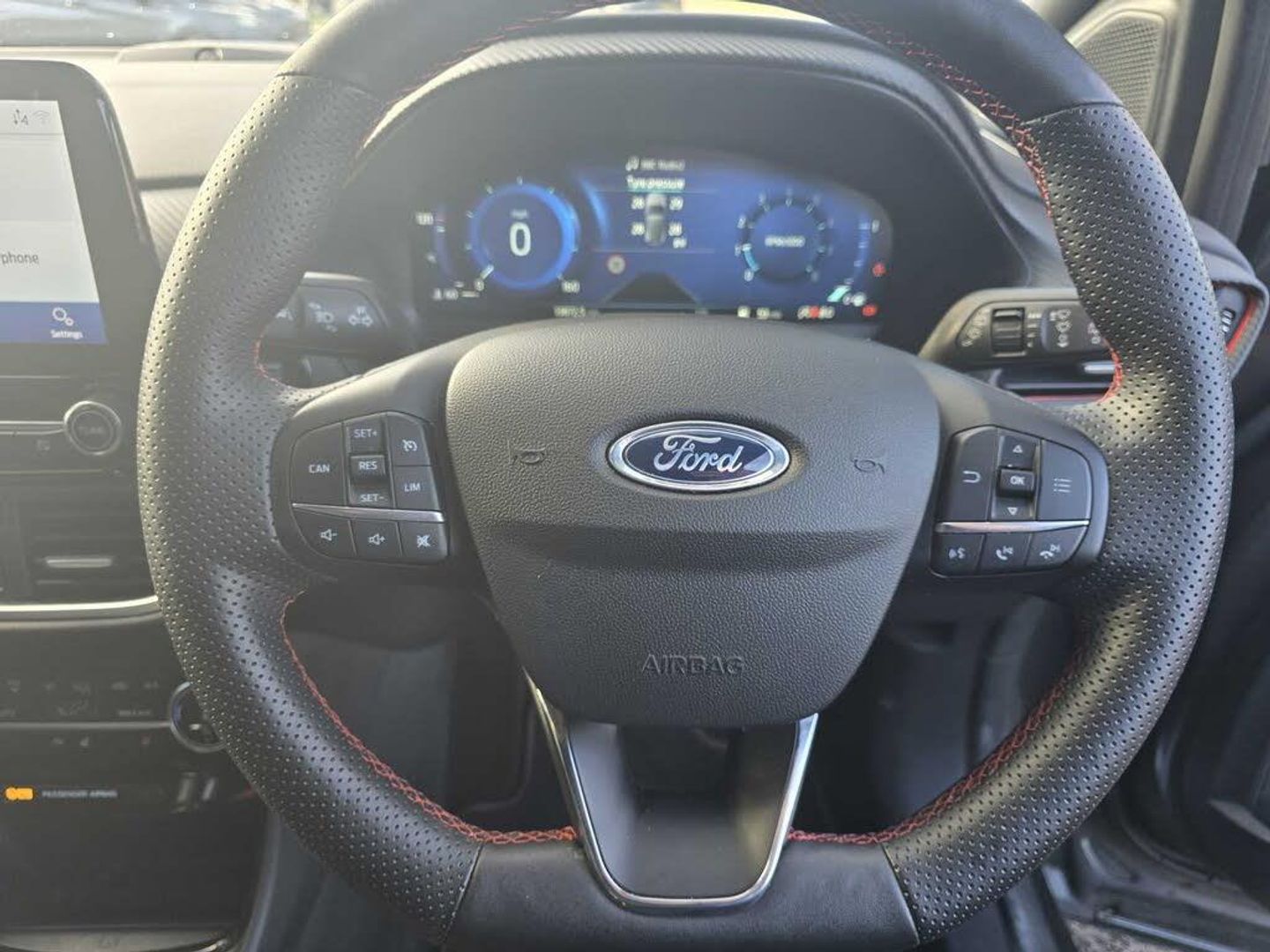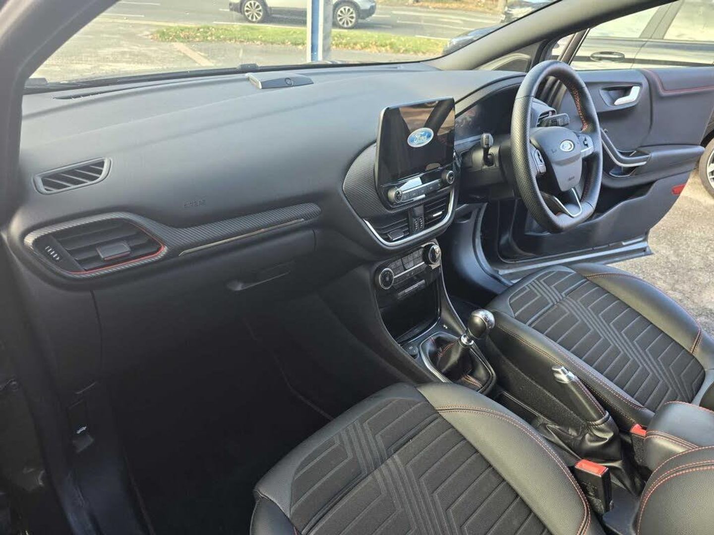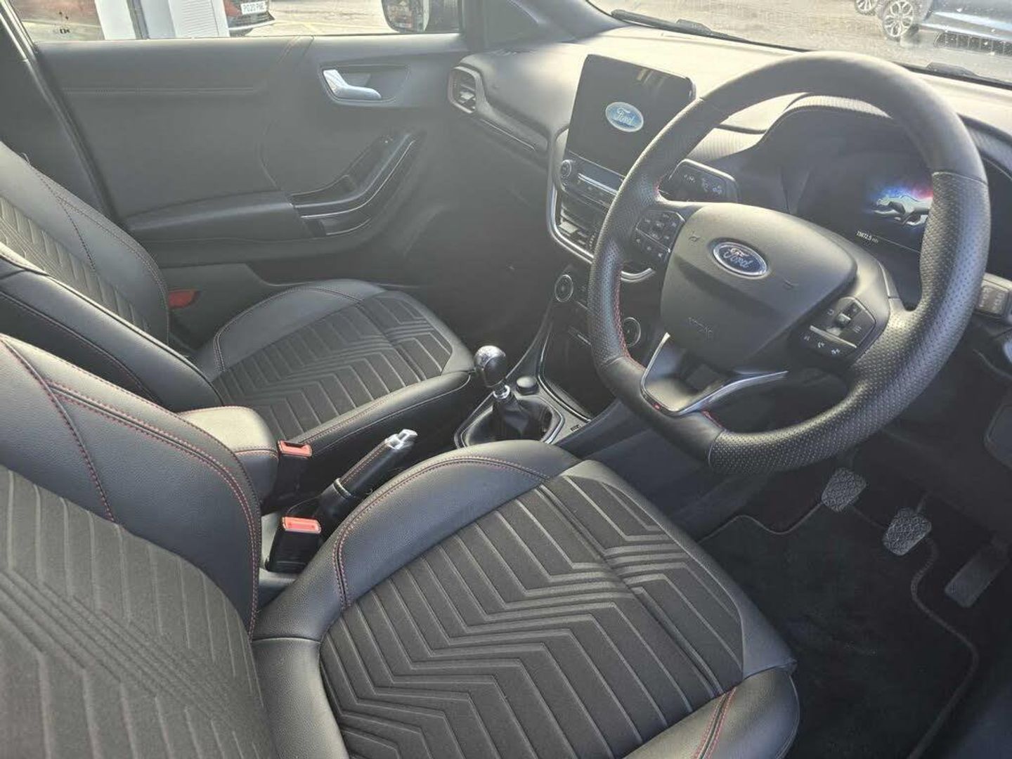 Driver impairment monitor, Emergency call service, Ford easy fuel, Full digital 12.3" instrument cluster, Lane keeping aid with lane departure warning, Power assist steering, Power start button, Rear parking sensor, Selectable drive modes(Normal, sport, Eco, trail, slippery), Speed sign recognition, Sport suspension, Automatic headlights with auto high beam, Automatic rain sensing wipers, Front fog lamps, LED daytime running lights, LED rear lamps, Power foldable heated door mirrors with puddle lamps, Privacy glass to side rear windows and tailgate glass, Quickclear heated windscreen, Rear side wing doors, Rear wiper, ST-Line body styling kit with unique grille and large body colour rear spoiler, Third brake light, 3 seat bench in 2nd row, Centre console with armrest and stowage, Ford megabox extended bootspace, Front and rear head restraints, Front floor mats, Manual 4 way driver seat adjust with lumbar adjustment, Manual 4 way passenger seat with lumbar seat adjustment, Sensico partial premium upholstery, Single front passenger seat, ST-Line flat bottomed sensico leather steering wheel with leather handbrake and aluminium gear knob, Wireless charging pad with electronic air temperature control (EATC), B&O Premium Audio system + Ford SYNC 3 navigation pack - Puma, 3 rear seatbelts, Child safety lock, Electronic stability control (ESC) and hill start assist, Pedestrian/cyclist detection & post-collision braking, Pre collision assist system, Tyre pressure monitoring system (TPMS), Thatcham alarm, Carbon look interior deco spears