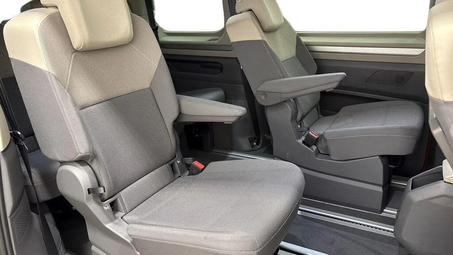 Special 2-Tone Factory paint-Mono Silver/Energetic Orange,Twin sliding side load doors,Privacy glass (90%),Chrome trim decorative strip mid-way on side and rear,Parking sensors front + rear,Rear view camera,Park sensors - front and rear park with park assist,High Beam Control,Park Assist,Adaptive Cruise Control,Lane Change Assist,Dynamic Headlamp Range Control,Poor Weather Lights,Ribella bi-colour fabric upholstery,Heated front seats,Multi-function table,Navigation system 'Discover Pro',App-Connect incl. App-Connect Wireless for Apple CarPlay and Android Auto,2 remote control folding keys,Parking Package,Assistance Package,Lighting Package,Two tone - Mono Silver/Energetic Orange,Ribella bi-colour fabric - Raven black/Sand,16" Syrakus silver alloy wheels with low rolling resistance tyres,Heated rear window with window wiper and washer system,Interior noise reduction measures,Laminated safety glass windshield,heat and sound insulating,Rear wiper,Windshield wiper intermittent control with rain sensor,Body coloured exterior door handles,Glossy black painted radiator grille with 2 chrome trims,Sliding door on left/right with power latching,Automatic headlight control with welcome home lights,Dynamic headlight range control (self adjusting),Front fog lights,LED 3rd brake lamp,LED main headlamps with LED separate daytime running light,LED rear combination lamps,ABS,Automatic post collision braking system,Autonomous emergency braking front assist with pedestrian and cyclist monitoring,Electronic stability control (ESC) and Electromechanical brake booster,ESP,Hill hold assist,Traction control,Adaptive cruise control with C2X including front assist and city emergency braking system,Driver alert system,Dynamic road sign display,Lane change system with side assist including blind spot monitor,rear traffic alert and exit warning system,Lane keeping system Lane Assist,PAS,Break away auto dimming rear view interior mirror,Electrically adjustable,heated and folding door mirrors,High gloss black exterior mirror housing,3x3 point rear seat belts,Driver and front passenger airbag with front passenger airbag deactivation,Electric childproof lock,First aid kit with warning triangle and safety vest,Seat belt warning for the drivers and all passengers seats if unfastened,Side and curtain airbags for driver and front passenger,curtain airbags for outer seats in rear,centre airbag in front,Single tone horn,Tyre pressure monitoring system,Carpet mats in cab,Reinforced carpet floor covering in passenger compartment,1 x 12V sockets on the dash panel,12V socket in passenger compartment,Grab handles on A pillar for access,on driver and front passenger side,Height and longitudinal adjustment steering wheel with gear shift paddles,Illumination lockable glovebox compartment,Load compartment partition to 20kg with bag hooks and luggage net,Luggage compartment lid power latching with unlatching from inside,Multifunction leather steering wheel with tiptronic,Slidable multifunction table/centre console with 3 cup holders,Storage compartment under the 2nd and 3rd row seat and two waste bins,Surround lighting in door area,LED luggage compartment lighting X 2,Electronic differential lock,Sun visors with illuminated vanity mirror,ticket holder on driver side with airbag warning label on sunvisor and B-pillar,Mobile phone interface,We connect preparation,2 USB-C ports in front and 4 USB-C ports in passenger compartment,eCall emergency system,Tailgate,Travel assist,Dark silver brushed decorative inserts,3 seat bench in 3rd row,7 single seats removable/movable,Front and rear head restraints,Height adjustable seats,ISOFIX (including i-size) and top tether in all seats in 2nd and 3rd rows,Removable armrests for front seats with power adjustable lumbar support and folding table for 2nd row passenger seats,Removable armrests in 2nd row passenger seats,Single,Heated Front Seats