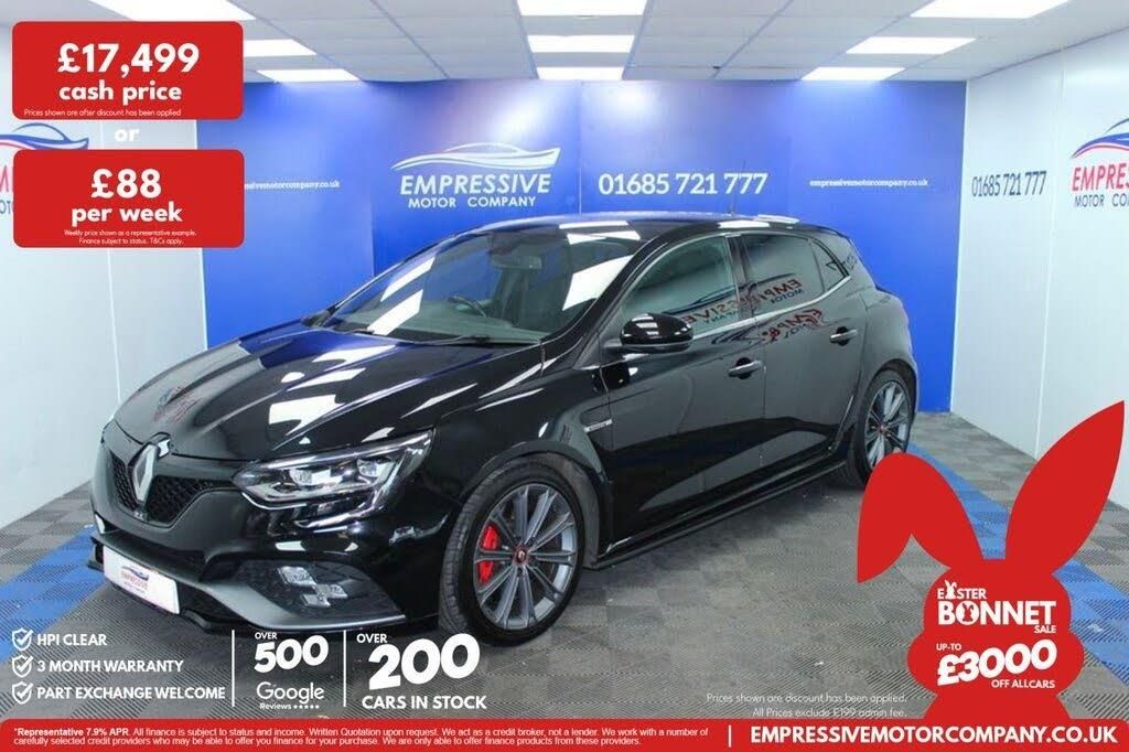 1-3 - 2-3 Folding Rear Bench Seat, 12V Power Socket - Front, 12V Power Socket - Rear, 18in Alloy Wheels - Estoril Gun Metal Grey, 4CONTROL - 4 Wheel Steering System, 7in TFT Digital Speedometer with Colour Matrix with Renault Sport Custom Display, Airbags - Curtain Front and Rear, Airbags - Driver and Passenger Adaptive Front, Airbags - Lateral Chest-level Side for Driver and Front-Seat Passenger, Alarm, Aluminium Pedal Unit and Footrest, Anti Gravel Protection, Apple CarPlay and Android Auto, Automatic Full Central Locking When in Motion, Chrome Strip on Door Handles, Chrome Window Surrounds, Chrome-plated Renault Sport Front Door Sills, Climate Control - Automatic Dual Zone, Cruise Control with Speed Limiter, Cup Chassis Pack, Custom Front Bumper Widened with F1 Gun Metal Gray Blade - Honeycomb Front Grille with RS Badging, Custom Rear Bumper Widened with Functional Diffuser and Central Exhaust, Custom RS Black Harmony Roof Ceiling, Daytime Running Lights with LED Light Guides and 3D Effect, Diamond Black, Digital Dashboard, Door Mirrors - Electrically Operated - Heated - Folding, Electric Power Steering, Electrochromatic Rear View Mirror, ESC Electronic Stability Control and ABS with Emergency Brake Assist, Extra Tinted Windows and Rear Windscreen, Front and Rear Door Panel Ambient Lighting, Front and Rear LED Ceiling Lights, Front Centre Armrest with Storage, Headrests - Rear, Heated Rear Windscreen, HSA - Hill Start Assist, ISOFIX - Child Seat Fixing Points - Outer Rear Seats, Keycard - Hands Free, LED Indicators in Door Mirrors, Manual Parking Brake, One-touch Electric Front and Rear Windows, Parking Sensors - Rear, Passenger Height Adjustment Seat, PURE VISION Full LED Front Headlights with Integrated C-Shape Turn Signal, R-Link 2 Multimedia System - 7in Touchscreen, Rear LED 3D Edge Light Daytime Running Lights, Renault MULTI-SENSE - Choice of Driving Modes - 5 Driving Modes including Race Mode, Renault Sport Welcome Sequence Upon Opening the Vehicle with Brand Light, RS Custom Braking System, RS Drive Activation Button, RS Extended Front Wheel Arches with Air Grilles and Renault Sport Badging, RS Extended Rear Wheel Arches, RS Nappa Perforated Leather Steering Wheel and Gear Lever Knob with RS Badging, RS Rear Spoiler, RS Sills-Skirt with Flat Bottom Effect, RS Sports Seats with Integrated Headrests, RS VISION Full LED 3 Function Headlights - Fog - Cornering - Long Range, Seatbelt Reminder, Seats - Drivers Height Adjustment, Seats - Drivers Lumbar Adjustment, Shiny Black Door Mirrors, Sport Chassis, Steering Wheel - Height and Reach Adjustable, Sun Visor - Mirror With Light, Superlocking, Tyre Pressure Monitoring System, Tyre Repair Kit