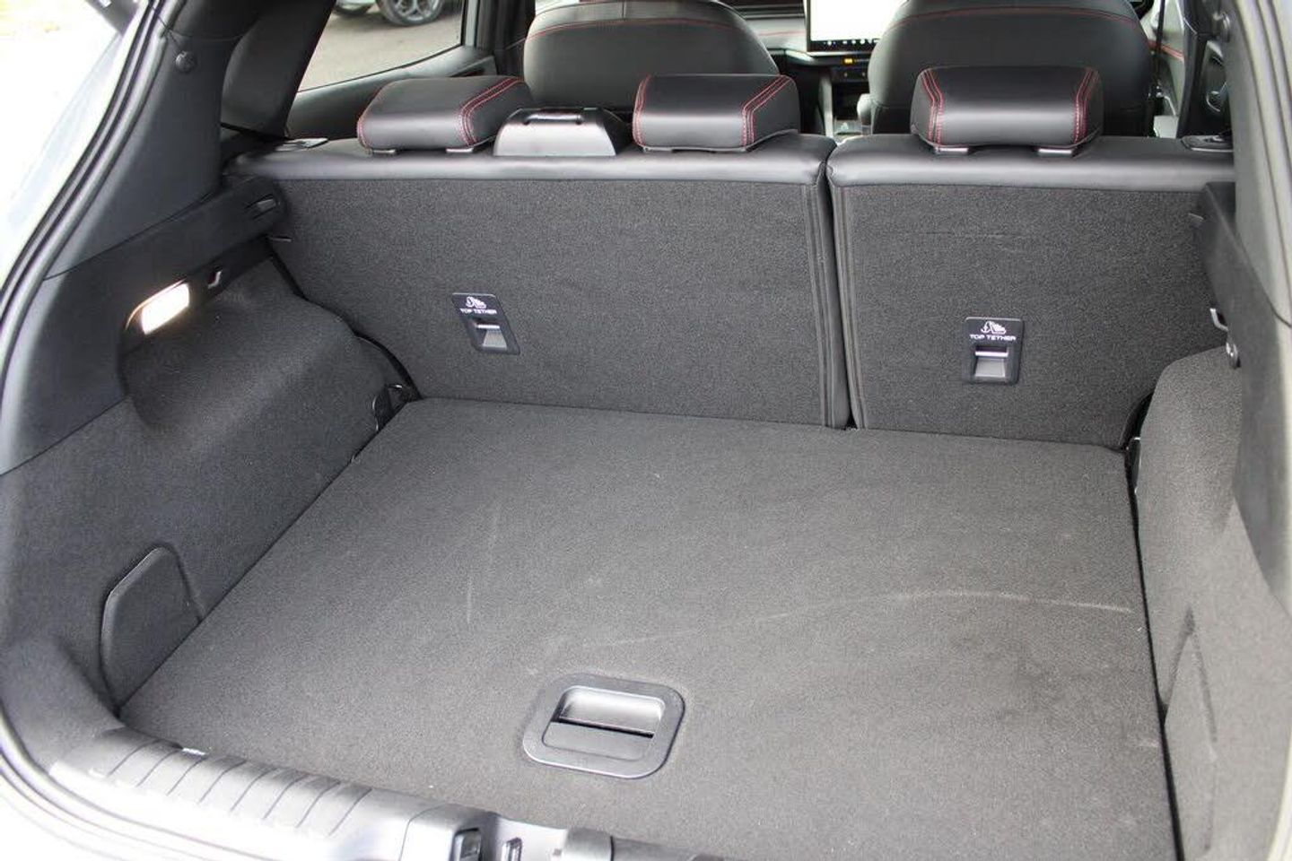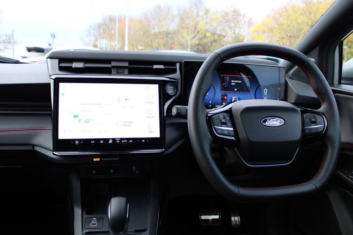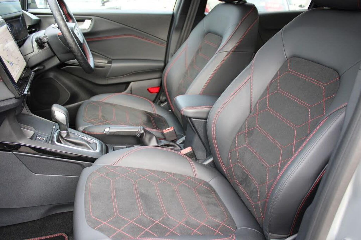 Driver impairment monitor, Emergency call service, Ford easy fuel, Full digital 12.8" instrument cluster, Lane keeping aid with lane departure warning, Power assist steering, Selectable drive modes(Normal, sport, Eco, trail, slippery), Speed sign recognition, 12" landscape touchscreen display with wireless apple car play and android auto premium BO audio system with 10 speakers, Ford pass connect and emergency assistance, Ford SYNC4 with connected navigation, Automatic headlights with rain sensing wipers and auto high beam, Front fog lamps, LED daytime running lights, LED rear lamps, LED third brake light, Power foldable heated door mirrors with puddle lamps and puma logo protection, Quickclear heated windscreen, Rear privacy glass, Rear side wing doors, Rear wiper, ST-Line X body styling kit, 3 seat bench in 2nd row, 4 way lumbar support for passenger seat, Centre console with armrest and stowage, Electronic automatic temperature control (EATC), Ford megabox extended bootspace, Front and rear head restraints, Front floor mats, Manual 4 way driver seat adjust with lumbar adjustment, Single front passenger seat, ST-Line X Premium synthetic leather upholstery, Thatcham alarm, Premium Synthetic Leather - Synthetic Suede Inserts - Red Stitching - Black