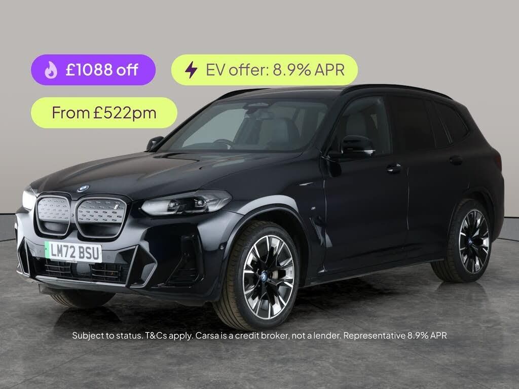 Experience the future of driving with this stunning black BMW iX3 M Sport SUV. Enjoy luxurious Vernasca leather seats, a panoramic roof, and a cutting-edge Harman/Kardon sound system. Stay connected with Apple CarPlay and enjoy easy access with keyless entry. Featuring LED headlights, a head-up display, gesture control, and advanced Driving Assistant for added peace of mind. Parking is effortless with Parking Assistant Plus, park assist, and a reversing camera. This electric SUV redefines sophistication and innovation. 1 service recorded, last serviced on 23/09/2024 at 16,591 miles. MOT to 25/09/2026. Visit our website for service history, online valuation, full vehicle specification plus multiple images. Certain features listed may be available via subscription packages at extra costs, please consult with BMW for details. Any feature/option specified here is from 3rd party data. We cannot guarantee the accuracy of any specification supplied by a 3rd party. We recommend that you physically check the specification of the vehicle on site prior to purchase. This information does not form part of the buying contract. Terms & Conditions apply. We have over 2,000 cars available from our 10 national branches, check our website to see all our stock. Our Trustpilot rating is 4.4/5 with over 9,000 reviews.