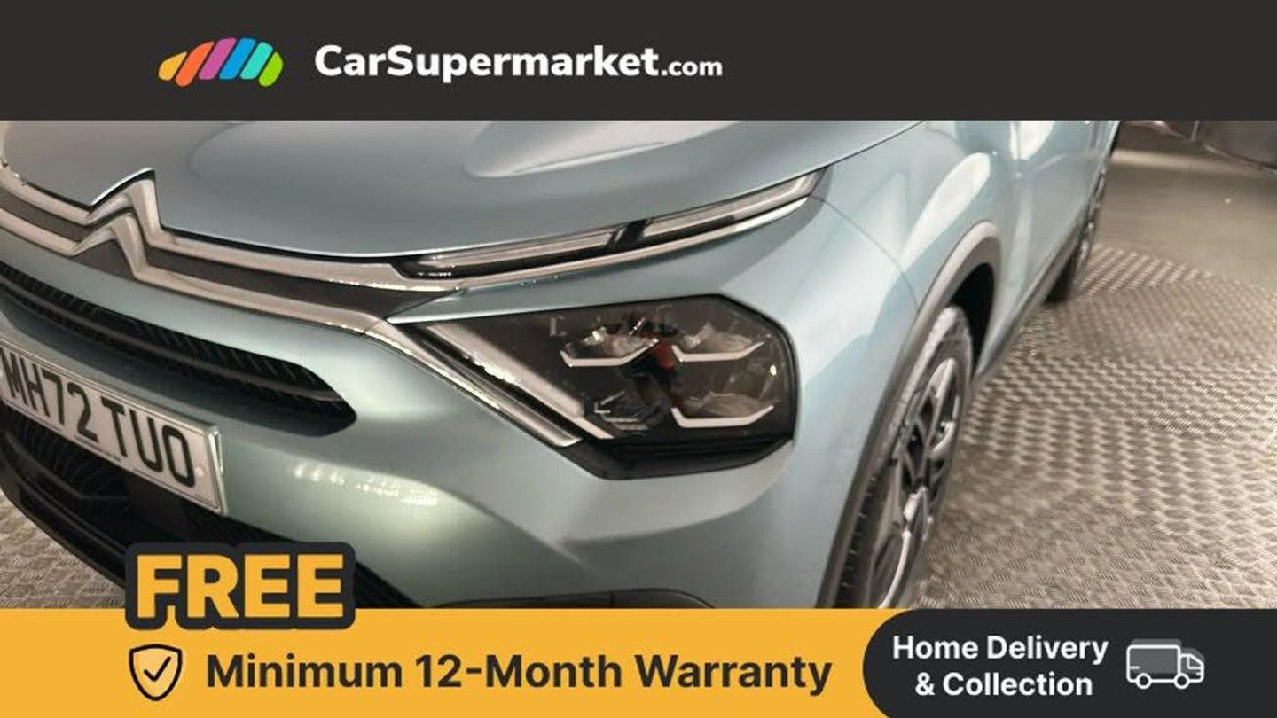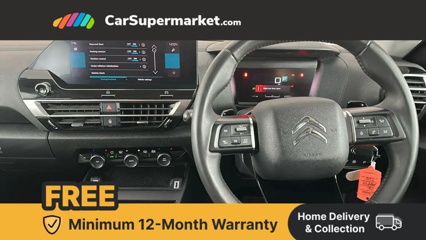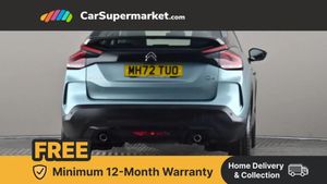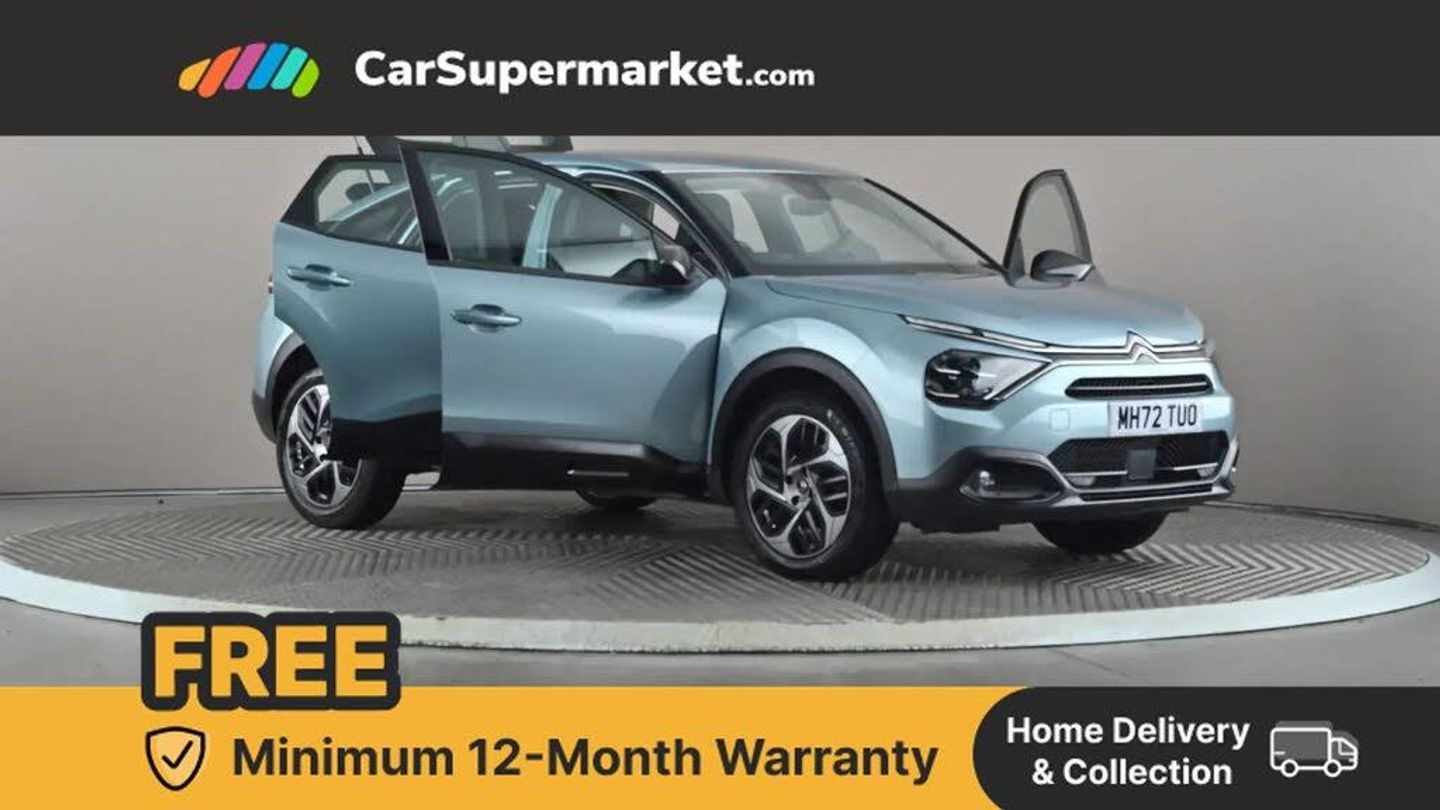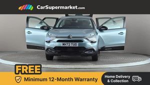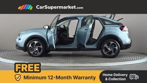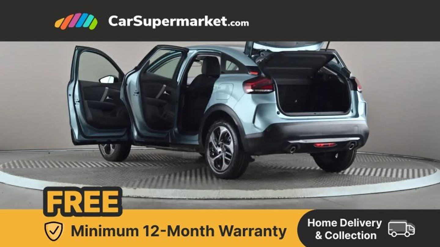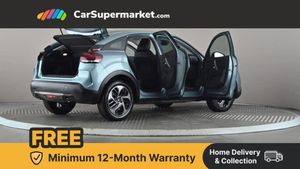 10" high resolution touchscreen user interface, controlling media, connectivity and vehicle settings,5.5 inch backlit full TFT driver's instrument cluster with LED ambient lighting,Apple car play and Android auto,Citroen connect box emergency and assistance system,Citroen connect nav with real time traffic and speedcam,Citroen Smart Pad Support - integrated support for attaching a tablet computer for front passenger,Cruise control + speed limiter,Driver's head-up display,Electronic Power Steering (EPS),In-crash braking,Rear parking sensors,Tailgate,Top rear vision reversing camera,Voice commands,Advanced comfort suspension - double hydraulic stops on front suspension and single on rear suspension,6 speakers,Bluetooth telephone and audio streaming,DAB Digital radio,3rd brake light,Automatic headlights,Body colour bumpers,Body colour door handles,Boot spoiler,Electrically heated, folding and adjustable external rear view mirrors,Front and rear electric windows,Gloss black rear skirt,LED daytime running lights in V signature,LED front fog lamps with static cornering function,LED front headlamps,Perla Nera black painted external rear view mirrors,Rain sensing automatic front windscreen wipers,Rear side wing doors,Rear wiper,Roof aerial,Standard interior rear-view mirror with manual day-night switching,Welcome and goodbye lighting,12V power outlet, 1x USB Type-C socket charging & data connection and 1x USB Type-A socket in 1st row and 1x USB Type-A socket charging in 2nd row,3 rear headrests,3 seat bench in 2nd row,Boot light,Chevrons cloth and leather effect textile seat upholstery,Dashboard tray in front cabin,Driver and passenger sunvisors with illuminated vanity mirrors,Dual zone automatic air conditioning,Front and rear LED interior lighting,Front head restraints,Grained leather steering wheel with two command blocks,Height adjustable driver's seat with adjustable lumbar support,Height adjustable front passenger seat,Height and reach adjustable steering wheel,Map pockets in rear of front seats,Raised centre console with armrest and two cup holders,Single front passenger seat,Split folding rear seats,Two position boot floor,High level acoustic insulation pack - C4/C4 X/e-C4 X,3x3 point rear seatbelts,ABS,Driver and front passenger airbags,Electric parking brake,ESP,Front seatbelt pretensioners,Hill start assist,Manual child lock in second row,Manual deactivation of front passenger airbag,Row 1 and 2 curtain airbags,Row 1 side thorax airbags,Seatbelt unfastened on the move warning,Tyre underinflation detection,Anti-theft alarm (volumetric protection),Immobiliser,Remote locking with deadlocks,18" Bi-tone painted aeroblade alloy wheels with anti-theft locking wheel nuts,Puncture repair kit with compressor,Iceland Blue