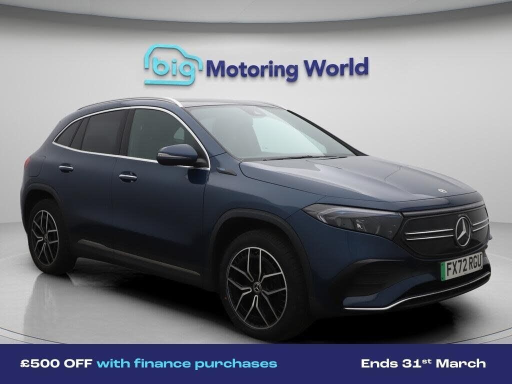 £500 towards your finance depo-Our Mercedes-Benz EQA is finished in Blue. Specification includes a range of fantastic features including £500 towards your finance deposit, Comfort Pack, All Wheel Drive, 19'' Alloy wheels, Part Leather Seats, Air Suspension, Apple CarPlay, AMG body styling, Premium, Electric Panoramic Roof Specification information is supplied by CAPHPI and may vary to the actual car. This data does not form any part of a buying contact. Please check specification prior to purchase in-store. The MOT is valid until September 2026, visit bigmotoringworld.co.uk for more photos, a 360 tour, service history and a free HPI report.Were BIG on peace of mind and this Blue Mercedes-Benz EQA has completed our comprehensive 200 point inspection and passed all checks. Its ready for you to drive away with immediate collection in-store. We include a 90-day warranty as standard plus an option to extend for up to 3 years.Reserve this car exclusively for you, safely and securely at bigmotoringworld.co.uk, with a fully refundable £99 deposit. Test drive before you buy, with no commitment, no hassle and a completely haggle free experience. Still searching and want to see thousands more cars? We are BIG on choice with over 8000 cars to choose from.Visit our award winning web site bigmotoringworld.co.uk.Were Big Motoring World and were BIG on what matters to you.