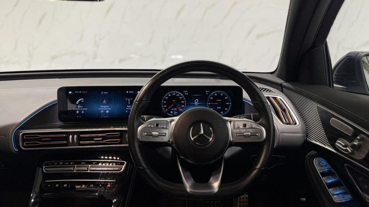 Black interior.This 2022 Mercedes Benz EQC 400 AMG Line (Premium Plus) boasts an exceptionally low mileage of just 20,250 miles, coupled with a full dealership service history and an MOT valid until February 2026, ensuring peace of mind for its next owner. This electric four wheel drive SUV offers a substantial 88 kWh battery, providing a maximum range of 253 miles from new. Charging at home on a 7kW charger takes approximately 12 hours and 13 minutes, while rapid public charging can achieve 80% capacity in as little as 45 minutes. The vehicle's provenance is further assured with a clear vehicle history check and its last service completed on 2025-02-05 at 16,696 miles. Experience the refined performance of the EQC 400 AMG Line, capable of accelerating from 0-60mph in a swift 5.1 seconds, a testament to its electric power. This model stands out with its impressive array of notable features, including advanced MULTIBEAM LED headlights for superior visibility, and a KEYLESS-GO Comfort Package for effortless access. The Parking Package, complete with a 360-degree camera and front and rear sensors, makes manoeuvring simple. Enjoy the expansive views through the electric sliding sunroof and benefit from the convenience of a Head-Up Display. Furthermore, the generous boot space offers ample practicality for all your needs, making this EQC a compelling choice for those seeking a premium electric vehicle.