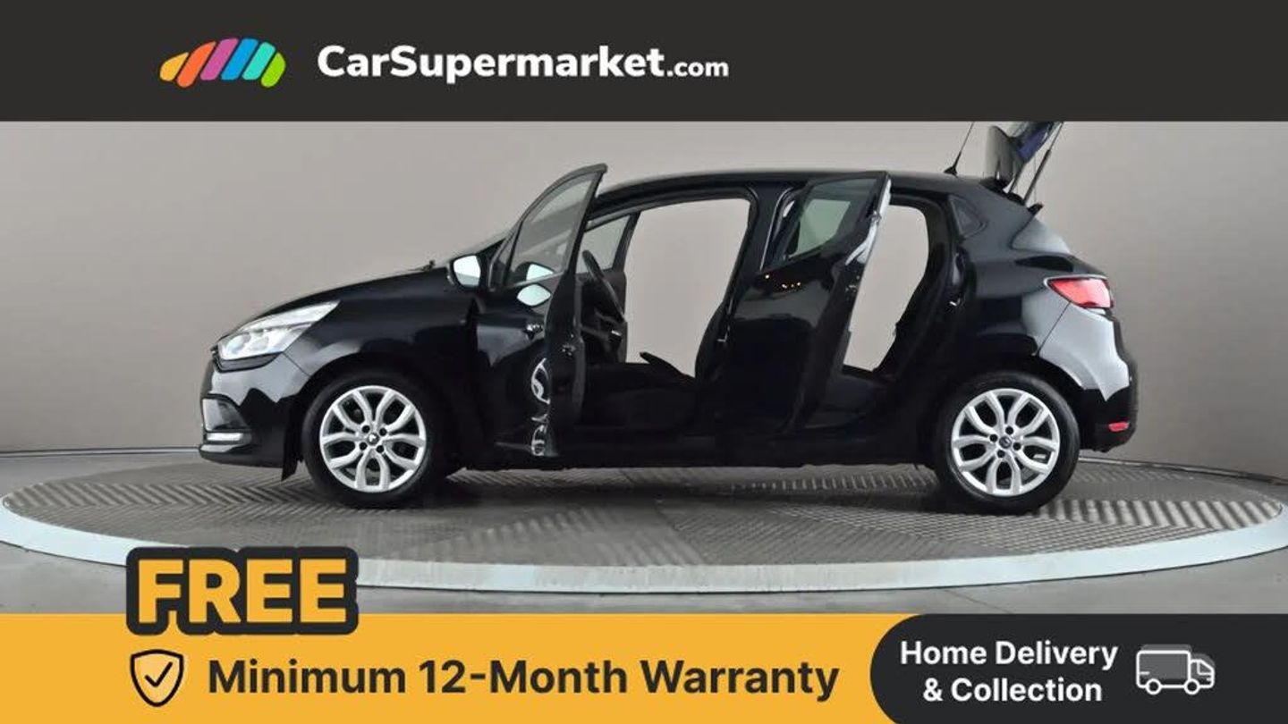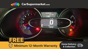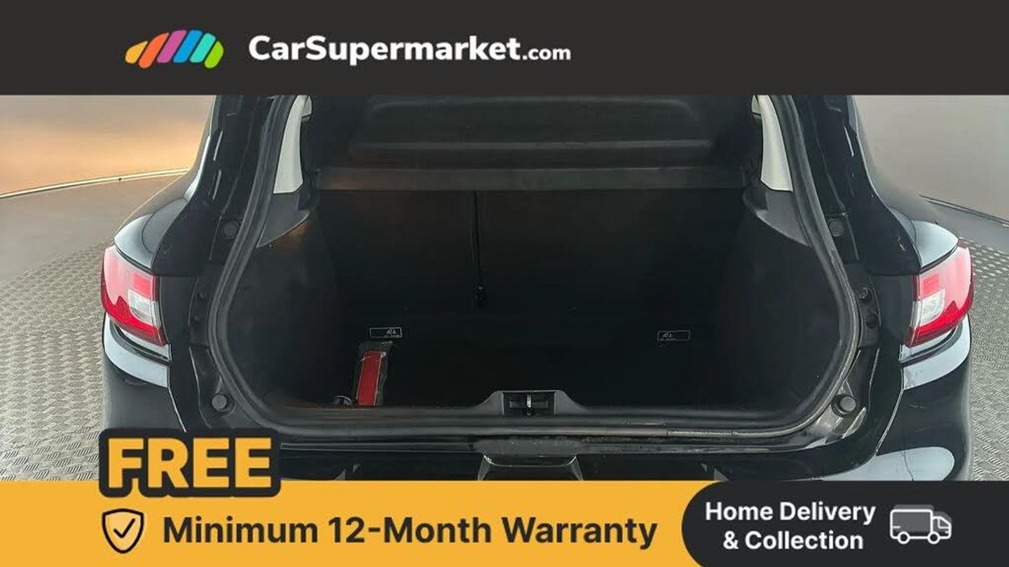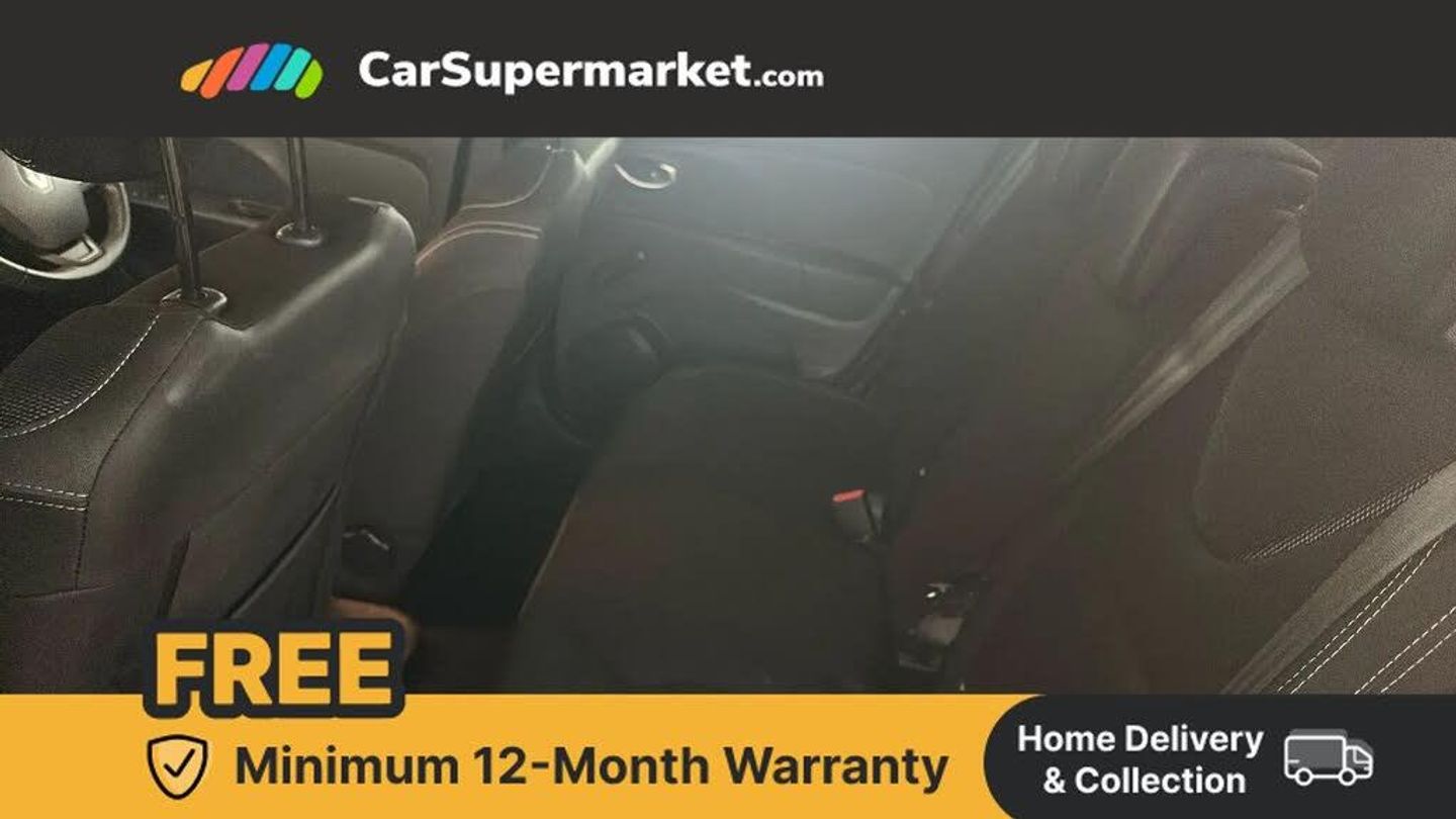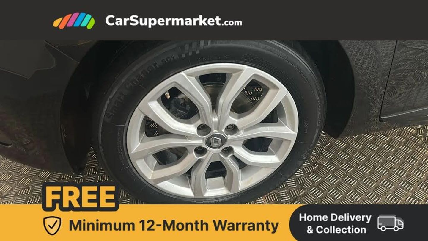 Cruise control + speed limiter,Push button starter,Renault MediaNav with 7" touch screen and Navteq Nav 'n' Go Satellite Navigation,Smartphone cradle,Trip computer,Variable PAS,4x20W Arkamys radio with bluetooth handsfree and USB,Aux-in socket,Automatic headlights + automatic windscreen wipers,Black door protector with chrome inserts,Black headlamp surrounds,Body colour door handles,Body coloured bumpers,Body coloured rear spoiler,Chrome tailgate decoration,Electric adjustable door mirrors,Electric front windows + one touch + anti-pinch,Front fog lamps,Heated door mirrors,LED daytime running lights,Rear wiper,Variable front intermittent wipers,12V Accessory socket,3 rear height adjustable headrests,60/40 split rear seats,Air recirculation control,Chrome gear knob insert,Chrome interior door handles,Design cloth upholstery,Driver's seat height adjustment,Front cupholders,Front door storage bin,Glovebox,Height adjustable front headrests,Height/reach adjust steering wheel,Isofix system on outer rear seats,Leather steering wheel with chrome inserts,Multi function steering wheel,Pollen filter,System for Restraint and Protection SRP-front seats,3 point seatbelts on all rear seats,ABS+EBD+Brake assist,Driver and passenger front and side airbag deactivation,Driver/Front Passenger airbags,Driver/front passenger side airbags,ESP + Traction control + Understeer control,Front side airbags(head+thorax),Height adjustable driver's seatbelt,Hill start assist,Seatbelt warning,Tyre pressure monitoring system,Anti-drill door locks,Child lock control of rear doors and windows,Deadlocking system,Hands free Renault card,Locking fuel filler cap,RAID (Renault Anti-Intruder Device) with automatic door locking,Remote central locking,Thatcham Cat 2 engine immobiliser,Dark carbon soft touch dashboard,Gloss black air vent surround,Gloss black centre console,Gloss black dashboard inserts,Diamond Black