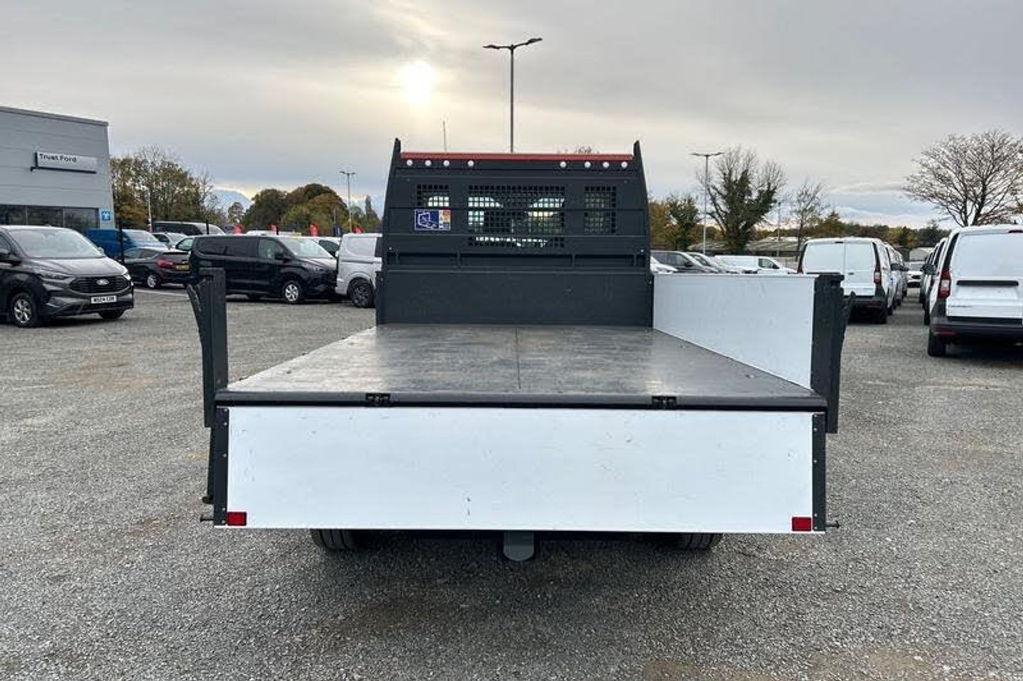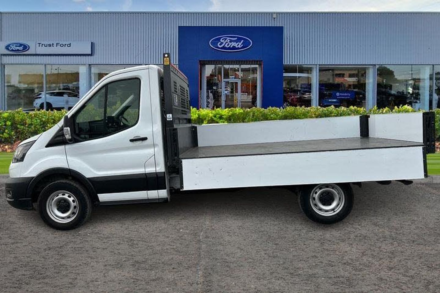 REAR VIEW CAMERA shows whats behind you on a screen in front of you on the dashboard - the system activates when you select reverse gear and using virtual guidelines can help you park, CRUISE CONTROL provides extra comfort on longer journeys allowing you take your foot off the acceleration whilst just focusing on steering the vehicle, Wireless Apple CarPlay and Android Auto, BLUETOOTH HANDS FREE WITH VOICE CONTROL allows you to operate both your mobile phone and Ford audio system - controlling several functions using a set list of simple voice commands, Start/stop system, Recirculation heater, Centre console, Warning lights, Key operated bonnet release, Reach and rake adjustable steering column, Audio controls mounted on steering wheel, 2 x 12V power outlets, Part body colour front bumper, Front door map pockets, Hill start assist, Gearshift indicator light, Daytime running lights, Visible Vehicle Identification Number (VIN), Rope hooks, Driver one touch up/down power windows, Complete tinted glass, Low roof line, Electronic dynamic cornering control, Quad beam headlamps, Rear axle Alt A - Narrow track, 8 Part digital instrument cluster, Rear fog lamps, Emergency brake assist, Collision mitigation system, Roll stability control, Side wind mitigation, Tyre pressure monitoring system, Tablet holder, Intelligent Speed Assist, Driver's airbag, Powder coated white aluminium sideboards and tailboards with auto rear tip feature, Non limited slip differential front axle, Unperforated cab back panel, Emergency assistance, Adaptive front lighting system, Door mirrors - Blind spot eliminator and integrated side indicator, Self colour door handles, Overhead console, Vehicle maintenance monitor, Driver's side storage compartment on facia top, Dual circuit front and rear discs with self adjusting servo assistance, Emergency brake warning, Electronic Stability Control (ESC), Multi channel door entry remote, Underseat storage compartment (Under dual passenger seat), Curve control, Electric power assisted steering (EPAS), Driver and passenger seatbelt reminder, Brakes - ESP/HLA/FBS, Day/Night inside mirror, Wrong way alert, Less load compartment loops, 2-way head restraints on front seats, Multi stage vehicle, Exhaust exit behind muff down, Front axle rating - 1850KG, Self colour front grille, Halogen projector headlights, Automatic on/off headlights, Front independent MacPheron struts, linear rate coil springs, stabiliser bar, gas pressured shock absorbers and rear leaf springs, Battery - Cold start function (-20 degree C), Twin, 2 litre bottle capacity, fascia mounted bottle holder, 4 Front speakers (2 woofers and 2 tweeters), Roof mounted fin antenna, Header mounted courtesy lights front with theatre dimming, Automatic front wipers with rain sensor, 4-Spoke Polyurethane steering wheel, Sngle fuel tank - 70 Litres, Ford Easy Fuel capless refuelling system with misfuel inhibit, AdBlue aftertreatment system - 24 Litre, Anti-lock braking system (ABS) with electronic brake-force distribuition (EBD), Load adaptive control, Front passenger's airbag including airbag deactivation switch, Front side and curtain airbags, 3-point diagonal inertia reel seatbelts for all front seats, Driver seatbelt pre-tensioner, Immobiliser - Safeguard passive anti-theft system (PATS), Audio mis-lock feedback, audible signal if a door is ajar when locking activated, Auto locking on drive away, doors automatically lock at 5 mph, Remote control central locking with 1 key fob, Power central locking, Cab easy clean rubber floor covering, Cab moulded headlining, Water in fuel filter sensor, Selectable drive modes - Normal, Slippery and Eco, Wide self colour bodyside mouldings, High strength lightweight steel subframe, Smooth side boards for ease of signwriting, Cab protector mounting and lashing points, Wander lead control, Hydraulic body lock down safety device, MEDIUM ROOF , 1 WAY TIPPER, ULEZ COMPLIANT, ULEZ, Chassis Cab, NATIONWIDE DELIVERY AVAILABLE, EURO 6, C