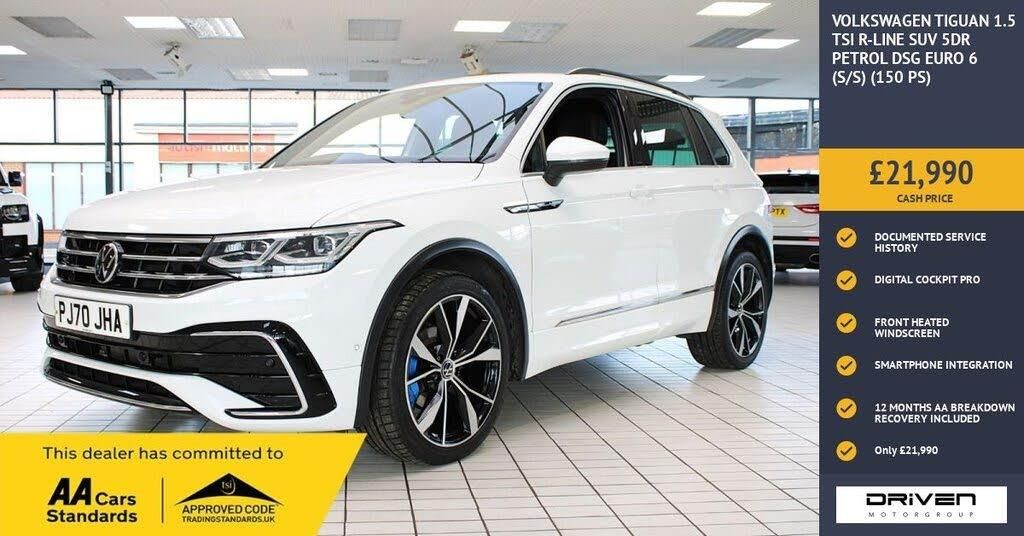 VOLKSWAGEN TIGUAN 1.5 TSI R-LINE SUV 5DR PETROL DSG FINISHED IN PURE WHITE AND COMPLIMENTED WITH PART LEATHER INTERIOR, THIS VEHICLE HAS BEEN VERY WELL CARED FOR AND MAINTAINED WITH DOCUMENTED SERVICES CARRIED OUT AT 18187, 33331, 41724 MILES PLUS COMPREHENSIVE PRE DELIVERY HEALTH CHECK COMPLETED PRIOR TO SALE 43392 MILES. KEY FEATURES INCLUDE ALLOY WHEELS, ADAPTIVE CRUISE CONTROL, USB CONNECTOR, ALARM, AMBIENT LIGHTING, SMARTPHONE INTEGRATION, 3 ZONE CLIMATE CONTROL, DIGITAL COCKPIT PRO, MEDIA NAVIGATION INFORMATION SYSTEM INCLUDING STREAMING AND INTERNET, ELECTRIC FOLDING HEATED DOOR MIRRORS, IMMOBILISER, HEATED FRONT SEATS, HEATED MULTIFUNCTIONAL STEERING WHEEL AND GEAR KNOB, HEATED WINDSCREEN, LANE ASSIST, PARTK ASSIST, FRONT AND REAR PARKING SENSORS, PRIVACY GLASS PLUS MUCH MORE. COMMITTED TO AA CARS STANDARDS: 3 MONTHS OR 3000 MILES WARRANTY INCLUDED WITH AN OPTION TO UPGRADE: 12 MONTHS AA BREAKDOWN RECOVERY INCLUDED: £75.00 CONTRIBUTION TOWARDS YOUR NEXT SERVICE/MOT AT ANY AA CARS STANDARD APPROVED WORKSHOP: WE STAND BY THE QUALITY OF OUR VEHICLES. WITH THE PURCHASE OF THIS VEHICLE, YOU WILL RECEIVE 3 MONTHS OR 3000 WARRANTY, 12 MONTHS AA BREAKDOWN RECOVERY, GIVING YOU ADDITIONAL PEACE OF MIND AND PROTECTION. ALL OUR CARS COME WITH AT LEAST 6 MONTHS MOT AND PRE SALE HEALTH CHECK AND ROAD TEST. OUR PROFESSIONAL TEAM ENSURES YOUR VEHICLE STAYS IN TOP CONDITION, AND YOU ENJOY A HASSLE-FREE OWNERSHIP EXPERIENCE. 4.6 STARS ON GOOGLE WITH OVER 550 REVIEWS: JOIN OUR COMMUNITY OF SATISFIED CUSTOMERS! OUR DEALERSHIP IS PROUD TO HAVE A 4.6 STAR RATING ON GOOGLE, BACKED BY OVER 550 POSITIVE REVIEWS. WE ARE COMMITTED TO PROVIDING EXCELLENT SERVICE AND HIGH-QUALITY VEHICLES. This Vehicle Comes Equipped with High Specification, Which Includes: - Drive this car home with complete confidence and satisfaction: All cars proudly offered by driven group are rigorously inspected, hpi checked and prepared to the highest standard To drive this car home, visit www.drivegroup.co.uk or call 01642-601999 to arrange an appointment with our sales team Please note we do not operate an organised distance selling scheme as defined by the consumer contracts (cancellation, information and additional charges) regulations 2013. Therefore, even if you choose to not view your vehicle at our premises prior to purchase,you will not be entitled to cancel your order under any 14 day cancellation period. All other statutory rights remain unaffected. Whilst every effort has been made to ensure the accuracy of the information contained in this website, please check with us about any item which may affect your decision to purchase. Driven motor group shall not be liable for any errors, inaccuracies or delays in content.