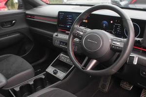 Exterior Features, Metallic paint, Paint - Metallic, Metallic - Ultimate red, Trim - Part Leather, N Line Alcantara/leather - Black with red accent, Exterior Features, Automatic windscreen wipers with rain sensor, Electric front windows with anti-trap mechanism and one touch control, Electric rear windows, Privacy glass - Rear windows and tailgate, Rain sensor, Rear wiper, Solar glass with front door glass and windscreen, Tinted glass in front and rear doors, Windscreen auto defog function, Body colour exterior door handles, Body coloured wheel arch inserts, Rear roof spoiler with integrated LED brake light, Rear side wing doors, Roof rails, Automatic headlights with dusk sensor, Horizon centre LED DRL, LED projector headlights, LED taillights, LED upper and lower rear lights, Safety, Anti-lock brake system (ABS), Downhill brake control, Electric parking brake, Electronic stability control, Hill start assist control (HAC), Blind spot collision avoidance assist, Blind spot view monitor, Driver status monitor (DSM), Feature on demand - Enabled, Forward collision avoidance assist (FCA 1.5) - Car,pededstrian,cycle and junction turning, Front parking sensor, HDA - Highway Drive Assist Level 1.5, Intelligent speed limit assist, Lane follow assist, Lane keep assist, Leading vehicle departure alert (LVDA), Parking Collision Avoidance Assist-Reverse (PCA-R), Parking distance warning - side, Parking system with rear camera and guidance system, PAS, Rear cross traffic collision avoidance (RCCA), Rear parking sensor, Rear view camera with dynamic guidelines, Safe exit warning (SEW), Smart cruise control with stop and go functionality, Surround view monitor, Auto dimming rear view mirror, Door mirror LED indicator lights, Electrically adjustable and heated door mirrors, Gloss black door mirrors, Power folding door mirrors, Airbag - front,front side,curtain and centre front airbag, Childproof rear door locks, Fixed 3 point for second row centre passenger seatbelt, Rear seat alert, Tyre pressure monitoring system, Interior Features, Floor mats, 2 zone climate control, 12V power outlet in front console, Aluminium pedals, Driver and passenger front seat pockets, Heated steering wheel, Height/reach adjustable steering column, Leather steering wheel, Luggage net, Luggage shelf, Metal paint effect interior door handles, N Line Alcantara/leather upholstery, Rear centre armrest with cupholders, Shift by wire SBW, Ambient lighting, LED centre interior light, LED front interior light, Luggage compartment LED lighting, Driver/passenger sunvisors and illuminated vanity mirrors, Audio / Communications, Bluetooth connectivity with voice recognition, eCall emergency call system, Roadside assistance, Wireless phone charging pad, Wireless Smartphone Integration includes Apple CarPlay and Android auto, 2 front USB C and 2 rear USB C charging points, Bose Premium Audio system with 7 premium speakers + subwoofer, DAB Digital radio, Steering wheel audio,phone and cruise controls, Driver Convenience, Height adjustable power tailgate, Miscellaneous, 12.25" digital instrument cluster, 12.3" touchscreen centre console display satellite navigation with bluelink, live services and mapcare, Driver supervision instrument cluster with 12.3" LCD display, Packs, N Line exterior design pack - Kona, N Line interior design package - Kona N Line S, Trailer wiring package - Kona, Trim, 3 seat bench in 2nd row, 40/20/40 split folding rear seat, Adjustable head restraints, Driver's seat electric adjustments, Driver's seat lumbar support, Front passenger's seat electric adjustments, Heated front seats, Heated rear seats, Single front passenger seat, Ventilated front seats, Vertical adjustment rear head restraints, Security, Alarm/immobiliser, Rear occupant alert, Remote central locking, Smart key with keyless entry and start/stop button, Service/Warranty, Five year annual vehicle health checks, Wheels, Temporary mobility kit (TMK)