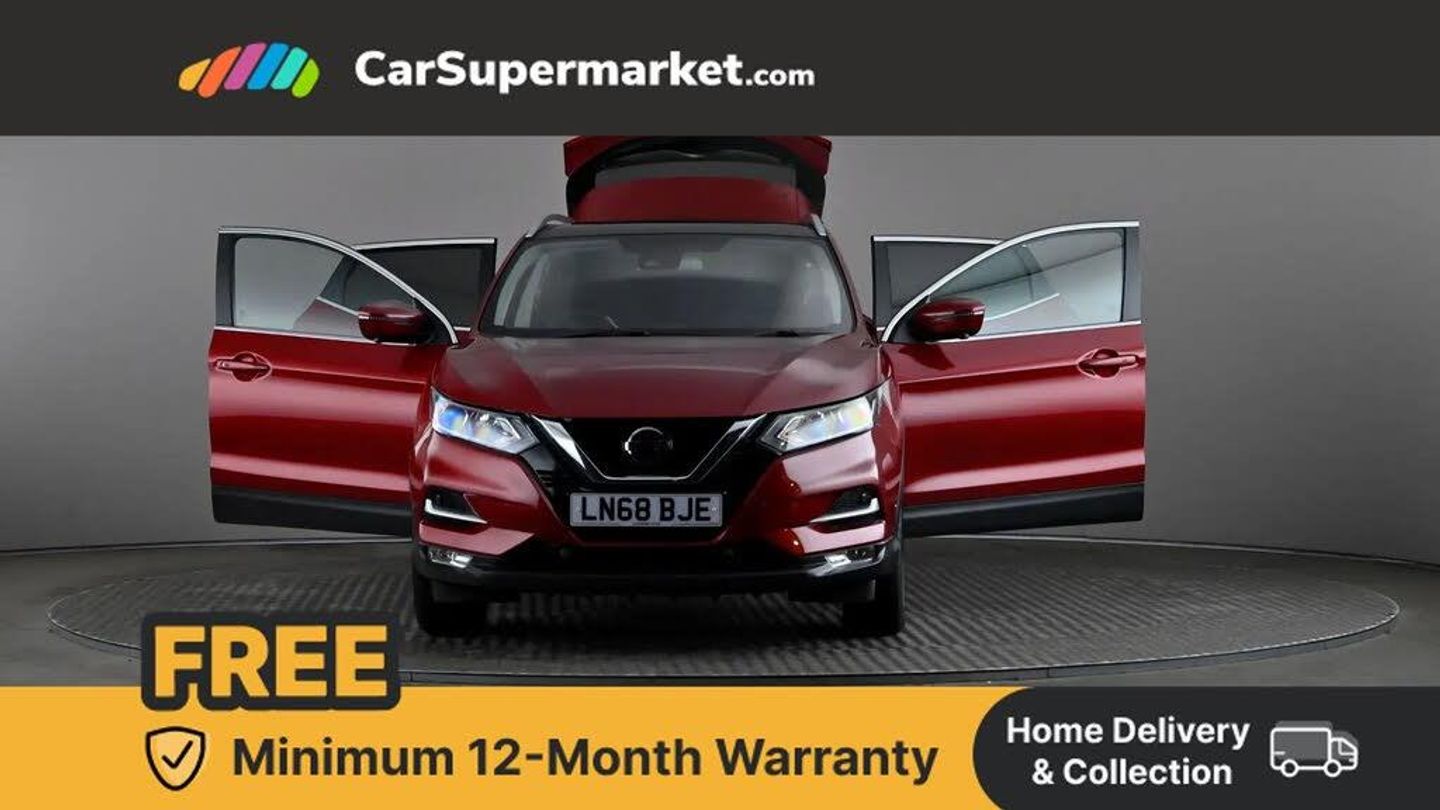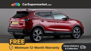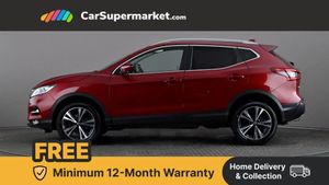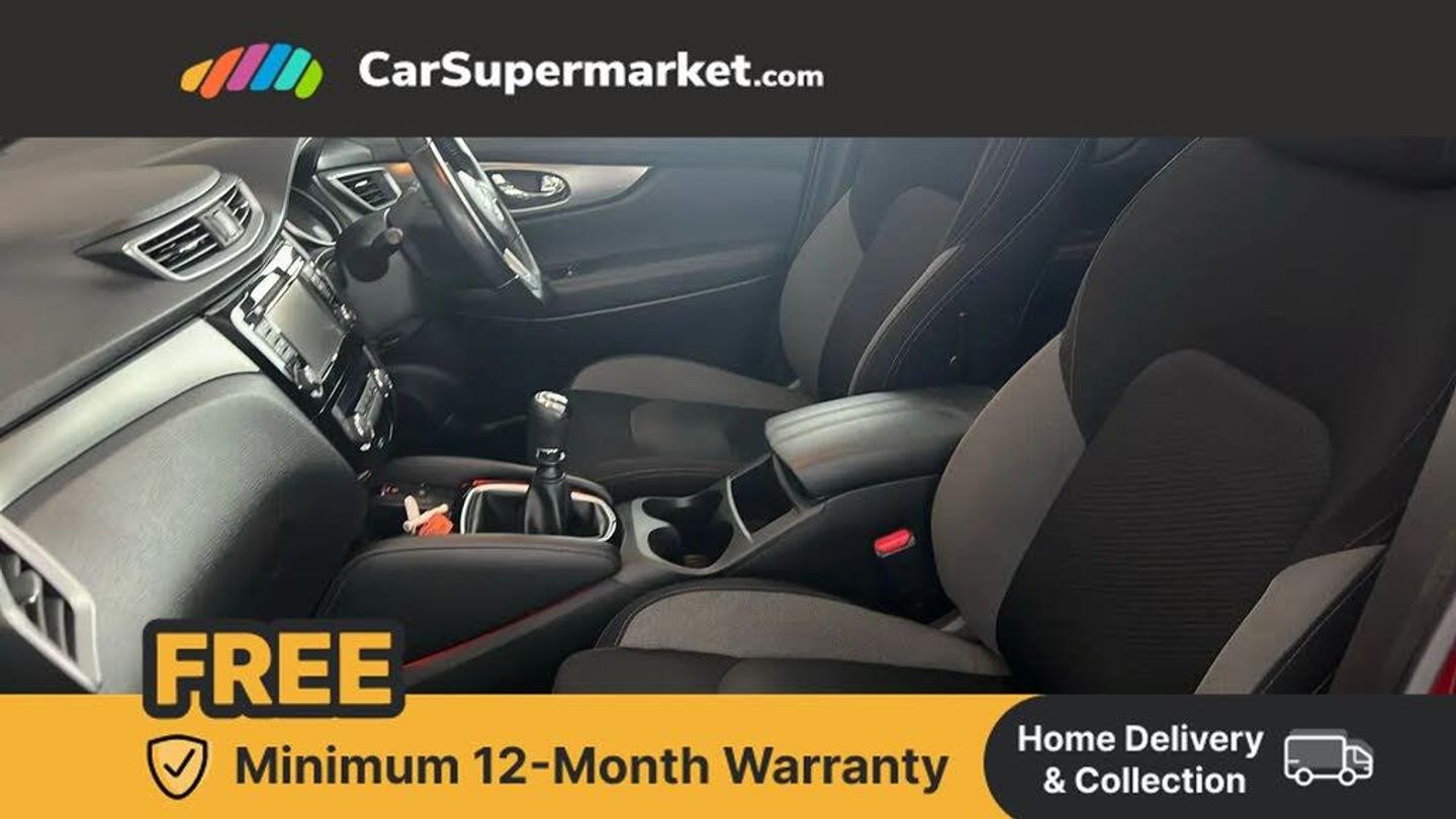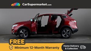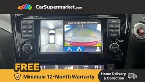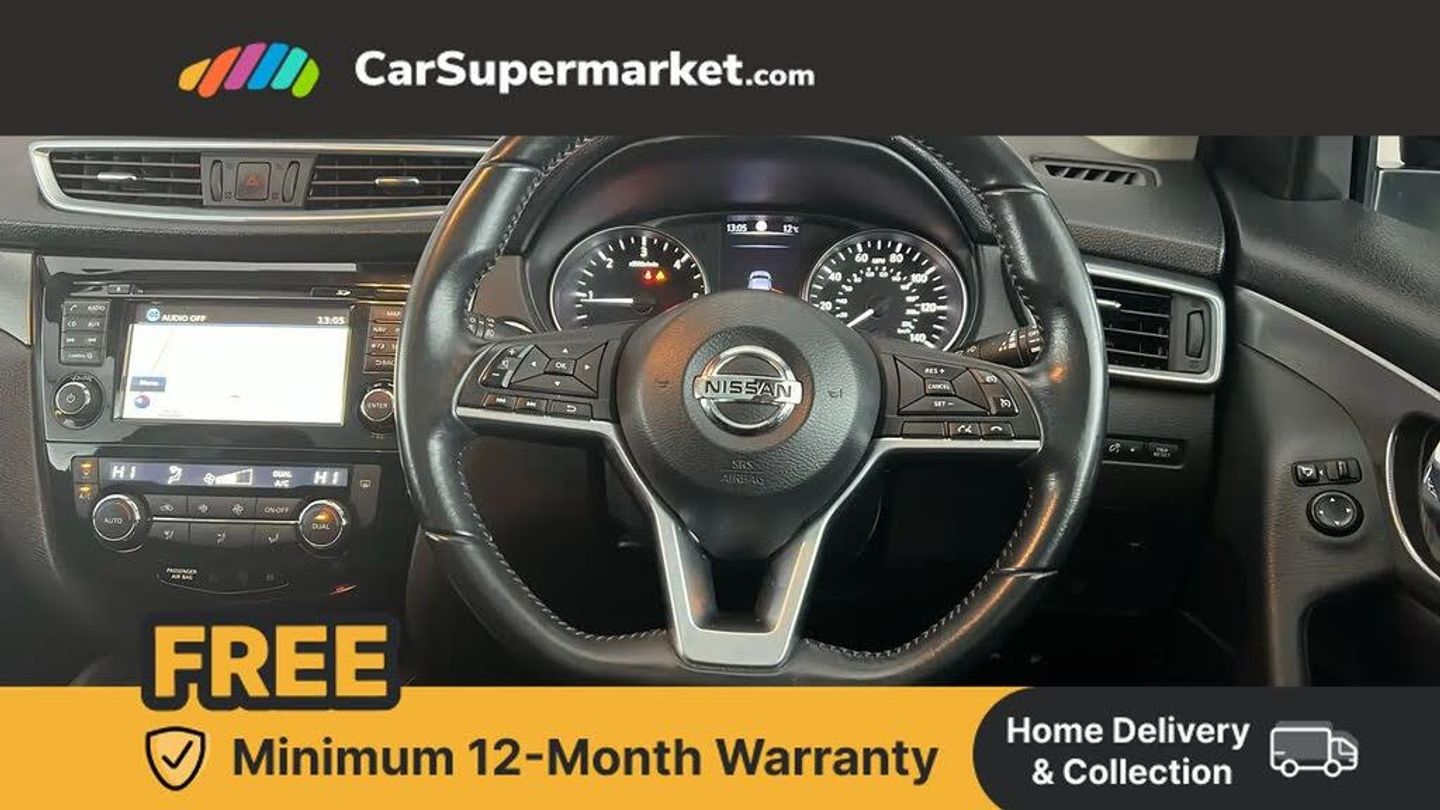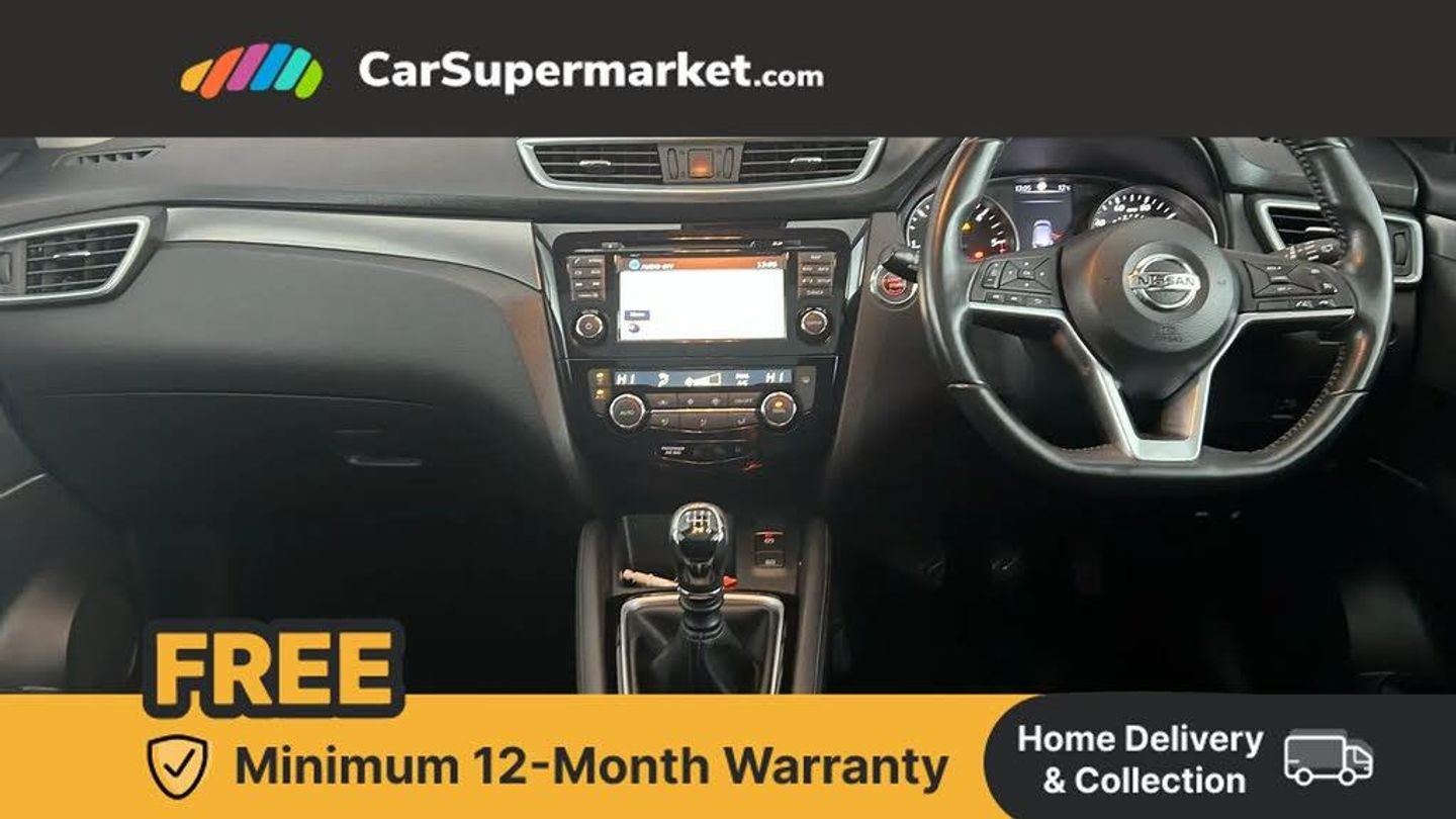 Advanced drive assist display 5'' TFT coloured screen,Bluetooth phone integration system,Cruise control + speed limiter,Electric speed sensitive power steering,Front parking sensors,Intelligent around view monitor,Intelligent parking assist,Lane departure warning system,Nissan connect evo 7" touchscreen navigation and entertainment system,Outside temperature sensor,Push button starter,Rear parking sensors,Rear view camera,Selectable steering,Service interval indicator,Smartphone integration,Stop/start system,Traffic sign recognition,Trip computer,Diesel particulate filter,Nissan chassis control (intelligent ride control, intelligent trace control, intelligent engine brake),6 speakers,Aux-in socket,DAB Digital radio,Radio/CD,Steering wheel mounted audio controls,USB port,Anti dazzle rear view mirror,Auto wipers,Body colour bumpers,Body colour door handles,Body colour door mirrors,Chrome window surround,Daytime running lights dip function when turn signal applied,Electric folding door mirrors,Electric front and rear windows with one touch illuminated window controls,Electric front/rear windows,Electrically adjustable door mirrors,Front fog lights,Halogen headlights,Heated door mirrors,High beam assist,Intelligent auto headlights,LED indicators in door mirrors,Matt silver roof rails,Privacy glass,Rear roof spoiler,Rear wiper,Shark fin antenna,Underbody vortex generators,2 X front 12v power sockets,3 height adjustable rear headrests,60/40 split folding rear seat,Ambient interior lighting,Boot light,Centre console storage box/armrest,Chrome interior door handles,Cloth upholstery,Configurable luggage board system,Driver's seat manual height adjust,Dual zone climate control,Front and rear door pockets with bottle holders,Front and rear seat belt pre-tensioners with load limiters,Front headrests,Height adjustable front headrests,Leather D shaped steering wheel,Leather gear lever,Leather knee pad,Manual height adjustable front passenger seat,Manual lumbar support on driver seat,Manual lumbar support on passenger seat,Monoform front seats with plastic backboard,Parcel shelf stow function under luggage board,Pollen filter,Rear armrest with 2 cupholders,Rear headrests,Synthetic leather wrapped door handle with contrasting stitching,Tilt/telescopic adjustable steering wheel,Safety shield plus pack - Qashqai,6 airbags - Driver, front passenger, curtain and side airbags,ABS, ESP, EBD and brake assist,Auto hold function,Child locks on rear doors,Electronic parking brake,Front and rear seat belt warning,Front passenger airbag deactivation,Height adjustable front seatbelts,Hill start assist,Intelligent emergency braking with pedestrian recognition,Three 3 point rear seatbelts,Tyre pressure monitoring system,Anti-theft immobiliser,Intelligent Key,Remote central locking,Thatcham Cat.1 alarm,Carbon graphite dash trim,Tyre puncture repair kit
