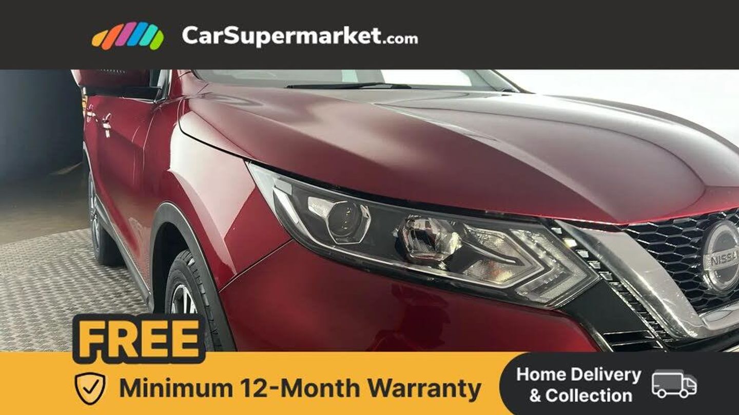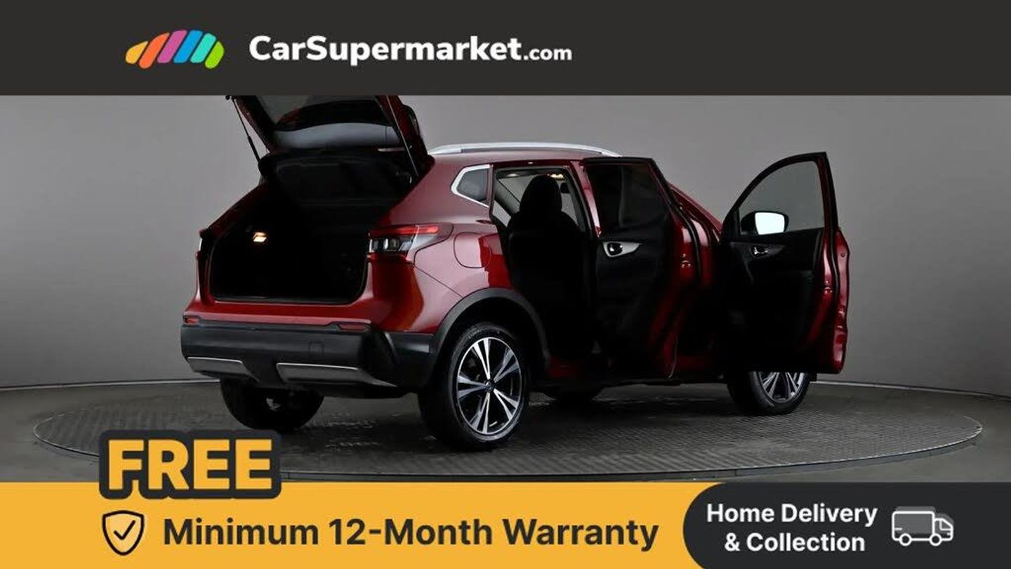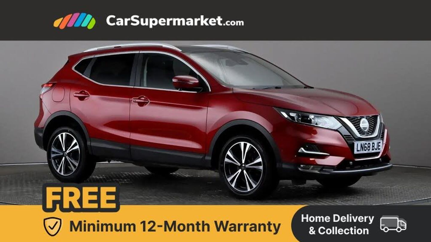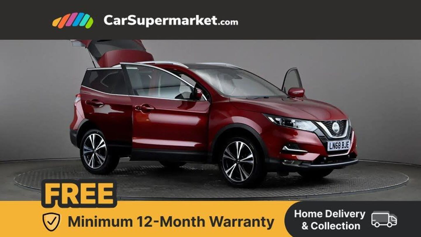 Advanced drive assist display 5'' TFT coloured screen,Bluetooth phone integration system,Cruise control + speed limiter,Electric speed sensitive power steering,Front parking sensors,Intelligent around view monitor,Intelligent parking assist,Lane departure warning system,Nissan connect evo 7" touchscreen navigation and entertainment system,Outside temperature sensor,Push button starter,Rear parking sensors,Rear view camera,Selectable steering,Service interval indicator,Smartphone integration,Stop/start system,Traffic sign recognition,Trip computer,Diesel particulate filter,Nissan chassis control (intelligent ride control, intelligent trace control, intelligent engine brake),6 speakers,Aux-in socket,DAB Digital radio,Radio/CD,Steering wheel mounted audio controls,USB port,Anti dazzle rear view mirror,Auto wipers,Body colour bumpers,Body colour door handles,Body colour door mirrors,Chrome window surround,Daytime running lights dip function when turn signal applied,Electric folding door mirrors,Electric front and rear windows with one touch illuminated window controls,Electric front/rear windows,Electrically adjustable door mirrors,Front fog lights,Halogen headlights,Heated door mirrors,High beam assist,Intelligent auto headlights,LED indicators in door mirrors,Matt silver roof rails,Privacy glass,Rear roof spoiler,Rear wiper,Shark fin antenna,Underbody vortex generators,2 X front 12v power sockets,3 height adjustable rear headrests,60/40 split folding rear seat,Ambient interior lighting,Boot light,Centre console storage box/armrest,Chrome interior door handles,Cloth upholstery,Configurable luggage board system,Driver's seat manual height adjust,Dual zone climate control,Front and rear door pockets with bottle holders,Front and rear seat belt pre-tensioners with load limiters,Front headrests,Height adjustable front headrests,Leather D shaped steering wheel,Leather gear lever,Leather knee pad,Manual height adjustable front passenger seat,Manual lumbar support on driver seat,Manual lumbar support on passenger seat,Monoform front seats with plastic backboard,Parcel shelf stow function under luggage board,Pollen filter,Rear armrest with 2 cupholders,Rear headrests,Synthetic leather wrapped door handle with contrasting stitching,Tilt/telescopic adjustable steering wheel,Safety shield plus pack - Qashqai,6 airbags - Driver, front passenger, curtain and side airbags,ABS, ESP, EBD and brake assist,Auto hold function,Child locks on rear doors,Electronic parking brake,Front and rear seat belt warning,Front passenger airbag deactivation,Height adjustable front seatbelts,Hill start assist,Intelligent emergency braking with pedestrian recognition,Three 3 point rear seatbelts,Tyre pressure monitoring system,Anti-theft immobiliser,Intelligent Key,Remote central locking,Thatcham Cat.1 alarm,Carbon graphite dash trim,Tyre puncture repair kit