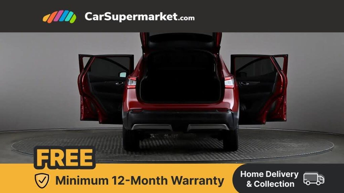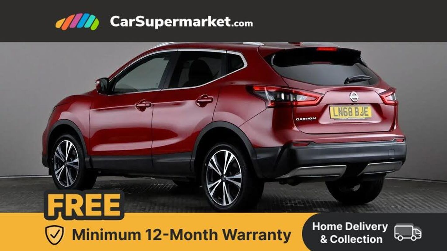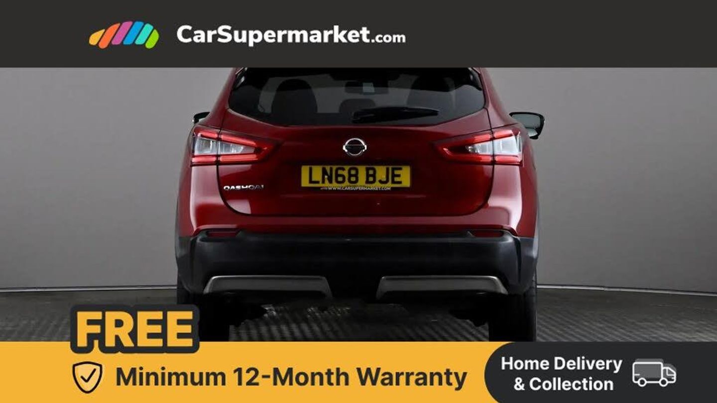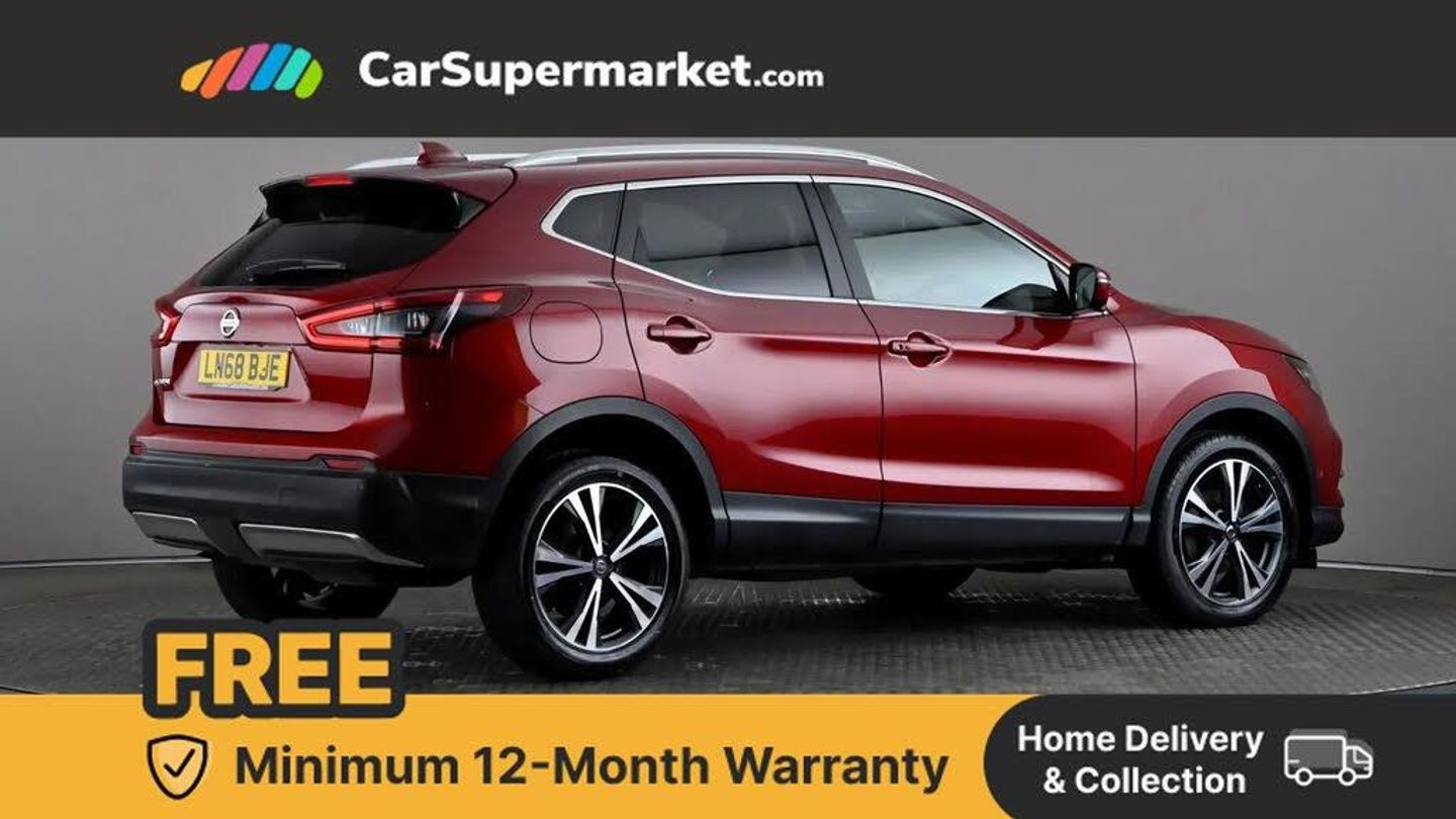 Advanced drive assist display 5'' TFT coloured screen,Bluetooth phone integration system,Cruise control + speed limiter,Electric speed sensitive power steering,Front parking sensors,Intelligent around view monitor,Intelligent parking assist,Lane departure warning system,Nissan connect evo 7" touchscreen navigation and entertainment system,Outside temperature sensor,Push button starter,Rear parking sensors,Rear view camera,Selectable steering,Service interval indicator,Smartphone integration,Stop/start system,Traffic sign recognition,Trip computer,Diesel particulate filter,Nissan chassis control (intelligent ride control, intelligent trace control, intelligent engine brake),6 speakers,Aux-in socket,DAB Digital radio,Radio/CD,Steering wheel mounted audio controls,USB port,Anti dazzle rear view mirror,Auto wipers,Body colour bumpers,Body colour door handles,Body colour door mirrors,Chrome window surround,Daytime running lights dip function when turn signal applied,Electric folding door mirrors,Electric front and rear windows with one touch illuminated window controls,Electric front/rear windows,Electrically adjustable door mirrors,Front fog lights,Halogen headlights,Heated door mirrors,High beam assist,Intelligent auto headlights,LED indicators in door mirrors,Matt silver roof rails,Privacy glass,Rear roof spoiler,Rear wiper,Shark fin antenna,Underbody vortex generators,2 X front 12v power sockets,3 height adjustable rear headrests,60/40 split folding rear seat,Ambient interior lighting,Boot light,Centre console storage box/armrest,Chrome interior door handles,Cloth upholstery,Configurable luggage board system,Driver's seat manual height adjust,Dual zone climate control,Front and rear door pockets with bottle holders,Front and rear seat belt pre-tensioners with load limiters,Front headrests,Height adjustable front headrests,Leather D shaped steering wheel,Leather gear lever,Leather knee pad,Manual height adjustable front passenger seat,Manual lumbar support on driver seat,Manual lumbar support on passenger seat,Monoform front seats with plastic backboard,Parcel shelf stow function under luggage board,Pollen filter,Rear armrest with 2 cupholders,Rear headrests,Synthetic leather wrapped door handle with contrasting stitching,Tilt/telescopic adjustable steering wheel,Safety shield plus pack - Qashqai,6 airbags - Driver, front passenger, curtain and side airbags,ABS, ESP, EBD and brake assist,Auto hold function,Child locks on rear doors,Electronic parking brake,Front and rear seat belt warning,Front passenger airbag deactivation,Height adjustable front seatbelts,Hill start assist,Intelligent emergency braking with pedestrian recognition,Three 3 point rear seatbelts,Tyre pressure monitoring system,Anti-theft immobiliser,Intelligent Key,Remote central locking,Thatcham Cat.1 alarm,Carbon graphite dash trim,Tyre puncture repair kit