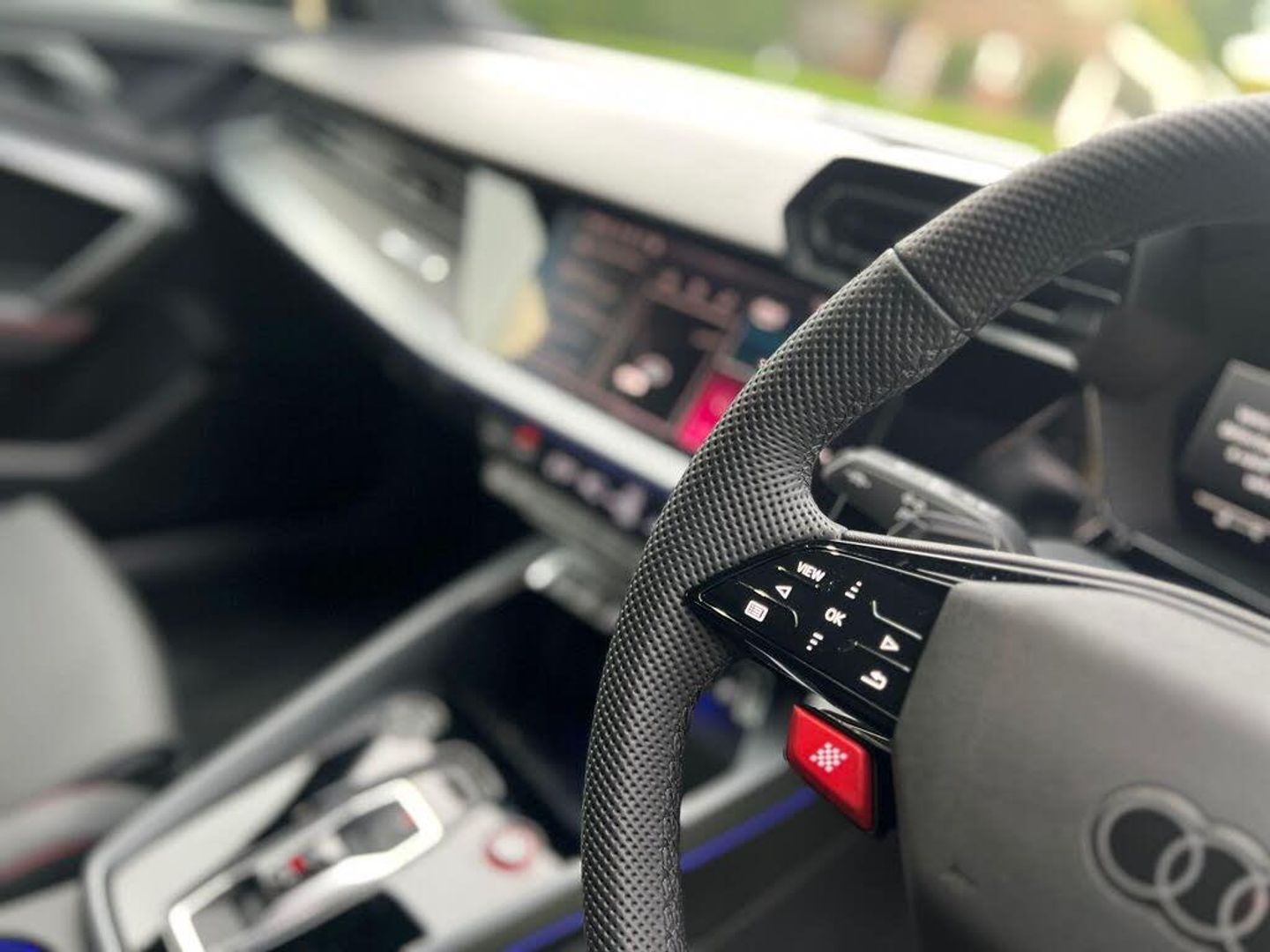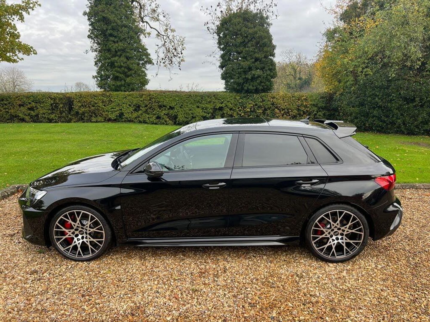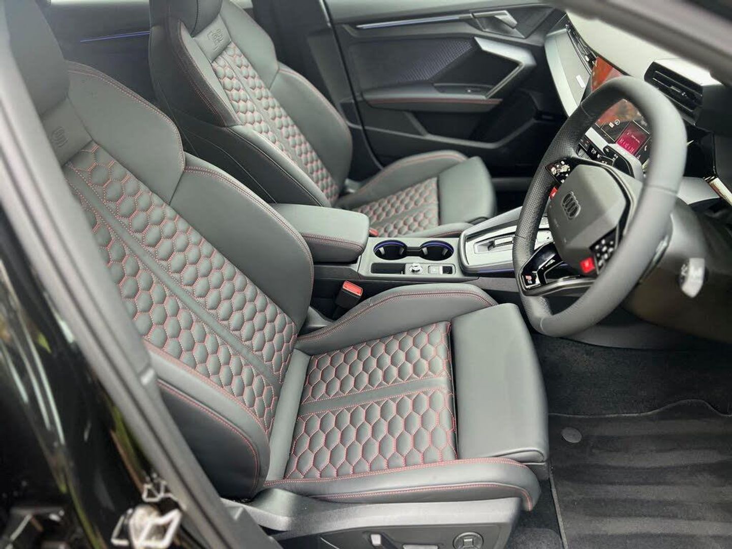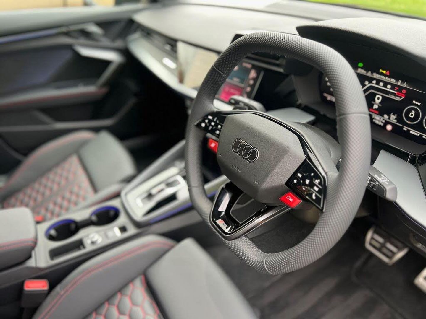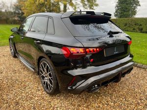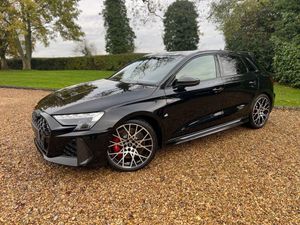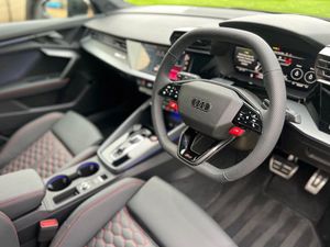 12v Socket and Storage Compartment in Front Centre Console, 19in Alloy Wheels - 10-Cross-Spoke Black Metallic, 3-Zone Deluxe Automatic Air Conditioning, 4-Way Lumbar Support for Front Seats, Adaptive Suspension with Audi Drive Select, Airbags - Driver and Front Passenger with Passenger Airbag Deactivation, Ambient Lighting Package Pro, Anti Theft Locking Wheel Bolts, Anti-Theft Alarm, Audi App Store and Smartphone Interface, Audi Beam, Audi Connect Navigation and Infotainment Services Plus (3 Year Subscription From New), Audi Phone Box with Wireless Charging, Audi Pre-Sense Front, Audi Virtual Cockpit with RS Specific Design and 12.3in Display, Auto Dimming and Frameless Rear View Mirror, Automatic Start-Stop System with Recuperation, Black Styling Pack Plus, Camera Based Traffic Sign Recognition, Carbon Door Mirrors, Carbon Roof Spoiler, Cloth Headlining in Black, Collision Avoidance Assistant, DAB Digital Radio, Distraction and Fatigue Warning, Door Mirrors - Electrically Adjustable - Heated - Folding - Automatically Dimming with Memory Function and Integrated LED Indicators with Kerb View Function for Passenger Side, Door Sill Trims with RS3 Logo, ESC - Electronic Stabilisation Control inc ABS - ASR and EDL, Electrically Adjustable Front Seats with Memory Function for Drivers Side, Electronically Operated Child Locks, Emergency Call - E-Call, Engine Compartment Cover with Carbon Trim, First Aid Kit and Warning Triangle and 2 Safety Vests, Front Centre Armrest, Front Side Airbags with Head Airbags and Interaction Airbag, Front Sports Seats, Front and Rear Floor Mats, Heated Front Seats, Hill Hold Assist, I-Size and Top Tether Child Seat Mounting for the Outer Rear Seats, Inlays - Carbon Atlas Structure, Interior Accents in Vanadium Look, Lane Departure Warning, Light and Rain Sensor, MMI Navigation Plus with High Resolution 10.1in Touchscreen Colour Display, Manual Boot Compartment Lid, Model Badging - Exterior, Panoramic Sunroof, Parking Assist with Parking System Plus, Pedals in Stainless Steel and Footrest in Black, Privacy Glass, Progressive Steering, RS Exterior Features in Carbon - Gloss Black, RS Sport Exhaust System, RS Steel Brakes with Black Calipers with RS Logo, Remote Central Locking with Safelock, Seat Belt Monitoring, Speed Limiter - Adjustable, Split Folding Rear Seat Bench - 60-40 or Fully, Steering Wheel - Flat Top and Bottomed 3-Spoke Black Leather Multifunction with Shift Paddles in Vanadium Look - Rhombus RS Logo, Storage Package, Technology Pack, Technology Pack Pro, Tool Kit, Top Speed Restriction Increase to 174mph, Tyre Pressure Loss Indicator, Tyre Repair Kit, USB Ports with Charging Function in Rear, Brake Calipers - Red