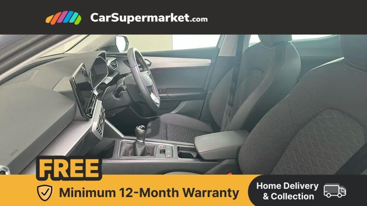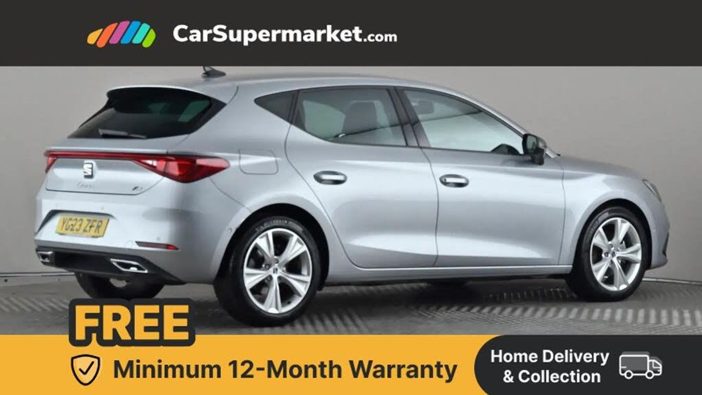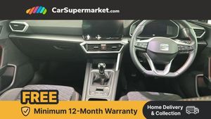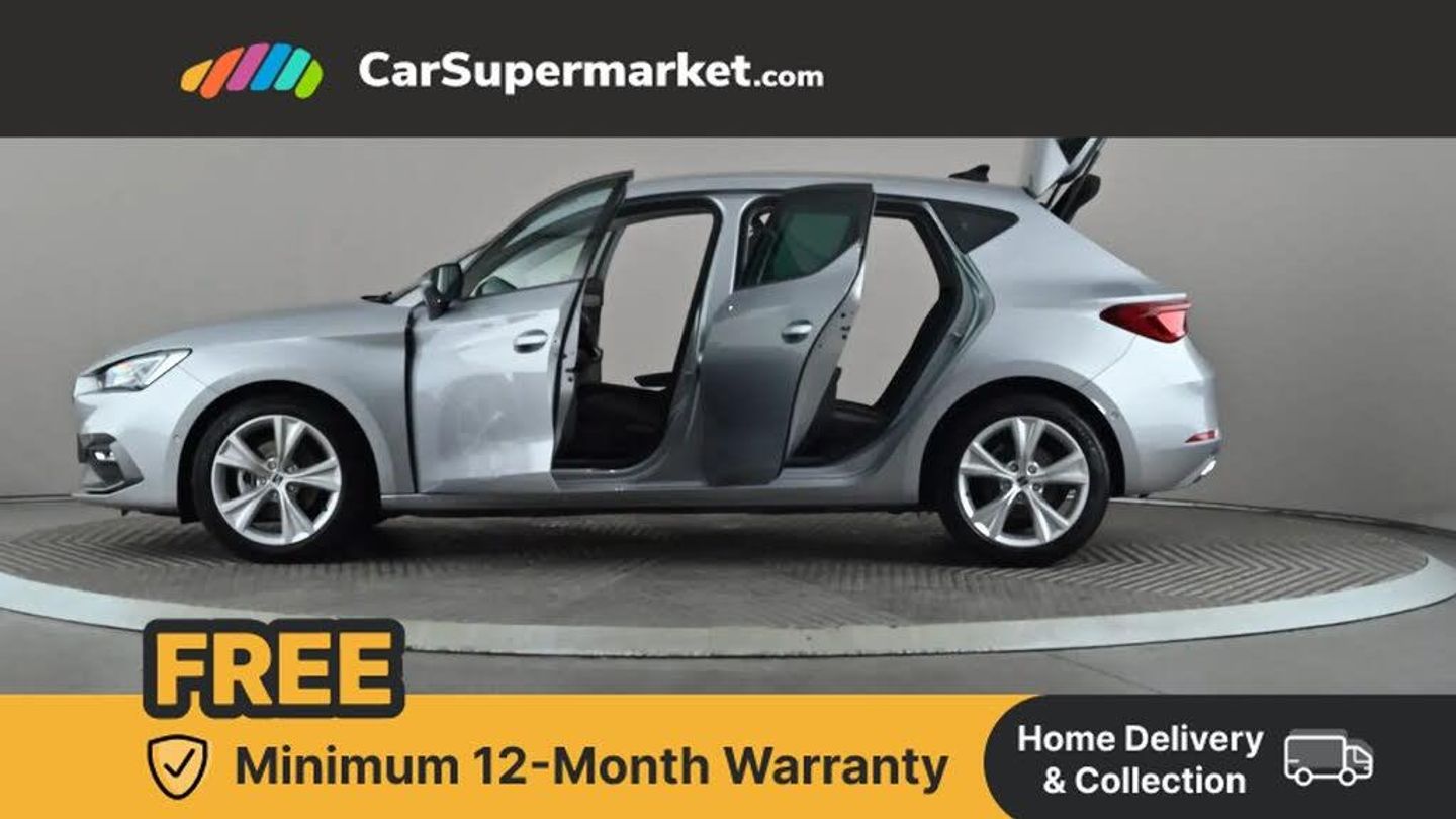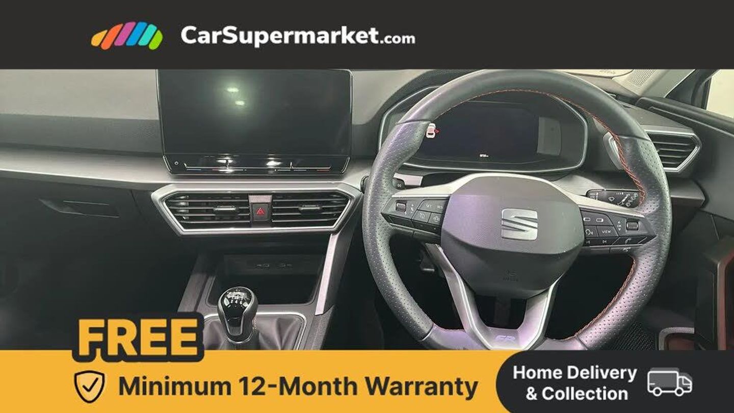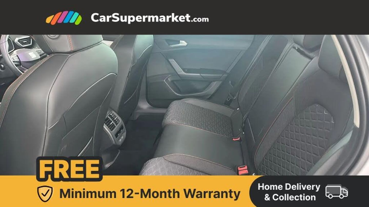 Digital cockpit,E-call,Four x USB Type C ports,Front assist with forward collision warning braking reaction to vehicles, pedestrians and cyclists,Full link smartphone integration with Mirror Link, wireless Apple CarPlay and wired Google Android Auto,Lane assist,Lockable tailgate,Park assist (inc front/rear parking sensors),Power assisted speed sensitive electro-mechanical steering,RPM, trip computer, outside temp gauge, instrument light brightness, low fuel warning light, lights on reminder, gearshift indicator,SEAT drive profile with 4 modes (Eco/Normal/Sport/Individual), throttle response,Service interval indicator,Start/stop system with regenerative braking,Sports suspension,XDS electronic differential lock and dynamic traction support,7 speakers,Auxiliary input socket,Auto dimming rear view mirror,Body colour door handles,Body coloured bumpers,Cosmo grey exterior mirrors with integrated LED indicators,Dark tinted rear windows,Dynamic headlight range control,Electric front/rear windows,Electrically adjustable, heated and folding door mirrors,FR sports bumper,Illuminated front door sill,LED front fog lamps with cornering function,LED Headlights with dynamic turn signals, LED tail lights and rear fog lights with rear coast to coast lighting,Rain sensing wipers,Rear side wing doors,Rear wash/wipe,Separate daytime running light with automatic headlight control and coming home feature,Third brake light,Welcome light silhouette from exterior mirrors,12v power point in centre console,3 seat bench in 2nd row,60/40 split rear bench seat with armrest,Ambient lighting with glovebox, footwell and single monocolour,Driver/passenger manual seat height adjustment,Dust/pollen filter,Flat bottomed perforated leather steering wheel with red stitching and FR logo and leather gear stick,Folding boot cover,Front and rear height adjustable headrests,Front and rear reading lights X 4,Front centre armrest,Front seatback storage pockets,Height/reach adjust steering wheel,ISOFIX points in outer rear seats with top tether anchorage points,Luggage tie-down hooks,Lumbar adjustment for front seats,Single front passenger seat,Sunvisors with covered illuminated mirror,Three zone climate control,Two tone cloth upholstery,Media system plus with navigation - Leon,3 point seatbelts on all rear seats,ABS,Brake control system - ESC and brake booster,Child proof door locks,Driver and front passenger airbags with front passenger airbag de-activation, front side and curtain airbags,Electronic parking brake,Extended safety system - seat belt tensioner, window closure and hazard lights,Hill hold control,Rear disc brakes,Seat belt reminder for front and rear seats,Tiredness recognition system, driver alert system,Tyre pressure monitoring system,Anti theft alarm system with interior monitoring in cab, backup horn and towing protection,KESSY Go (Keyless start),Locking wheel bolts,Wireless phone charging,Chrome interior detailing,17" Dynamic Bi-spoke alloy wheels with 91W tyres,Tool kit