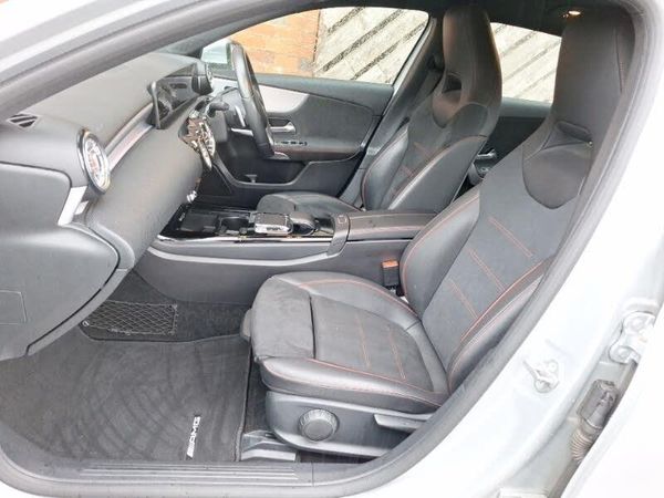 Cruise control, LED daytime running lights, LED Headlights, Rear parking sensor, Speed limiter, Steering wheel audio controls, Warning lamp for direction indicators, Voice control system, Trip computer, Stop/start system, Speed sensitive power steering, Service indicator (ASSYST PLUS), Reversing camera, Radio aerial integrated into roof spoiler, Mercedes connect me with remote online services, Low fluid warning light, External temperature gauge, 10.25" Digital instrument cluster display screen, 10.25" media display, Active lane keep assist, Active park assist with parktronic system, Attention assist, Bulb failure indicator, Direct steering, Cruise control + speed limiter, Lowered comfort suspension, Mid-range sound system, MBUX Multimedia system including digital instrument cluster and phone mirroring, DAB Digital radio, 2 USB ports in centre console, Twin Trapezoidal tailpipes, Rear wiper, Rear fog lights, Rain sensor windscreen wipers, LED rear lights, LED Headlights, LED daytime running lights, High level third brake light, Electric folding door mirrors, Electric front windows, Electric rear windows, Headlamp assist, Chrome beltline trim, Body coloured door mirrors, Body colour side skirt, Auto dimming rear view mirror, Auto dimming driver's door mirror, AMG body styling, Adaptive brake lights, Twin front cupholders, Touchpad, Storage compartment under load area floor, Rear head restraints, Multifunction steering wheel, Oddments tray lighting, Luggage compartment cover, Load securing rings in luggage compartment, Isofix rear child seat preparation, Interior lighting - 64 colour Ambient lighting, Integrated head restraints, Illuminated storage compartment, Illuminated glovebox, Illuminated door sills, Illuminated cup holders, Front seat backs luggage nets, Front head restraints, Front sport seats, Front centre armrest with storage compartment, Front and rear reading lights, Footwell lights, Exit lights, Auto Mercedes-Benz child seat recognition sensor, 12V socket, 1/3 to 2/3 split folding rear seats, 3 spoke flat bottomed nappa leather sport steering wheel, AMG floor mats with red stitching, Artico man-made leather/Dinamica upholstery, Controller on centre console with chrome surround, Dual zone automatic climate control, Seat comfort pack - A Class, Window airbags, Warning triangle and first aid kit, Hill start assist, Front side airbags, Front passenger seat occupancy sensor, Front head airbags, Front and rear seatbelt reminder, ESP with ASR, Electronic parking brake, Dual stage driver/passenger airbags, Drivers knee airbag, Crash responsive emergency lighting, Child proof door locks, Brake calipers with Mercedes-Benz lettering + perforated brake discs, Active bonnet, ABS with Brake Assist, 3 rear 3 point seatbelts, Remote central locking, Keyless Go access/ignition system, Alarm system/interior protection/immobiliser, Chrome air vent surrounds, 18" AMG 5 twin spoke light alloy wheels in titanium grey with highsheen finish, Tirefit sealant with electric air pump